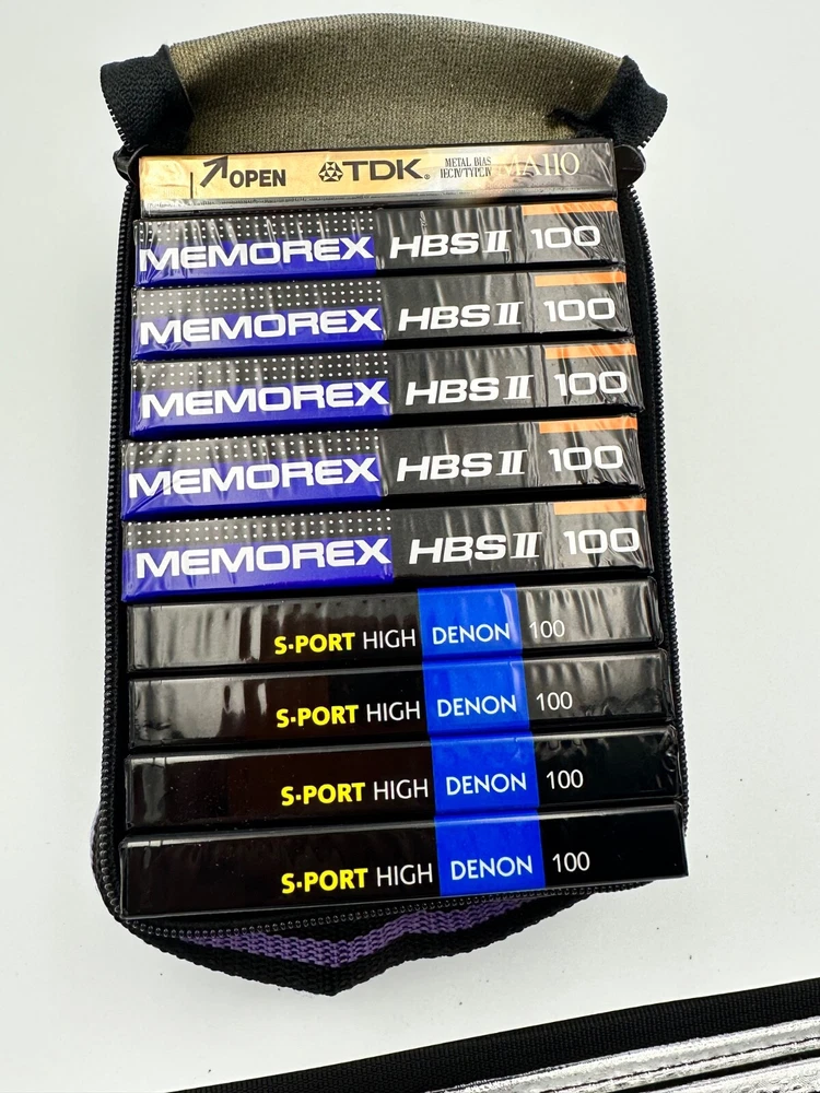 Elevate your audio experience with this set of 10 new and sealed cassette tapes, featuring renowned brands such as TDK, Memorex, and Denon. The lot includes the S-Sport series, ensuring high-quality sound for your listening and recording needs. Each cassette is meticulously crafted to provide you with a reliable and exceptional audio tape every time.Whether you're into music production, podcasting, or simply looking to enjoy your favorite tunes on cassette, this collection is perfect for you. The tapes come in a pristine, sealed condition, guaranteeing their integrity and performance. Add these cassettes to your audio arsenal and enjoy the classic feel of analog sound. With Memorex vintage carry case.