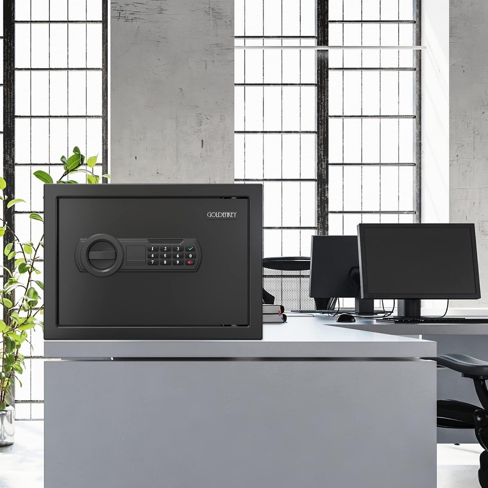 ✅【Enhanced Security】Our safe box is built with high-strength SPCC steel, featuring a reinforced thick door, two 20mm bolts, and concealed pry-resistant hinges. This combination ensures superior durability and reliable protection for your most valuable belongings. ✅【1.0 Cu.Ft. Capacity】With a spacious 1.0 cubic feet of storage this, safe box offers plenty of room for important documents, jewelry, guns, and other valuable items. The removable shelf allows for flexible storage, while the anti-scratch carpet protects your items from damage. ✅【User-Friendly Operation】Our safe offers 2 versatile unlocking methods for added convenience and security. You can use the key and knob for straightforward access or set 2 distinct and independent passwords via the digital password entry knob. This unique feature provides flexibility and ensures a secure, user-friendly experience. ✅【Convenient Installation Options】Measuring 9.84" D x 13.78" W x 9.84" H, our safe can be easily mounted in your home or office. It comes with pre-drilled holes on the back and bottom of the box, along with expansion screws for simple wall or floor installation. ✅【Package&Service】The package includes 1 safe box, 2 emergency keys, 4 mounting bolts, 1 scratch-resistant carpet, and a user manual. At , we offer 24/7 customer support to promptly assist with any questions or concerns. Trust our safe to protect your valuables with enhanced security features and ease of use.