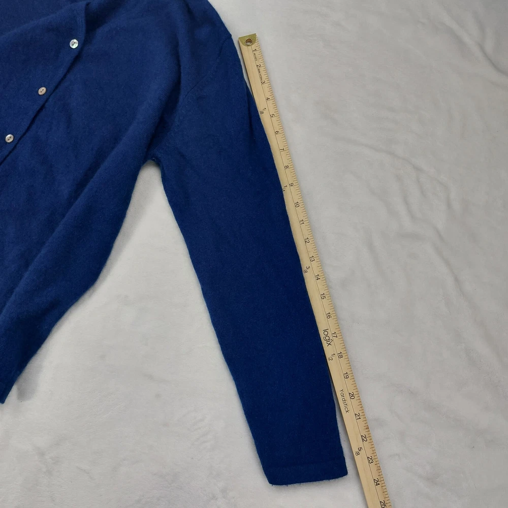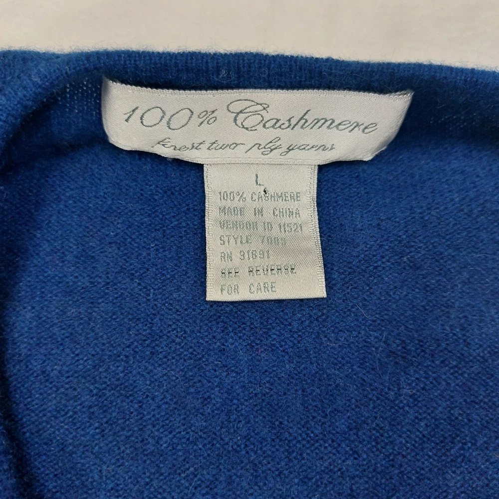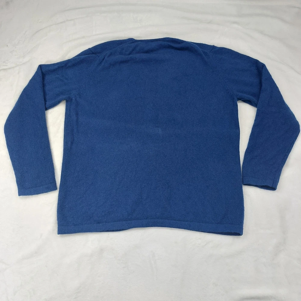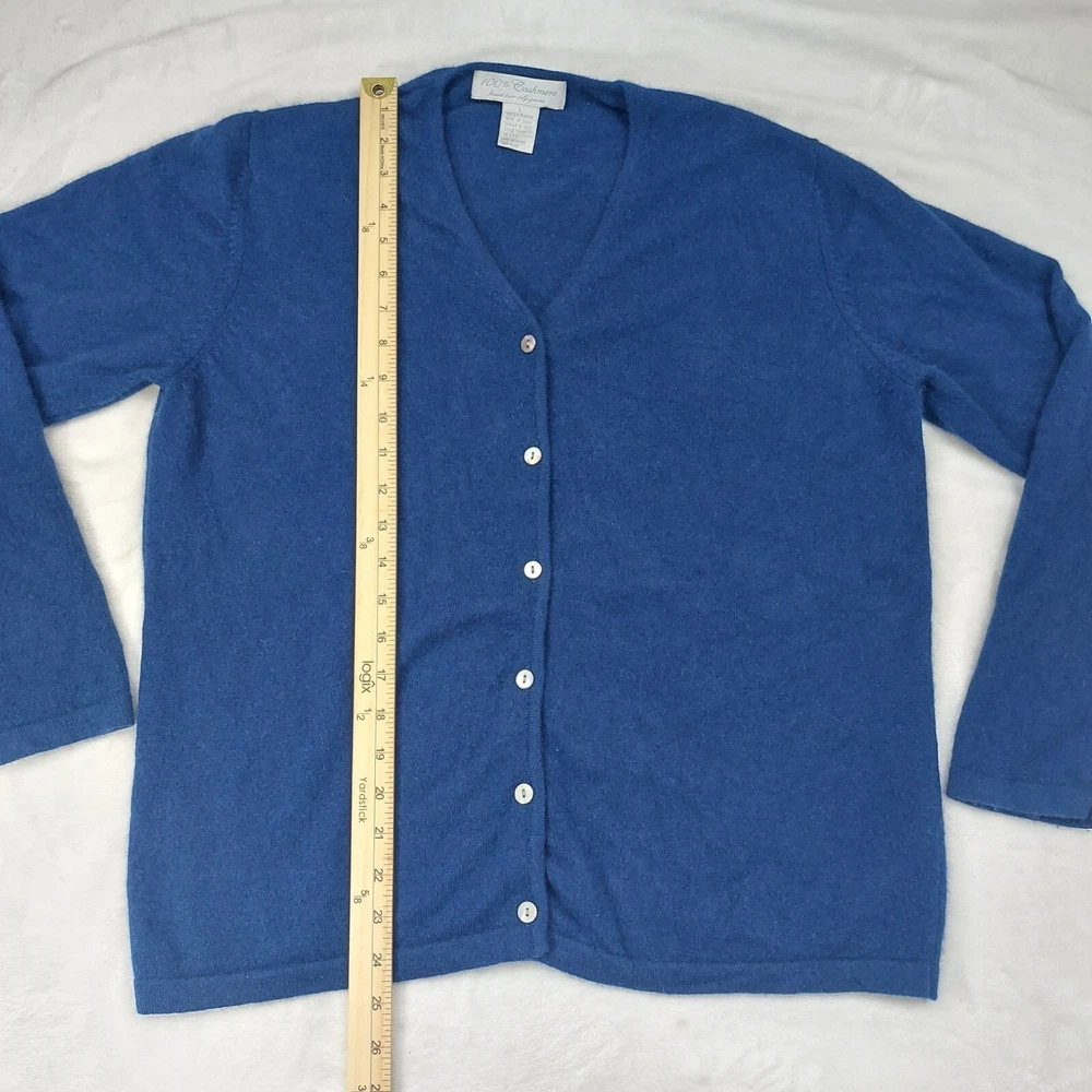 100% CASHMERE WOMENS BLUE 2 PLY YARNS V-NECK LONG SLEEVE ACADEMIA CARDIGAN SIZE LARGE. V-NECK. LONG SLEEVE. BUTTON FRONT. SMALL HOLE NOTED AND SHOWN IN PHOTOS. MEASUREMENTS PROVIDED. Items ship from a pet friendly home. *Items ship from a smoke-free home. *Colors may vary due to lighting. *Please read descriptions. Any flaws will be noted and photographed. *I source my inventory from multiple sources. I can not speak on fit for items. I try to provide photos of measurements when possible to assist in fit. *Clothing items are laundered, inspected, and sealed in plastic bags after photos are taken. This ensures you receive the item in the condition it was photographed in. Due to this process, additional details and measurements can not be provided. *Reasonable offers considered. *If you have any questions, please ask. Buyer is responsible for reviewing all photos and descriptions for condition details. Although I do my best to find and disclose any flaws, there may still be flaws present that were missed unintentionally in human error.