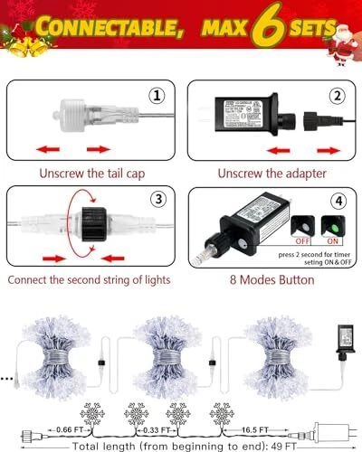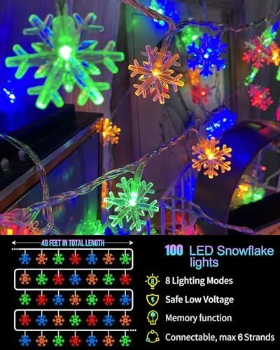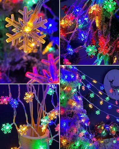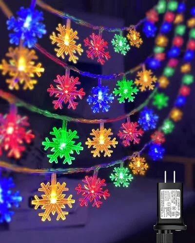Return Policy Fast Delivery Trusted seller 100 LED Christmas Snowflake Lights, 32ft Snowflake Fairy String Lights Indoor, 8 Modes Plug in Christmas String Lights, Waterproof Xmas Light for Christmas Decorations, Xmas Tree, New Year(Multicolor) Product Description Upgrade Christmas Snowflake Lights - 100 led Snowflake fairy string lights for Christmas indoor outdoor decorations,our transparent wire snowflake lights can perfectly intergrated with home, trees and make your yard/garden looks more natural at daytime,snowflake string lights size 32ft 8 Lighting Modes & Memory Function - This Christmas lights have 8 different modes: Steady on, Wave, Sequence, Chase, Flash, Flash/Flash, Slow Flash and Slow fade,Each mode is so different and having that option is great as each night mode is different,you only need to press the button on the adapter to chose what you love. A built-in memory chip automatic saves your last mode setting without having to reset the mode every day Waterproof Christmas Decorations Lights - Our Christmas snowflake lights are IP44 waterproof,It's perfect for Christmas indoor outdoor decorations,No need to worry about bad weather (Note:The adaptor is not waterproof, please keep the adaptor away from water) UL 588 & Connectable Chrismtas Tree Lights - The snowflake fairy Christmas lights has passed the authoritative UL588 safe certification.The output voltage of the Christmas decorative window lights is 30V,safety voltage for human body.End to end connectable,max 6 sets,allow you to decorate your lighting area with the desired length Widely Use - This Christmas string lights perfect for Christmas decorations,home, Garden, Wall, Window, Christmas, Party, Wedding etc,also great for Christmas, party, Valentine's day, wedding, Home, Window, Bathroom, thanksgiving day, holiday, shows, restaurant, hotel, commercial building decoration Shipping Returns Payment Shipping Shipping is FREE to all addresses other than APO/PO boxes in the lower 48 states. All our stock ships from US-based warehouses. Shipped via USPS or UPS (depending on location and package weight) Unless stated otherwise, all orders will ship within 24-72 hours of your payment being processed. Check our feedback to see the great reviews of FAST shipping we offer. Returns Seller does not accept returns Payment We currently accept payment via eBay managed payments only. Once payment is cleared, we will dispatch your shipment within 1-3 business days. Please refer to the "Shipping" tab for more information regarding shipping speed to your destination.