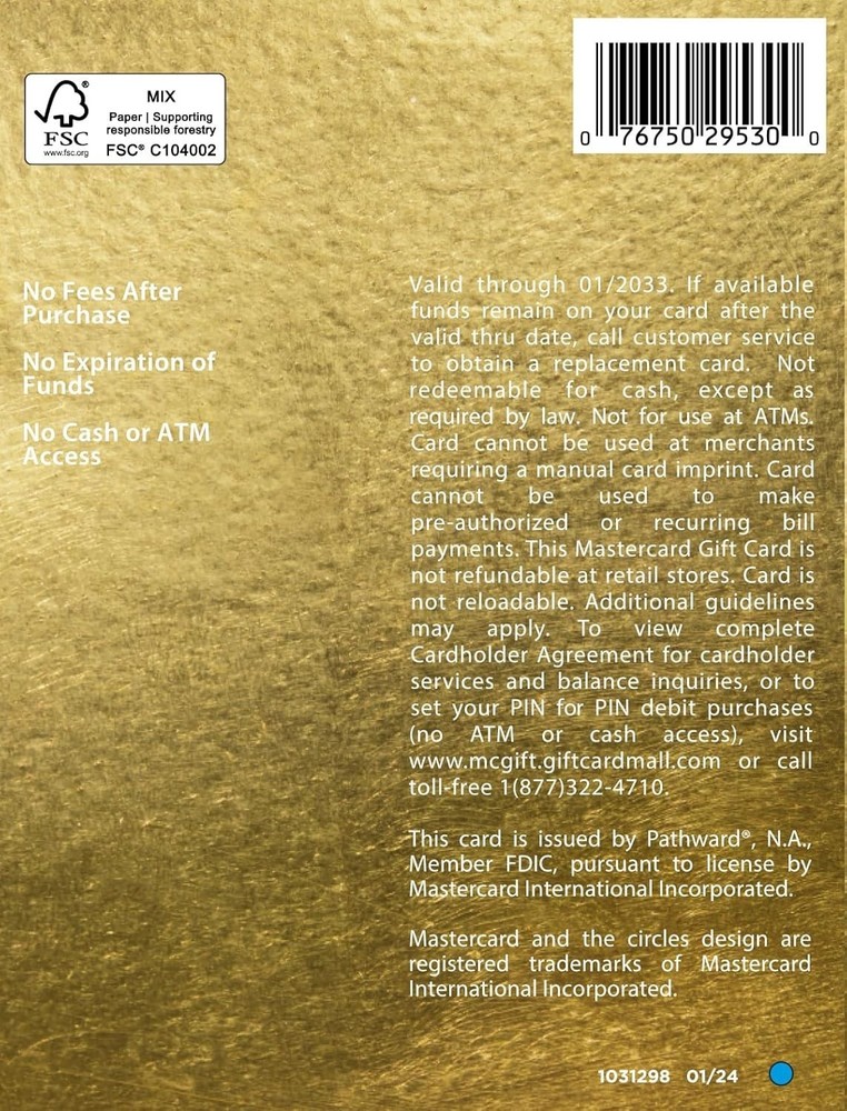 Brand Mastercard Gift Card Redemption Type Physical and Digital Gift Card Validity Period Indefinite Gift Card Usage In-store and Online (U.S. only) Gift Card Ineligible Items True About this item This card is non-reloadable. No expiration of funds. NO cash or ATM access. Cards are shipped ready to use. Use your Mastercard Gift Card in the U.S. everywhere Mastercard debit cards are accepted, including online. Balance cannot be used to purchase Visa gift cards. A one-time $4.95 purchase fee applies at the time of purchase. No fees after purchase (including dormancy, service or other fees). This item is not eligible for refund, resale, or return. Available for sale within the United States only (not available to residents of Puerto Rico). Additional shipping restrictions apply to Hawaii, Kansas, New Mexico, South Dakota, US Virgin Islands, Vermont, and West Virginia. Do not provide any gift card details (such as the claim code) to someone you do not know or trust. There are a variety of scams in which fraudsters try to trick others into paying with gift cards. We want to make sure our customers are aware of potential scams that may involve asking for payment using gift cards. See "Be Informed" link at the top of the page to learn more.