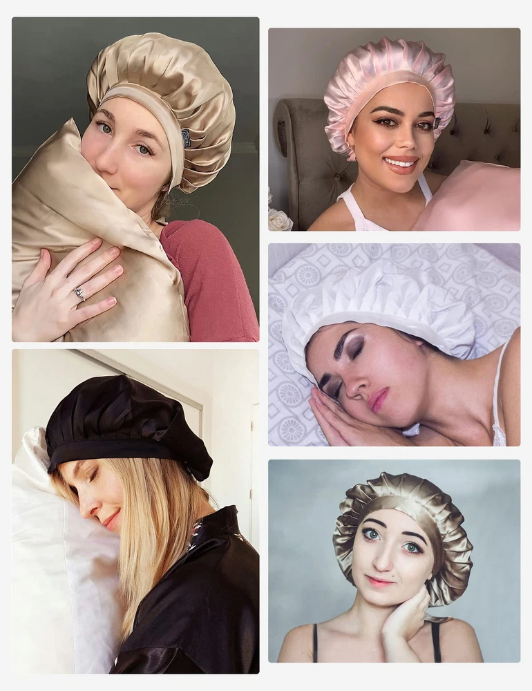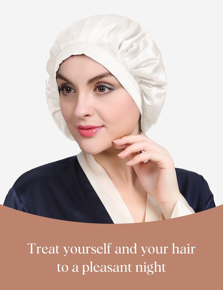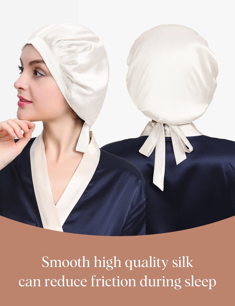 ✅100% PURE MULBERRY SILK NIGHTCAP: Both inside and outside of this Silk Sleep Cap is made of 6A Grade 100% pure mulberry silk. Silk has lowest frictional irritation to human's skin among all kinds of fibers, Providing Comfort and Aids in Hair Regrowth. BREATHABLE silk are widely acknowledged as 'human's secondary skin' and lauded as 'Queen of fibers'. It stays on all night and light as a feather. ✅SUIT FOR BOTH LONG & SHORT, THICK & THIN HAIR: Size: 22.4’’ - 24’’ (57-61cm). We make the size based on thousands of tests and one size would fit most people (durable adjustable elastic drawstring with silk ribbon through button hole on both sides of cap allows you to adjust the cap to your level of comfort). ✅PREVENTS HAIR LOSS & NO FRIZZY HAIR: Retains the moisture in your hair and doesn't dry them out, helps re-growth and not break while sleeping. Keeps your hairstyle fresh looking, and prevents loss of hair and wake up with no frizz/bed head just like silk pillowcases. ★We made the silky side on the outside to make the nightcap look better. The inside may not have the silky luster like the outside, but it is also pure silk. You can pull out some threads to have a test. ✅FLAT DESIGN ON FRONT, NO TRACE LEFT ON FOREHEAD: If you have curly hair and sleep with this cap, going to work without doing anything to your hair besides take the cap off; no more tight on head with adjustable bands; no red lines on forehead with flat design on forehead part; extremely light and easy to carry on travel; covered in this silk cap, your hair still can breathe! ✅PACKED IN BEAUTIFUL DECENT BAG PACKAGE: Beautiful Gift Bag Packed; A Sweet Gift for Wife, Mother, Girlfriend or Just Treat Yourself for coming Thanksgiving, Christmas and New Year! Silk Cap is Soft but Strong Enough to Stand up to Frequent Washing. Hand or Machine Wash in Cold Water on Gentle Cycle. Hang to Dry.