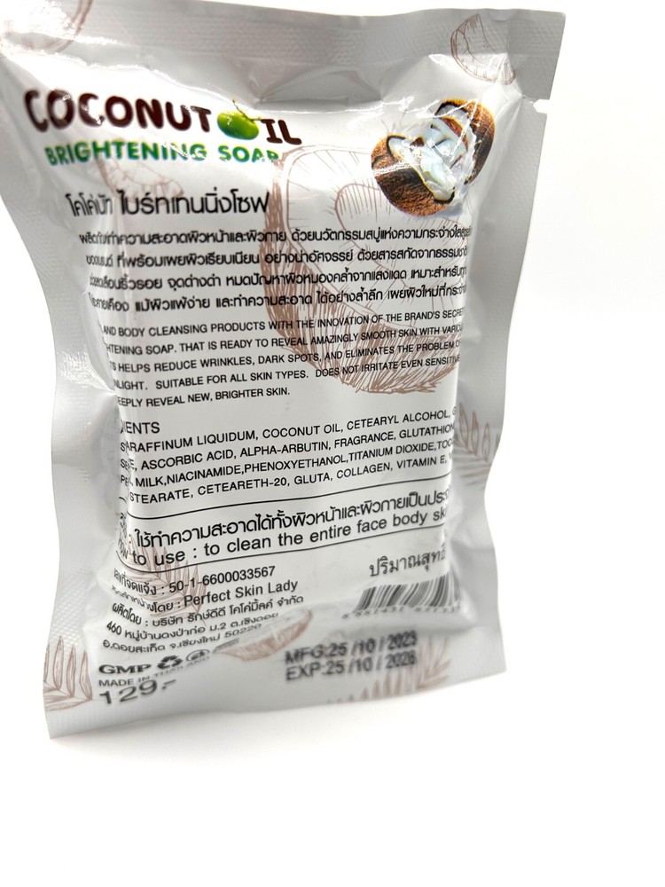 Coconut Oil Brightening Soap – Nourishing Skin Care Indulge your skin with the luxurious benefits of our Coconut Oil Brightening Soap. Crafted with pure, organic coconut oil, this soap gently cleanses while providing deep hydration. Ideal for all skin types, including sensitive skin, it helps brighten your complexion, leaving your skin feeling soft, smooth, and refreshed. Key Features: Brightening Formula : Designed to help even out skin tone and enhance your skin's natural radiance. Gentle & Hydrating : Perfect for daily use, it deeply hydrates without stripping your skin of its natural oils. Suitable for All Skin Types : Whether you have dry, oily, or sensitive skin, this soap is a gentle and effective choice. Benefits: Helps brighten dull, uneven skin Moisturizes and softens the skin Suitable for face and body use Antioxidant-rich to protect your skin from damage How to Use: Lather the soap with water and gently massage onto damp skin, creating a rich foam. Rinse thoroughly and follow with your favorite moisturizer for best results. Use daily for smooth, glowing skin.