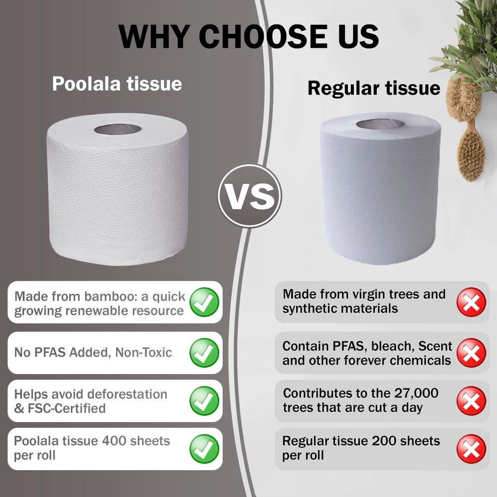 ULTRA-SOFT 3-PLY CUSHIONING COMFORT - Experience the luxury of ultra-soft, 3-ply bamboo toilet paper rolls that offer superior cushioning. Our toilet paper 3 ply is designed to provide maximum comfort and absorption, ensuring a gentle and effective clean every time. Say goodbye to harsh and flimsy toilet paper rolls and upgrade to a more comfortable bathroom experience. EXTRA-LONG ROLLS WITH 400 SHEETS - Each roll of bulk toilet paper rolls boasts an impressive 400 sheets, three times the length of an average roll. Enjoy fewer roll changes and more convenience with these extralong bathroom tissue toilet papers that keep you stocked up longer. Perfect for busy households, commercial use, or anyone who values convenience and quality! COMPACT 38MM CORE DESIGN - The innovative 38mm core design allows each roll of this septic safe toilet paper to have three times as many sheets as an average roll while maintaining a standard size. This ensures that it fit perfectly on most toilet paper holders, providing convenience without the bulk. Enjoy high-capacity toilet tissues rolls that save space and reduce the frequency of roll changes. 100% RENEWABLE & CHEMICAL-FREE BAMBOO - Our ultra soft toilet paper are made from sustainable, fast-growing bamboo, ensuring an ecofriendly and durable option. Free from harmful chemicals including inks, dyes, scents, and BPA, they are perfect for sensitive skin and allergies. Choose for a greener, safer, and gentler bath tissues toilet paper without compromising on quality. PREMIUM ABSORPTION, STRENGTH & COMFORT - These jumbo toilet paper rolls feature a premium fiber construction for exceptional absorption and strength, with an embossed texture that ensures a sturdy, reliable clean. Luxuriously soft and 3X thicker than leading brands, each chemical free toilet paper has three cushiony layers for ultimate comfort. Trust for a superior and comfortable bathroom experience. VALUE PACK & WORRY-FREE GUARANTEE: At such an excellent price, you'll get a pack of not just ONE but SIX Top-Quality Organic Bamboo Toilet Paper Rolls, each with an impressive 400 sheets. We have full confidence in the quality of 3 ply toilet paper. However, if they don't meet your expectations or if you have any questions or concerns, please feel free to reach out to us. We're here to help!!