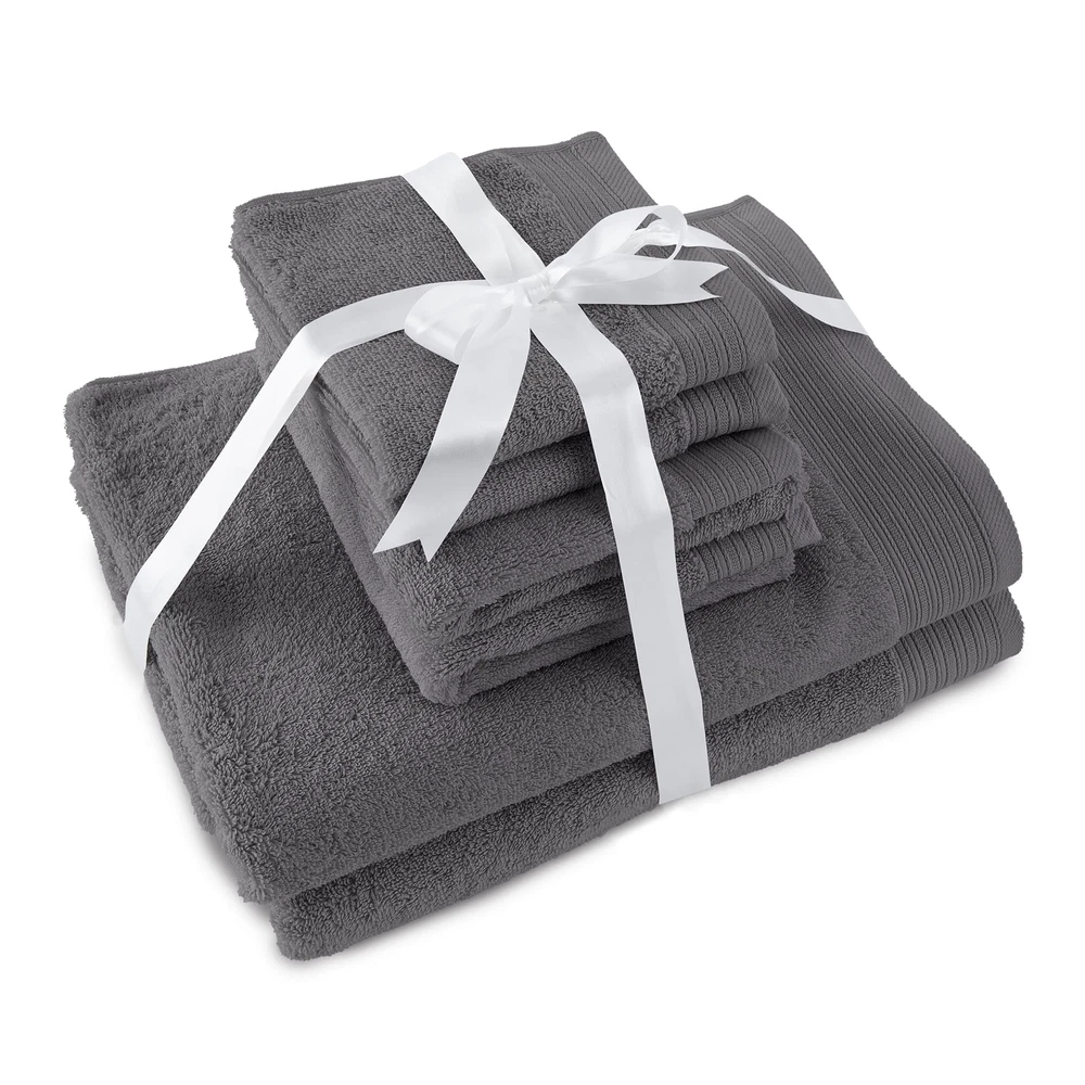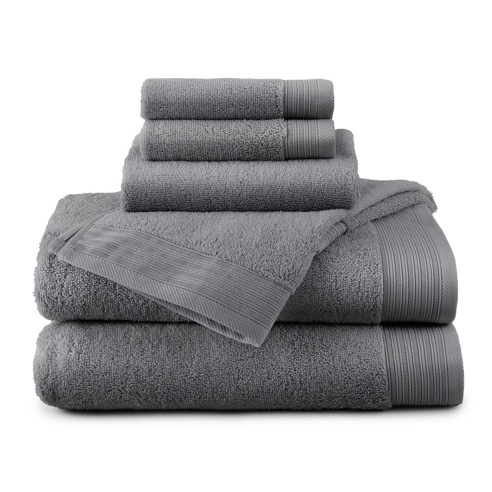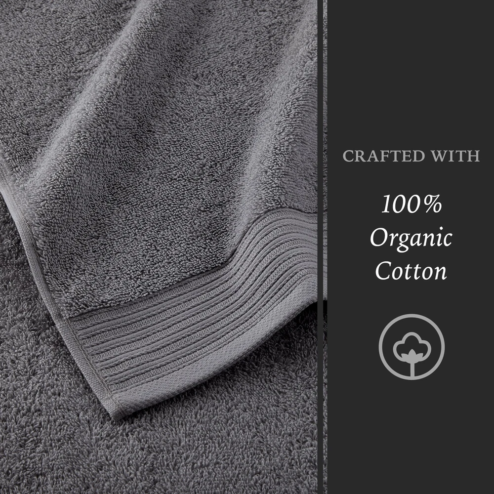 6-PIECE SET INCLUDES: 2 bath towels 30x56, 2 hand towels 16x28, 2 washcloths 13x13 PREMIUM QUALITY: Crafted from responsibly sourced 100% organic cotton FADE RESISTANT: Designed to maintain whiteness wash after wash COMPLETE SET: Comes wrapped beautifully with a ribbon, making it perfect for gifting WASHCARE: Machine wash warm, normal cycle. Do not bleach. Tumble dry low. 6-PIECE SET INCLUDES: 2 bath towels 30x56, 2 hand towels 16x28, 2 washcloths 13x13 PREMIUM QUALITY: Crafted from responsibly sourced 100% organic cotton FADE RESISTANT: Designed to maintain whiteness wash after wash COMPLETE SET: Comes wrapped beautifully with a ribbon, making it perfect for gifting WASHCARE: Machine wash warm, normal cycle. Do not bleach. Tumble dry low. Indulge in spa-like luxury with the Organic Cotton 6-Piece Towel Set in charcoal sky. Made from 100% organic cotton, these premium towels offer superior softness and extra absorbency. Designed to resist fading, these towels will maintain their color after multiple washes. Pair with coordinating Organic Cotton Bath Rugs for a complete look. On Jul 15, 2025 at 01:46:13 PDT, seller added the following information: