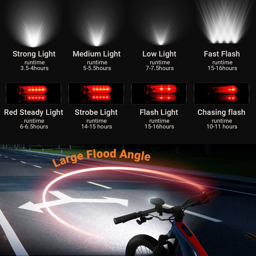 ⚡ SUPER BRIGHT AND SAFETY RIDING - The bike headlight use two XM-L2 LED beads,up to 1000 Lumens which is highly visiable even in dark outdoor,illuminate a pretty wide range,the angle up to 160°.The free bonus rear light is also bright and call attention to other riders and car drivers.Waterproof bike light set are not for Night Only,around 80% of cycling accidents occur in daylight!! ⚡ 4000mah Battery & USB Recharge: Our bike front light has a 4000mA rechargeable battery that can safely and quickly charge devices with USB port, such as PC, power bank, etc. The duration of bicycle front light: high brightness - 3.5h, medium - 5.5h, low - 7h. With an intelligent design to remember the remaining battery. The duration of bike rear light: constant brightness 4h, flashing 12h, fast flashing 6 hours, slow flashing 1h. ⚡ DURABLE AND WATER RESISTANT - Our bike headlight choose air aluminum alloy materials. durable more than you thought. also run long time, in high light run 4 hours, in middle light in 6 hours, in low light run 8 hours.Water resistant rated even to IPX5,which means protected against splashing water from any angle.It's best choice for rider to adventure or night practice, no matter what whether. ⚡ VERSATILE AND EASY TO INSTALL - Installs and detaches in under 15 seconds with NO tools required. bike light for night riding, camping, walking, home or office power failure ect. The bike light front and back is so bright that backs off darkness. ⚡ 100% SATISFACTION GURANTEE - Feel free to contact us, if you received is defective or you are not completely satisfied with our bike light set, we will reply you and solve it as soon as possible,hope have a nice shopping experience.