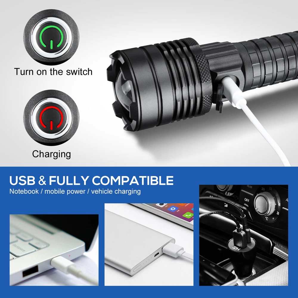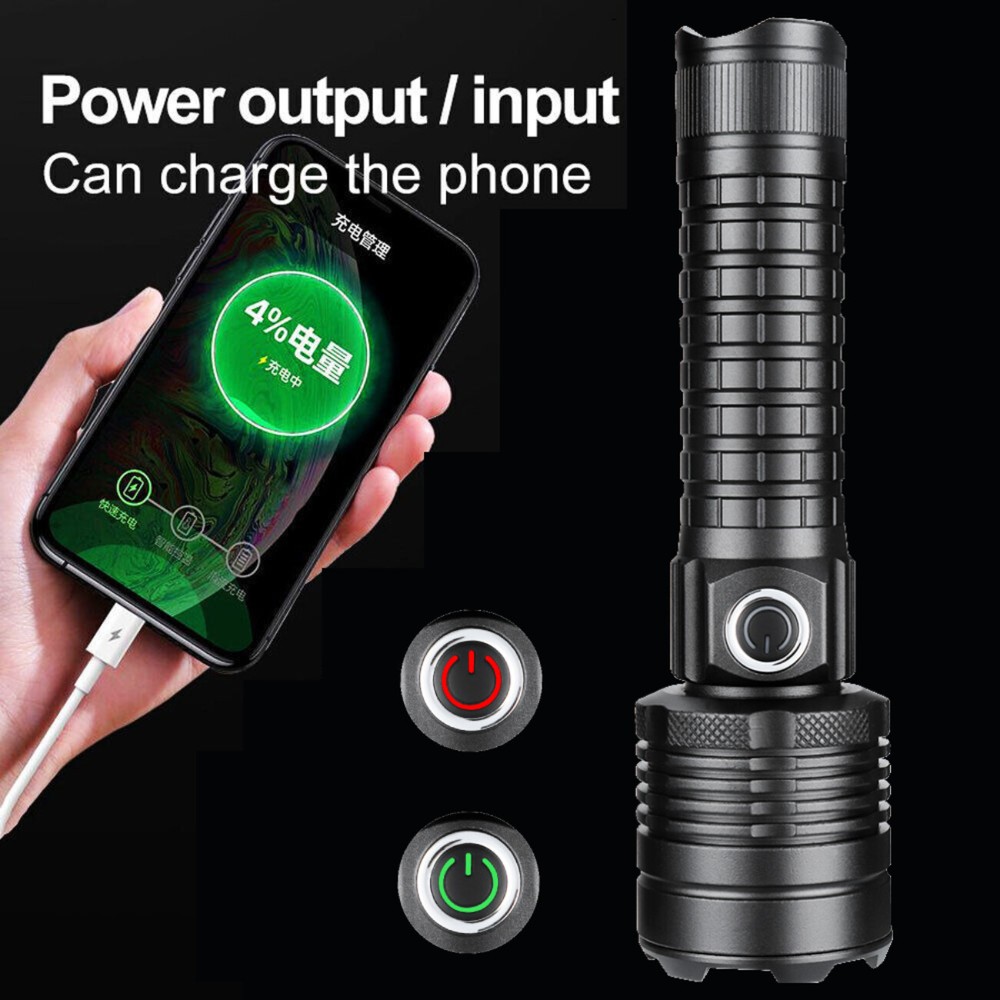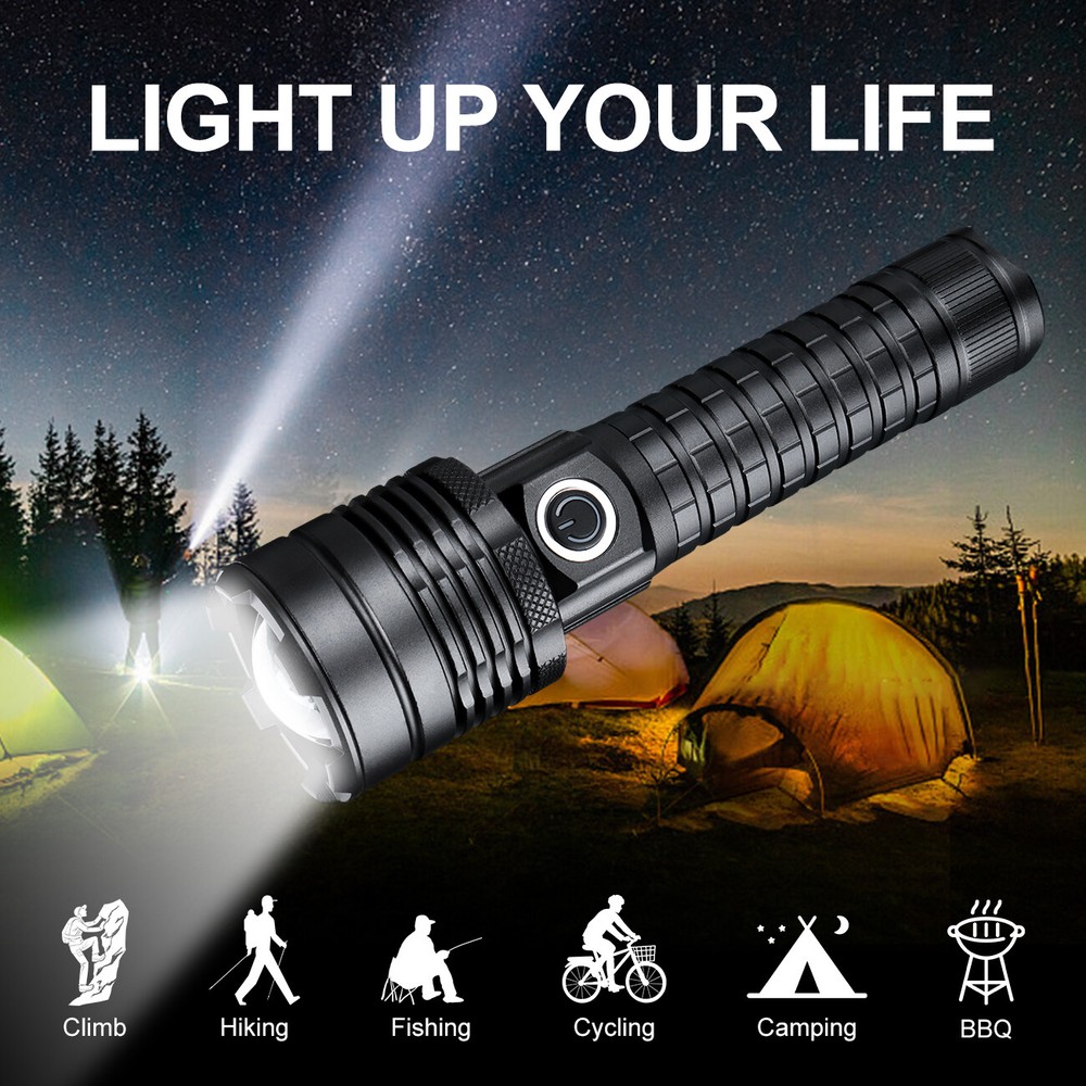 1000000LM Super Bright LED Flashlight Rechargeable USB XHP60 Torch Zoom 3 Modes Not Include battery!!! Not Include charger!!! LED Flashlight Features: XHP60 Led Flashlight 3 Light Working Modes Smart Indicating System Using advanced LED chip. XHP60 LED flashlight is brighter than other flashlight and easily lights up your entire back yard, never lets you caught in the dark.Light your way forward. Simple and Classic.Simply zooming this flashlight in or out for a spot light or as flood light; It features only 3 light modes (High / Low / Strobe) which effectively reduces the trouble of switching 5 modes. All for the best using experience! Smart charging status indicator , when the battery is charging, the LED indicator is RED, after fully charged, the indicator turns GREEN,Micro usb for laptop, power bank, plus socket, computer Zoomable & Ajustable Focus IPX65 Waterproof Widely Application Adjustable Focus by zoom in and zoom out the flashlight. Zoom in the flashlight can get more wider beam and bright wider area.Zoom out the flashlight can get narrow beam and bright further. Pocket-friendly, 5.94in x 1.65in (L x D), 6.0 ounces; Anti-slip knurling and wrist strap enable a firm grip in your hand IPX65 waterproof rating can protect your torch against splashing water from all angles This is the best flashlight tool for working, fishing, camping and outdoor activity etc. Come with Strobe Light and SOS function light, suitable for emergencies, power failure, circuit maintenance car breakdowns. Specification: Type LED Flashlight Rechargeable USB Product color Black Material Aluminum alloy Gear 3 modes (strong-weak-flash) Power Source 1*3.7v rechargeable battery(not include) Charging mode Take out the battery for external charging, or charge with USB Type-C data cable Zoom Telescopic zoom Note: Battery is not included!!! Package Includes: 1 x LED Flashlight USB Rechargeable (Without Batteries) On Jan 18, 2025 at 02:02:21 PST, seller added the following information: