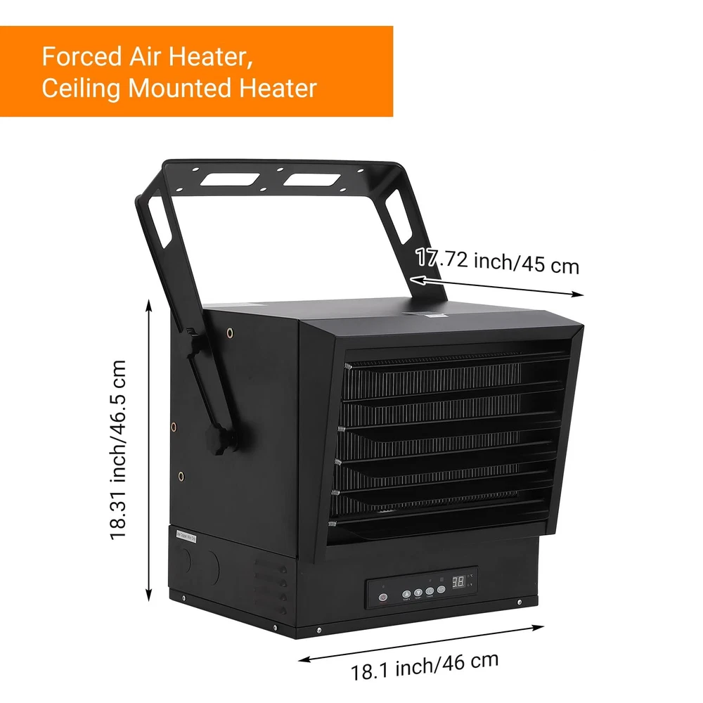 Efficient Heat Powerful Output: This 10000W garage heater has adjustable louvers and variable mounting angle to direct the air output. Its maximum BTUs of 34,120 is powerful enough to heat a large area up to 1,500 square feet.The included 12-hour timer allows you to program the heater to automatically turn on or off according to your schedule, providing convenience and energy efficiency. The remote control enables changes from a distance, giving you the freedom to fine-tune the temperature. Precise Temperature Control: Our 240V garage heater is equipped with a built-in thermostat. You can adjust the power to suit your needs and preferences 45°F-95°F/7°C-35°C, (10,000W 34,120BTU). Power ranges from low to high of 3300/6600/10000W to meet your different needs And a built-in sensor switches the device off automatically if it overheats. Durable Design Build: Built to withstand demanding environments, the industrial heater features a heavy-gauge steel body that ensures long-lasting durability and reliability. The heating elements are fully sheathed, providing enhanced safety and protection. Additionally, the motor is enclosed, safeguarding it against dust and debris, making it ideal for use in dusty environments. consistent and efficient heating performance. Safe Sturdy Build: Constructed with high-quality heavy gauge steel, the body of this commercial heater is built to withstand the challenging conditions of poorly insulated areas. Its durable steel construction ensures reliable performance even in environments with temperature fluctuations. By utilizing heavy gauge steel, this heater offers enhanced durability and longevity, making it a reliable heating solution for commercial spaces. Ceiling Mount Installation: Designed for easy ceiling mounting, this heater includes an adjustable mounting bracket that allows for precise positioning to suit your needs. The built-in sensor monitors the temperature and automatically shuts off the device if it detects overheating, With its convenient design and straightforward installation process, you can effortlessly integrate this heater into your space for efficient and effective heating. Note 1:This heater does not come with a power cord. Note 2: We RECOMMEND you hire a professional electrician to do this safely. The garage heater must be grounded and hardwired to a properly sized current protection circuit breaker in accordance with the (US) National Electric Code and local codes. The heater must be grounded. Heater circuit must be protected with proper fuses. Product Description 10,000W Hard-Wired Ceiling Mount Garage Space Heater Just enjoy the warmth and comfortable in winter 10,000 WATT HEATER WITH REMOTE Take full control of your comfort with the integrated digital thermostat control of the 10,000-watt space heater. Set the optimum temperature for efficient heat output with ease, ensuring a cozy and warm environment. The included 12-hour timer allows you to program the heater to automatically turn on or off according to your schedule, providing convenience and energy efficiency. The remote control enables changes from a distance. Special Feature: Digital Display, On Off Timer, Adjustable Temperature, Electronic Thermostat, Fast Heating Heating Coverage:1500 sq. ft. Thermostat: 45°F to 95°F (7°C to 35°C) Timer Function: 12H Timer Amperage: 41.67 Amps Fuel Type: Electric Power Source: Hard-Wired Heating Method: Forced Air Safe & Sturdy Structure The garage heater is made of heavy-duty steel material, this heater offers enhanced durability and longevity. Ceiling Mounting Instructions You can manually adjust the louvers and variable mounting angle as needed to direct the warm air to where it is needed. Wide Area Heating Its maximum BTUs of 34,120 is powerful enough to heat a large area up to Heating Coverage1500 sq. ft. Power ranges from low to high, 3300/6600/10000W to meet your different needs in cold days. Hardwired Installation Need to be hardwired into your electrical network with 240V AC single phase. The heater should remain at least 3 feet away from all combustible materials such as furniture, curtains, etc. as well as at least 8" away from walls. The heater is to be installed indoors only on a stable, non-combustible surface. Thermostat & Overheat Protection You can adjust the thermostat to suit your needs 45°F to 95°F / 7°C to 35°C (The thermostat is next to the air intake and it reads the temperature up near the ceiling. So you need to set it higher than the desired temperature). ECO Mode & 12 HoursTimer With a built-in precise temperature sensor, the smart ECO mode automatically adjusts the working mode or turns off based on the ambient temperature. You can also set an auto-off timer (1-12 hours) to save on energy bills. Payment Delivery details Terms of sales About us Contact us Payment We accept payment either via PayPal or any of the following credit cards; Visa, MasterCard, Discover, and American Express. Wishing you a happy life! Delivery details We will provide you with the tracking number on the same day or the next day, and transport your package through UPS, DHL, FedEx and other courier methods. If you have any questions, please feel free to contact me and I will do my best to help you solve the problem. Wishing you a happy life! Terms of sales We offer a one month free return and exchange service, and you don't have to bear any losses. We will provide multiple solutions for you to choose from. If you have any questions, please feel free to contact me and I will do my best to help you solve them. We offer a two-year warranty period. If you have any quality issues with the product you purchased within two years, please feel free to contact me. I will provide you with a free replacement service. If you have any questions, please feel free to contact me. I will do my best to help you solve the problem. Wishing you a happy life! About us We are committed to becoming the best eBay seller, with high-quality suppliers, provid