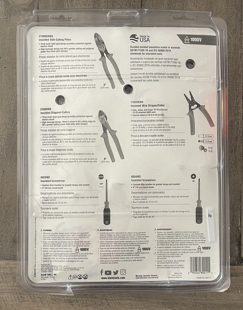 1000V Klien Tools 5 Piece Insulated Tool Kit # 9415R. The kit includes; Insulated Side-Cutting Pliers # 2139NERINS, Insulated Diagonal-Cutters # 2288RINS, Insulated Screwdriver # 6824INS, Insulated Wire Stripper/ Cutter # 11055RINS and Insulated Screwdriver # 6834INS. Condition is brand new sealed in original manufacturer packaging. Pictures of the actual item attached. Shipping is free in the Continental United States (lower 48 States Only). If you have any questions please feel free to contact me prior to purchase. N22 L51 # 38