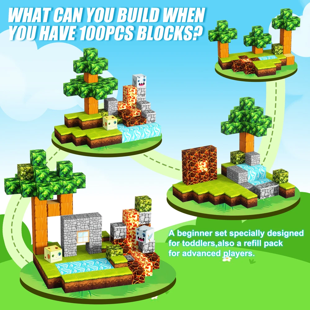 Product Description Features: -BUILD A FOREST SET: Get ready to experience the fun of magnetic toys with this new magnetic cube set! Build a forest collection, add the character cubes from our set, or your other toys, and start your forest adventure with role-playing fun and dress-up toy fun. Magnetic blocks open up a fantastic world of possibilities, from simple to challenging constructions (multiple matching sets required). Let your children's imagination run wild with our magnetic open-ended playsets! -Educational and fun: building and block toys inspire a wide range of skills in children. Building, rotating, destroying and rebuilding with magnetic blocks helps improve children's creative thinking, concetration and patience, cooperation, spatial and motor skills. The included creativity booklet guides and inspires children to explore the magnetic fantasy world. It's a fun solo activity that can also be done with friends and is a great alternative to screen time. -Supersensory Magnetic Toys for Kids: The 100 Piece Magnetic World Set combines UV technology and magnetic science to make your construction art more vivid and realistic than simple solid-colored cubes, offering rich patterns. More cubes, more possibilities to unleash your child's creativity. Kids will get everything to decorate their little castle or build a forest parking lot for their dolls to park their toy cars! -TODDLER AND BEGINNER TOYS MAGNETIC SET: Unlike other magnetic toys on the market, our magnetic cube set makes it easier for toddlers 1+ years old and up to stick the cubes together and make them sturdy. Rounded edges and proper size won't hurt little hands. Perfect STEM toys can help kids get deeper into the world of structures and learn about magnetism. Recommended toy gifts for toddlers and children ages 1-12 years old -EXCELLENT SCIENCE GIFT GIVING IDEAS: The magnetic cube is fun because it will keep kids of all ages busy for years to come. It is a great irritating kids toy for classrooms, toddlers, preschoolers, teens 1 2 3 4 5 6+ boys and girls. Perfect educational gift for birthdays, Christmas, Children's Day, STEM and school events. Attention: - Our initial set is 100pcs, and our main picture is divided into basic sets and advanced quantities, which vary from dozens to hundreds of building blocks, please pay attention to the scale and quantity of building, and purchase according to demand. - We put magnetic control to some challenge, develop careful observation, find building skills, and build high order patterns (watch our tutorial video). The difficulty of more than 300pcs big picture ☆☆☆☆ -☆☆☆☆☆ finally challenge it! Specification: -Material: high quality magnet/high quality plastic -Color: As shown in the picture -Quantity: total 100pcs -Size: single cube size 2.5cm/1inch Package Includes: -1x 100pcs magnetic blocks (12 patterns) -1x Instructions