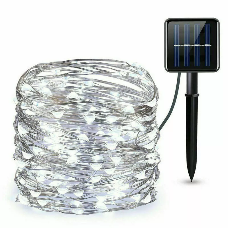 Features: 100% Brand new and high quality Ideal for decorating your gardens, patio, gate, yard, wedding, party etc. High Quality & Flexible Copper Wire - Made with thin and flexible copper wire, coiled with bobbin winder to avoid a mess, the solar powered string lights (low voltage, no transformer included) is easy to storage and ready for the next use. Also, it is environmental- friendly, high energy conversion rate, durable and safe to use. 8 Switch Buttons - ON/OFF&MODE. Auto on at dusk, auto off by day. Waterproof, suitable for indoor and outdoor use Easy to Shape - Flexible Copper wiring can easily build the shapes you want; wrap around tree trunks or gazebos; in the dark, the wire fades to invisible, leaving only the bright lights. Great for Christmas, party or other celebration occasions Specification: LED quantity: 100/200/300/500pcs Solar panel: 1.2v 150mAh Battery: 800mAh Total Length: 10m/33ft 20m/72ft 30m/99ft 50m/166FT Rating Power: 0.6W Voltage: 2V Switch: Power ON/OFF&MODE Switch: 8 Modes: 1-combination, 2-in wave, 3-sequential, 4-slo glo, 5-chasing/flash, 6-slow fade, 7-twinkle/flash, 8-steady Color: Warm White, Multi-color, White Power operated: solar energy(when the solar panel do not face to any light, the LEDs will work.) Notice: Due to the light and monitor difference, the item's color may be slightly different from the pictures. Please allow 1 inch differs due to manual measurement. Package Contents: 1 x LEDs String Light 1 x Solar Panel 1 x English Manual