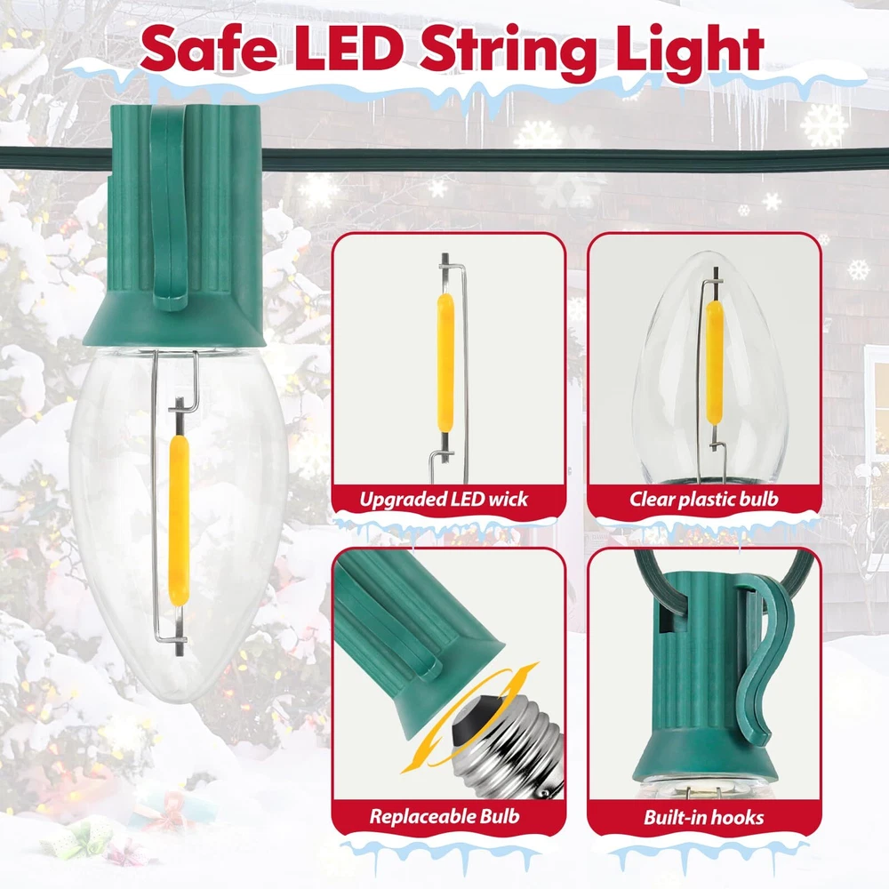 🎄Why do you choose C7 LED Christmas String Lights?🎄 👍Reliable Material Our C7 LED string lights for outside are produced with high quality plastic bulbs and a heavy-duty cord, making them able to withstand extreme weather conditions. IP65 waterproof ensures that they are safe to touch and perfect for both outdoor and indoor decoration. 🎉Easy to Install With a durable and flexible copper wire, these vintage hanging string lights waterproof are easy to install and can be shaped and molded to fit any space. The copper wire is also rust-proof and weather-resistant, so you don't have to worry about wear and tear. 🎊Indoor Outdoor Decoration Lights Our Christmas patio string lights are UL listed for indoor and outdoor use. Each light socket has a link that you can easily attach the lights to your Christmas trees, Christmas decor or other desired surfaces, quick & easy to set up your warm white c7 Christmas lights in minutes, adding an warm white glow to your outdoor garden path and welcome the coming Christmas. 🍾 Specifications - Bulb Type: C7 LED - Base Type: E12 (Candelabra) - Voltage: 120V - Wattage: 0.6W per bulb - Lifespan: Up to 25,000 hours - Power input: 120V~, 60Hz - Lighting mode: steady on 💛Warm Tips 1. Do not mount or place near gas or heaters, fireplace, candles or other similar source installation. 2. If the string light connected with more strings and do not work, please check the max connectable strands (4 strands 100FT) or make sure they are properly connected. 3. The string lights will keep lighting if bulb is broken, you can replace it with our additional spare bulbs. Safe and Durable String Light: Our c7 outdoor string lights come with advance materials and UL listed, which are safer than normal incandescent lights. The heavy-duty green cord made up with PVC cable jacket and high copper that can withstand the wear of indoor and outdoor use. The IP65 waterproof LED Christmas lights either with a built-in spare fuse (120v) for easy , ensuring safe and long-lasting use. Smoothly Dimmable Performance: Adopted advanced dimming technology, our dimmable hanging roof-line string lights with 90%+ dimmer switch in the market, allowing you to dim the brightness from 0%- 100% stable at will, creating the perfect atmosphere for Christmas Halloween holiday birthday party, family reunion or wedding celebration. (Please note: Dimmers are not included) 90% Less Bill Cost: Every C7 Christmas light string outdoor 100FT contains 66+1pcs E12 socket LED bulbs(1 spare bulbs). Each bulb built in high-efficiency led chip, consume 0.6W only while lasting 25000+hrs long lifespan, the low wattage light bulb is more than 90% energy efficient than incandescent bulbs. So you can enjoy the romantic atmosphere without wasting your money. End to End Connectable Lights: 12" lead with male plug, 12" spacing between bulbs, 18" tail with female connector. Our E12 commercial string lights 100FT are end to end connectable up to 432W (4 strands 100FT) to decorate your Christmas. And the C7 vintage clear bulbs are removable that provide flexibility for easy and custom designs. connectable LED Christmas lights perfect for fence, garden, patio, roof, backyard, Christmas decoration. Vintage Christmas Lights: Our C7 vintage Christmas Lights shatterproof glow a warm white lighting, combined with clear lights bulbs & green wire. It’s a perfect Christmas decoration light string for your home, holidays, winter, , backyard, garden, patio, wall, gate, yard, Christmas tree, window, party. You can enjoy the bright and romantic holiday atmosphere.