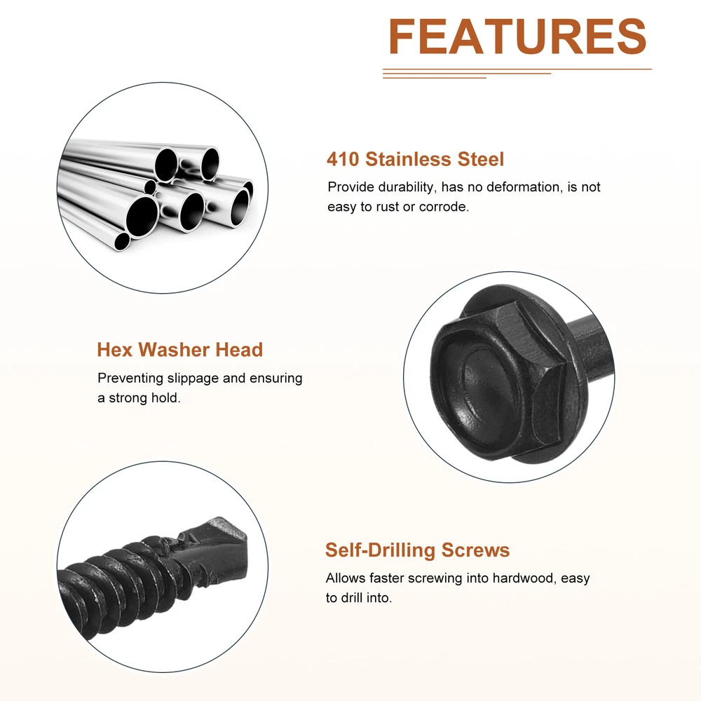 Document Product Details:Material: 410 Stainless SteelThread Size: #14x2"(ST6.3x50mm)Thread Pitch: 1.8mmHead Dia.: 10mm/ 0.39"Washer Head Thickness: 12.85mm/ 0.51"Head Thickness: 4.3mm/ 0.17"Screw Drilling Range(Plate Thickness): 2-6mm / 0.08-0.24inchPackage Content: 100pcs x Hex Washer Head Self Tapping ScrewsMaterial - Constructed with 410 stainless steel material with a black oxide finish the hex washer head self-tapping screw is of strong durability has no deformation is not easy to rust or corrode and has a long service life than ordinary screws.Feature - The metal sheet screws are designed with an external hex drive style with washer preventing slippage and ensuring a strong hold. The self-drilling design allows faster screwing into hardwood easy to drill into such as wood sheet metal steel aluminum plastic or other materials reducing cracking problems. Application - Hex washer head self-tapping screws are widely used for furniture household goods electronics communications power products floor fastening industrial construction machinery equipment maintenance and other DIY projects.Installation - Can be used without a drilling hole good for metal-to-metal or metal-to-wood connections. For harder materials it is recommended to pre-drill with a drill to make it easier to insert the screws. 100Pack #14x2" Hex Washer Head Self Drilling Screws Stainless Steel Black Product Details: Material: 410 Stainless Steel Thread Size: #14x2"(ST6.3x50mm) Thread Pitch: 1.8mm Head Dia.: 10mm/ 0.39" Washer Head Thickness: 12.85mm/ 0.51" Head Thickness: 4.3mm/ 0.17" Screw Drilling Range(Plate Thickness): 2-6mm / 0.08-0.24inch Package Content: 100pcs x Hex Washer Head Self Tapping Screws Material - Constructed with 410 stainless steel material with a black oxide finish the hex washer head self-tapping screw is of strong durability has no deformation is not easy to rust or corrode and has a long service life than ordinary screws. Feature - The metal sheet screws are designed with an external hex drive style with washer preventing slippage and ensuring a strong hold. The self-drilling design allows faster screwing into hardwood easy to drill into such as wood sheet metal steel aluminum plastic or other materials reducing cracking problems. Application - Hex washer head self-tapping screws are widely used for furniture household goods electronics communications power products floor fastening industrial construction machinery equipment maintenance and other DIY projects. Installation - Can be used without a drilling hole good for metal-to-metal or metal-to-wood connections. For harder materials it is recommended to pre-drill with a drill to make it easier to insert the screws. Hot Item Payment 1.We accept eBay payment . 2.Payment must be received within 7 business days of auction closing. Shipping 1.We ship to your eBay or Paypal address. Please make sure your eBay and Paypal address is correct before you pay. 2.Items will be shipped within 1-3 business day when we received payment. 3.Delivery time depends on destination and other factors. Description Policy 100Pack #14x2" Hex Washer Head Self Drilling Screws Stainless Steel Black Product Details: Material: 410 Stainless Steel Thread Size: #14x2"(ST6.3x50mm) Thread Pitch: 1.8mm Head Dia.: 10mm/ 0.39" Washer Head Thickness: 12.85mm/ 0.51" Head Thickness: 4.3mm/ 0.17" Screw Drilling Range(Plate Thickness): 2-6mm / 0.08-0.24inch Package Content: 100pcs x Hex Washer Head Self Tapping Screws Material - Constructed with 410 stainless steel material with a black oxide finish the hex washer head self-tapping screw is of strong durability has no deformation is not easy to rust or corrode and has a long service life than ordinary screws. Feature - The metal sheet screws are designed with an external hex drive style with washer preventing slippage and ensuring a strong hold. The self-drilling design allows faster screwing into hardwood easy to drill into such as wood sheet metal steel aluminum plastic or other materials reducing cracking problems. Application - Hex washer head self-tapping screws are widely used for furniture household goods electronics communications power products floor fastening industrial construction machinery equipment maintenance and other DIY projects. Installation - Can be used without a drilling hole good for metal-to-metal or metal-to-wood connections. For harder materials it is recommended to pre-drill with a drill to make it easier to insert the screws. Hot Item Payment 1.We accept eBay payment . 2.Payment must be received within 7 business days of auction closing. Shipping 1.We ship to your eBay or Paypal address. Please make sure your eBay and Paypal address is correct before you pay. 2.Items will be shipped within 1-3 business day when we received payment. 3.Delivery time depends on destination and other factors.