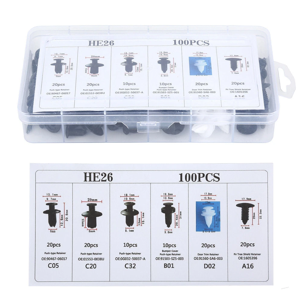 100×Car Retainer Clips Auto Fasteners Push Trim Clips Pin Rivet Bumper Kit 6Size Features: Various fasteners to meet the needs of different parts of the car. Used widely for car fender, bumper, door or other car surface. High quality plastic material, durable and long service life. Note: All vehicles have a range of different clips used on them. Different models have different sizes and there are no universal clips. Please check as much as possible before buying. Package including 100pcs Clips + 1 Plastic Box Clip of C05 Screw Type Clip Retainer Rivet Condition: Brand New Material: Black Nylon Size Approx: Head Diameter: 15mm Stem Length: 12mm Fits Into 6mm Hole For GM Replace 20426301 For Mazda Replace 9926-50-625 For Toyota Replace 90467-06017 For Toyota Replace 90467-06017-20 For Toyota Replace 90467-06017-41 For Auveco A14260 Clip of C20 Fender Liner Clip Splash Shield Blind Rivet Fits For Mazda Replace FB01-56-964 Fits For Honda Replace 90675-SB3-003 Fits For Nissan Replace 63876-95596 Fits For B16 B18 B18C B20 H22A EK9 EG6 Fits For Accord Civic Prelude CR-V Del Sol CRX Fits For INTEGRA GSR S2000 AP1 MUGEN Fits For TYPE R Si Condition: Brand New Material: Black Nylon Size Approx: Head Diameter: 20.6mm (0.81") Stem Length: 9.5mm (0.37") Fits Into 8mm (0.32") Hole For Auveco A16000 Clip of C32 Push-Type Retainer Black Nylon Head Diameter: 20mm Stem Length: 13mm Fits Into 8mm Hole Fits For Mazda 6 2002-2006 Fits For Mazda 323 1998-2003 Fits For Ford Aspire Fits For Mazda Replace B092-51-833 Fits For Ford Replace MB-455-56143 Fits For Kia Replace MB455-56-143 Fits For Nissan Replace 09409-09302 Fits For Hyundai Replace 86590-28000 For Auveco A17632 Clip of B01 Front & Rear Bumper Retainer Push Type Clip Condition: Brand New Material: Black Nylon Head Diameter: 20mm Stem Length: 18mm Fits Hole Size: 10mm For Honda Replace 91503-SZ5-003 (1996-On) For Acura Replace 91503-SZ5-003 For Auveco A20564 For PAS9282, PAS938 Clip of D02 Interior Trim Board Retainer Clip White Nylon Top Head Diameter: 13mm Middle Head Diameter: 16mm Bottom Head Diameter: 18mm Stem Length: 15mm Stem Diameter: 8.5mm x 8.5mm Overall Length: 20mm Fits For GM Replaces 94858299 Fits For Geo Prizm 1998-On Fits For Toyota Replaces 90467-10161 Fits For Sienna, Solara & Tercel 1990-On Fits For Previa 2007-On, Corolla 2003-On Fits For Lexus LS460, LS460L 1990-On For Auveco A18876 Clip of A16 Radiator Yoke, Fender & Bumper Shield Retainer Christmas Tree Type Clip Black Nylon Head Diameter: 17.8mm Stem Length: 20mm Stem Diameter: 7.6mm For GM Replaces 1595864, 1605396 For Ford Replaces 388577S For Ford Replaces W705589-S300 For Auveco A11146, A15414 We offer free returns with any orders within 30 days from the date of delivery. No restocking fees, no administrative fees, no return shipping fee, and no hassle! We will email you when a prepaid return label is ready to download from your ebay account. You just have to print it out and drop the package off at a USPS facility. When we get it back, you will be notified and credited for the full price of the items/products that are returned. Since the shipping fees go directly to the delivery service, we are not able to refund any shipping costs. For warranty returns passed the 30 days, please call or email us so we can make sure we are providing you with the best possible support.