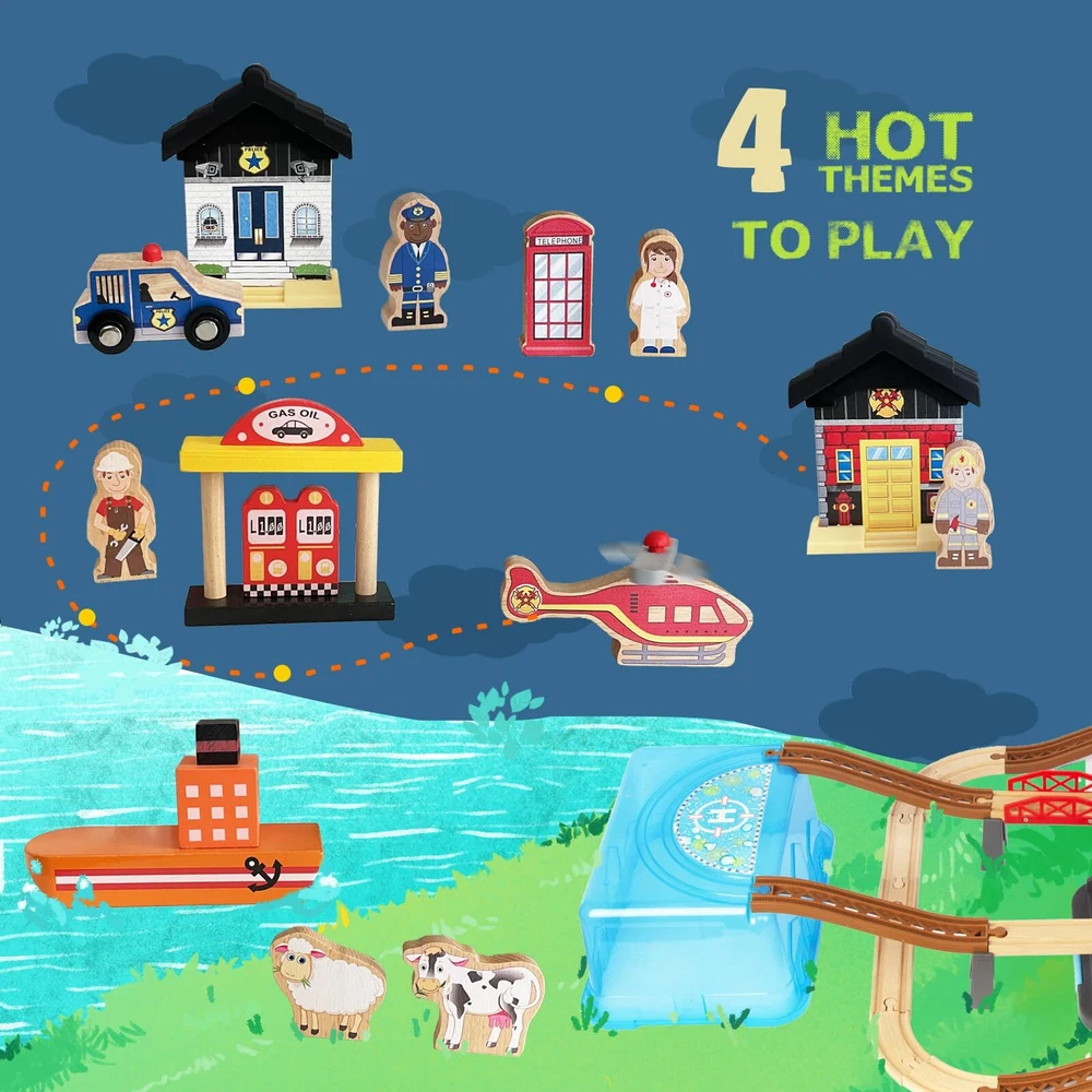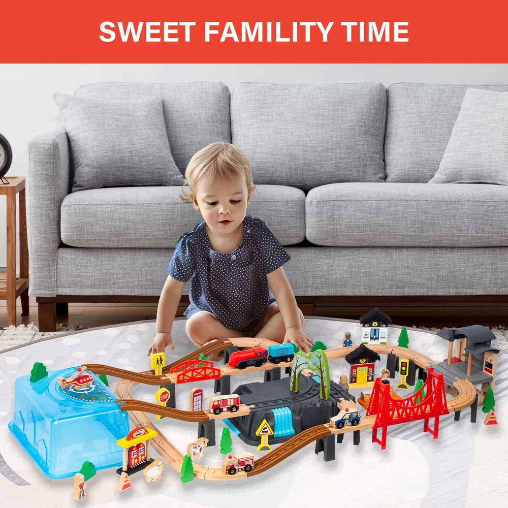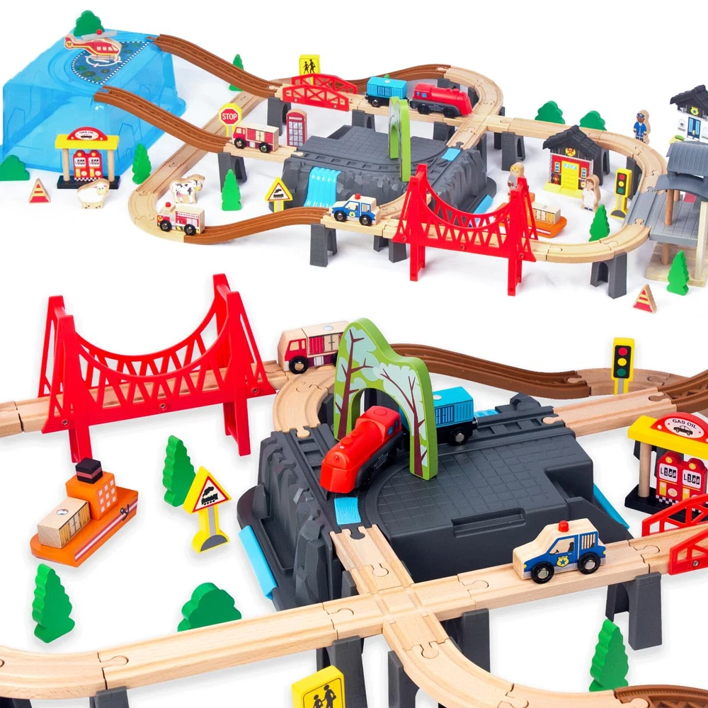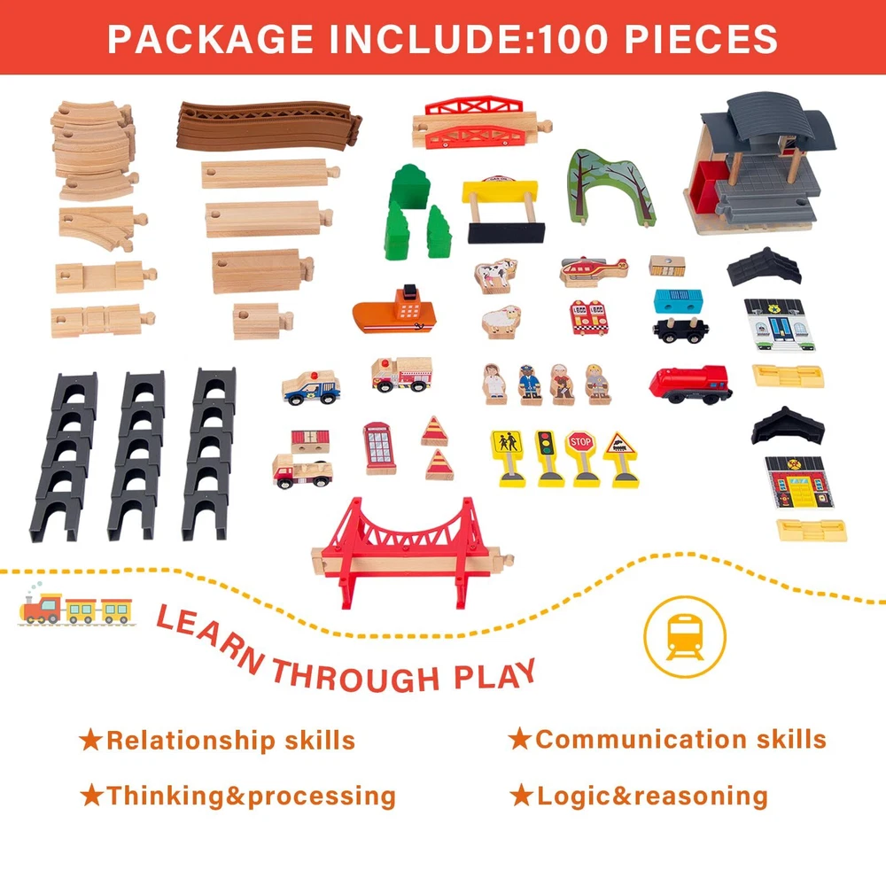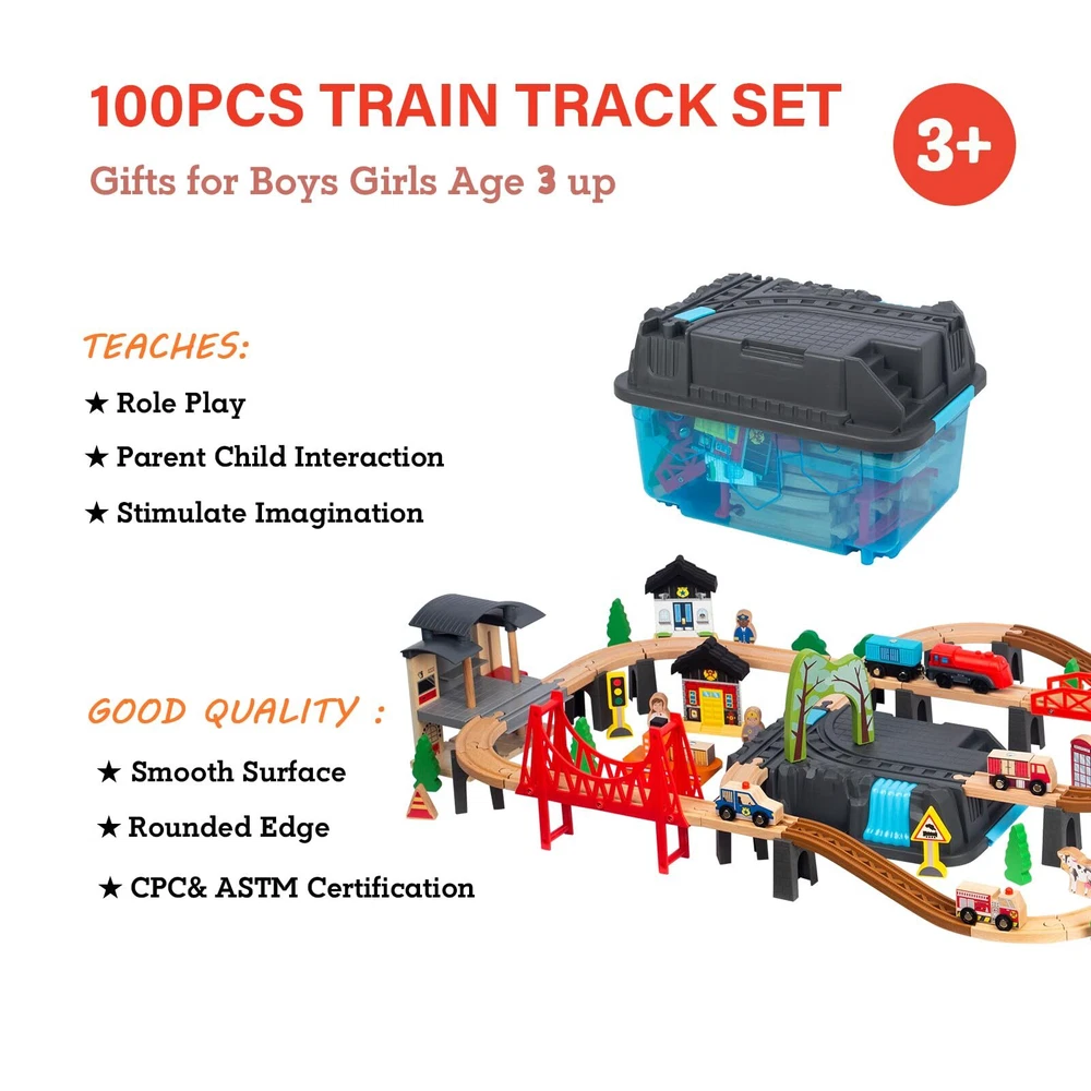 Complete Train Track Set:This 100pcs wood train set for toddlers comes with tracks, heliport, trucks, train, bridge and other accessories. can DIY assorted traffic systems by imagination and spatial logical thinking ability with this train sets for boys 3-8. Perfect for birthday gifts Christmas gifts toys. With Versatile Brands:The train set for 3 year old boys fixes various brands' car sets, such as Thomas, Brio, Melissa & Doug, IKEA, Chuggington, and many more which can be perfectly placed and run on train tracks stably to save more money. Safety: This wooden train track sets are made with beech wood which is sturdier than pine and features hand-sanded edges to better protect children during play. Best Choice: Toy train sets are easy to build and enjoy for young children, making them a smart toy during holidays or birthdays. They also come with a colorful and storage box to make them easier to or for portable play. Service : Buy with confidence. If anything happens to your train tracks for ages 3-8 within the first 12 months of owning it, we will replace them at no charge to you. This includes coverage for any issues or broken parts associated with the set.