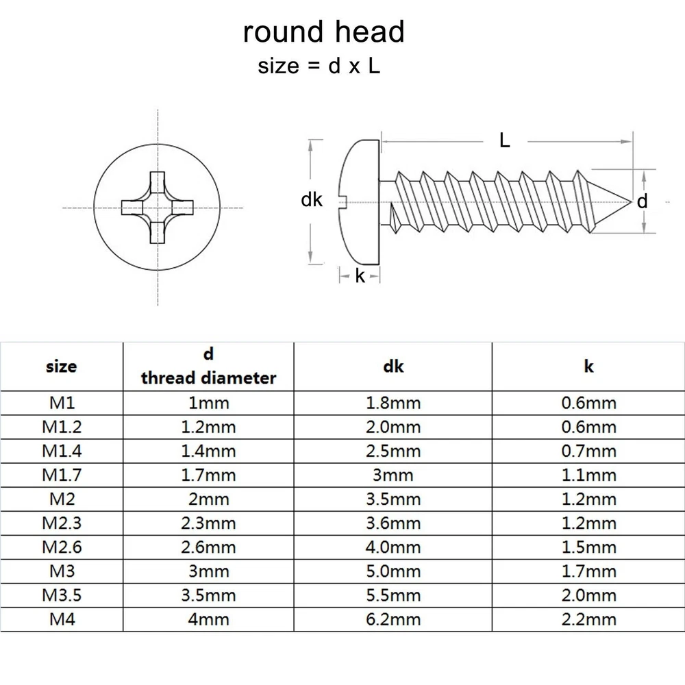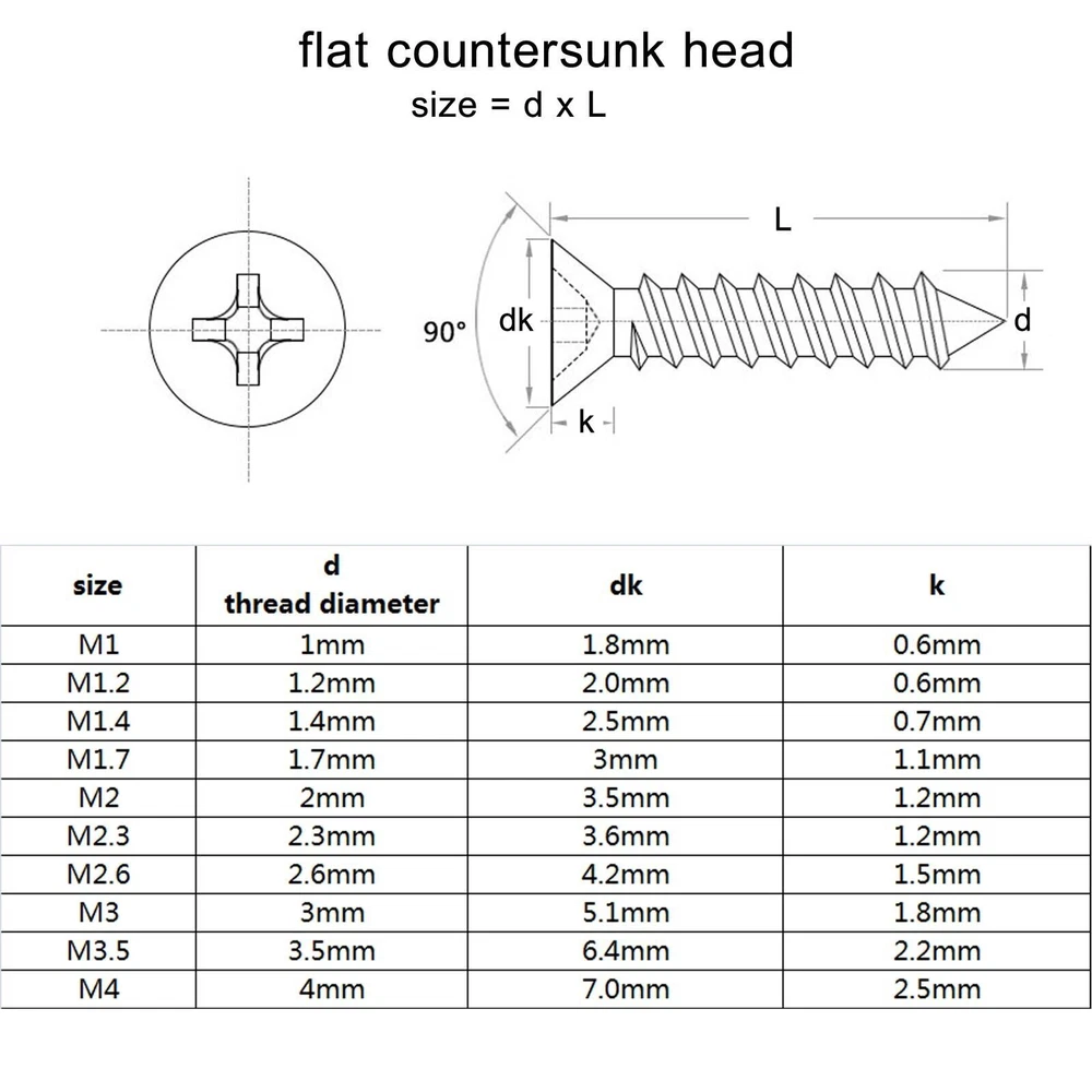 Material: carbon steel Surface: black plated Phillips flat countersunk head size : d(thread diameter: 1/1.2/1.4/1.7/2/2.3/2.6/3/3.5mm) x L(total length) Phillips pan head size : d(thread diameter: 1/1.2/1.4/1.7/2/2.3/2.6/3/3.5mm) x L(thread length)There are 100pcs phillips flat head or pan head self-tapping screw On Dec 14, 2024 at 21:44:22 PST, seller added the following information: