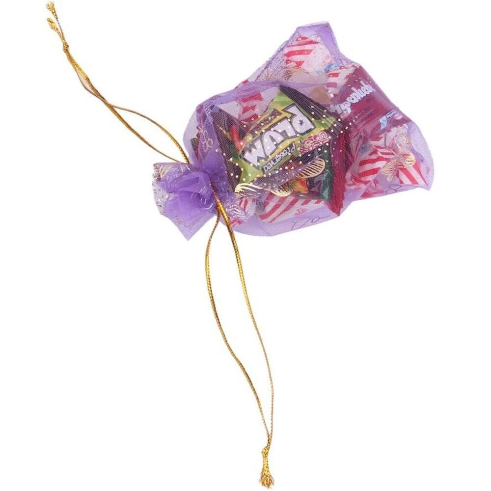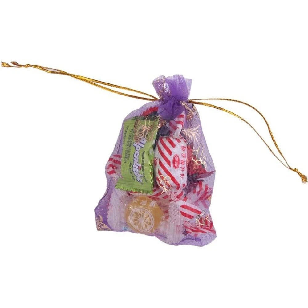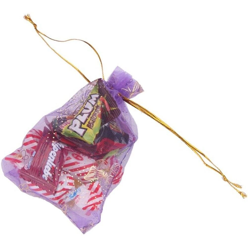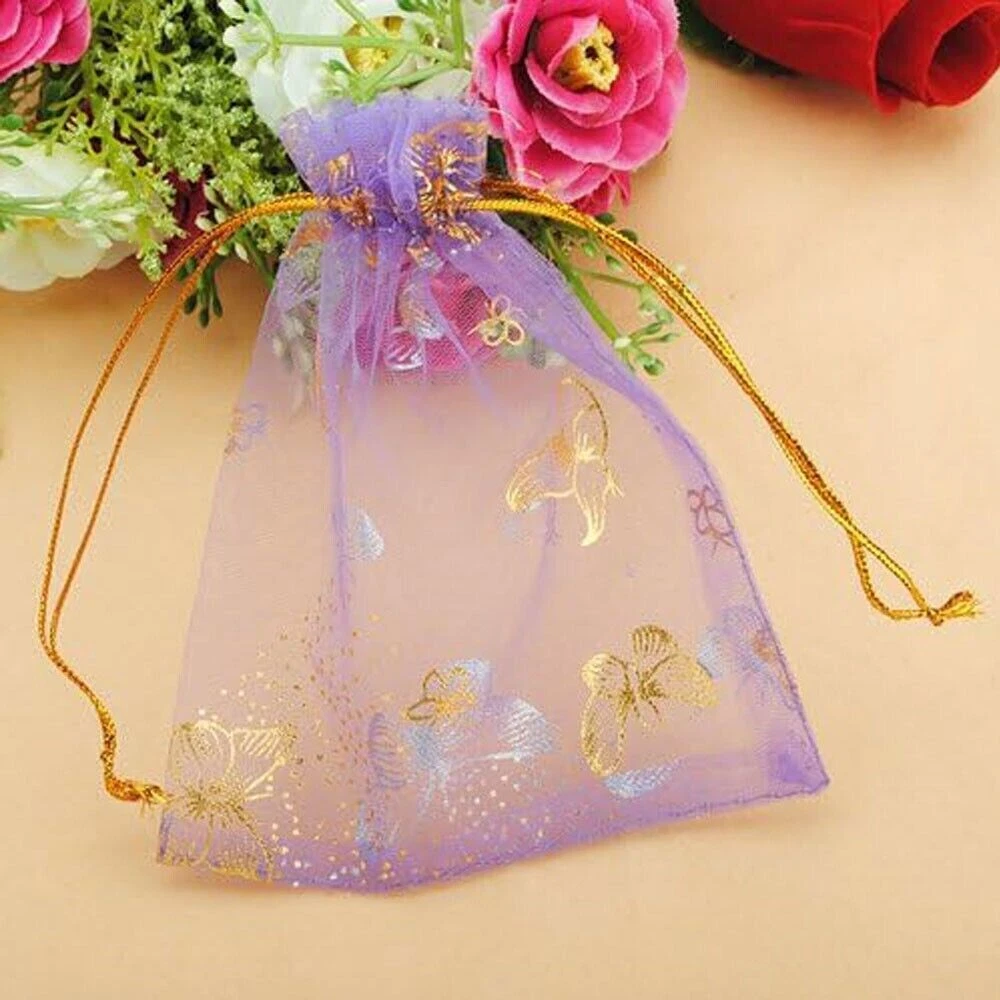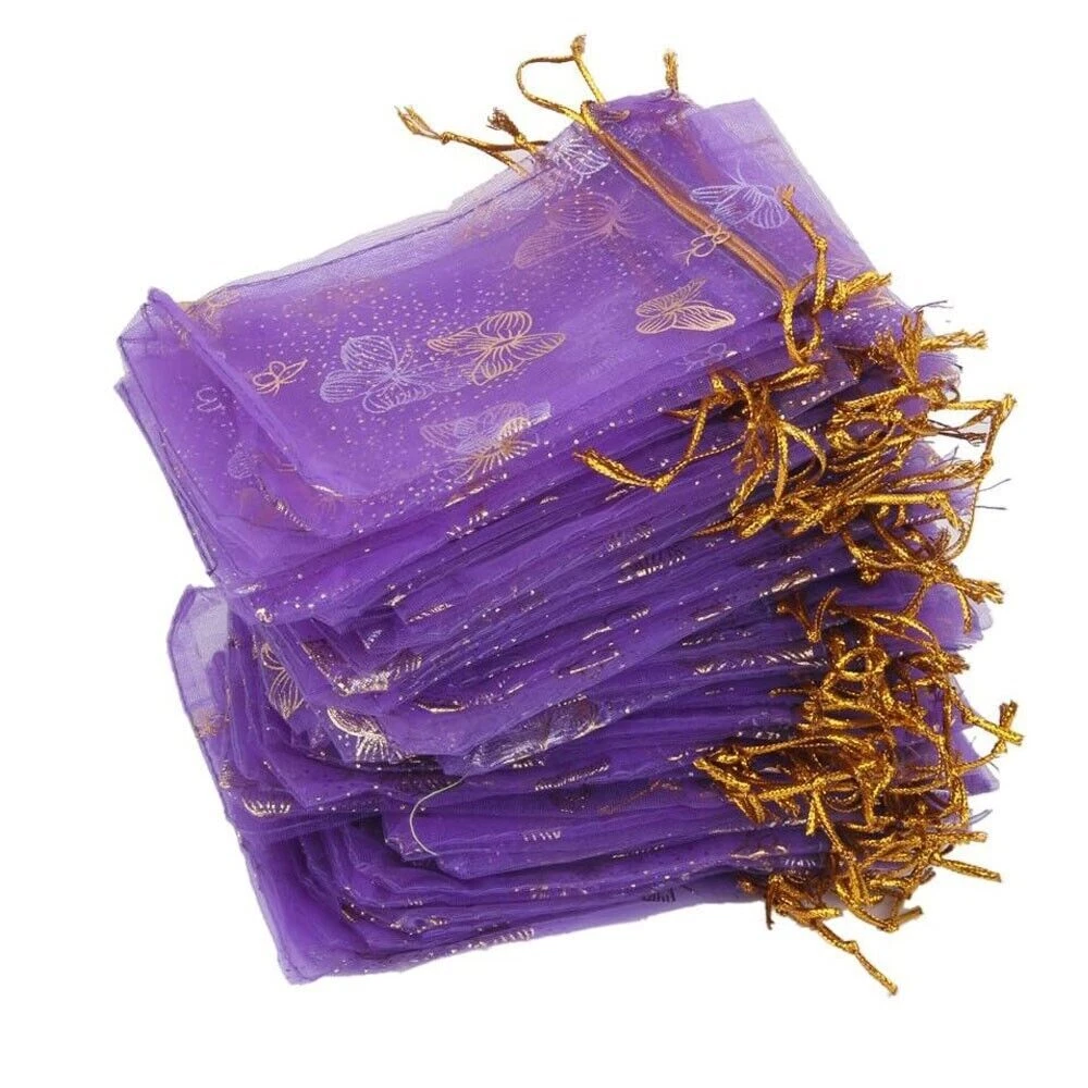 Specifications: Material: Organza Size (Width x Length): 9x12cm/3.5"x4.7" Color: Purple Pattern: Butterfly Package Includes: 100 x Organza Drawstring Bags Premium Material: Made of organza fabric material, which is safe, sturdy, washable and not easy to break, you can use it for a long time; It is also lightweight and portable for you to carry. Easy To Use: Each bag comes with two gold corlor drawstrings on both ends, making the bags open or close conveniently, and you can also be easy to carry your items in them with the strings. Wide Applications: Can be used for storing food, packing gift, travel storage, and keeping some items such as snacks, cream jars, jewelry, coins, candy at parties, shipping hardware or other small metal parts. You can store daily essential. Notices: Due to the light and screen setting difference, the item's color may be slightly different from the pictures. Please allow slight dimension difference due to different manual measurement.