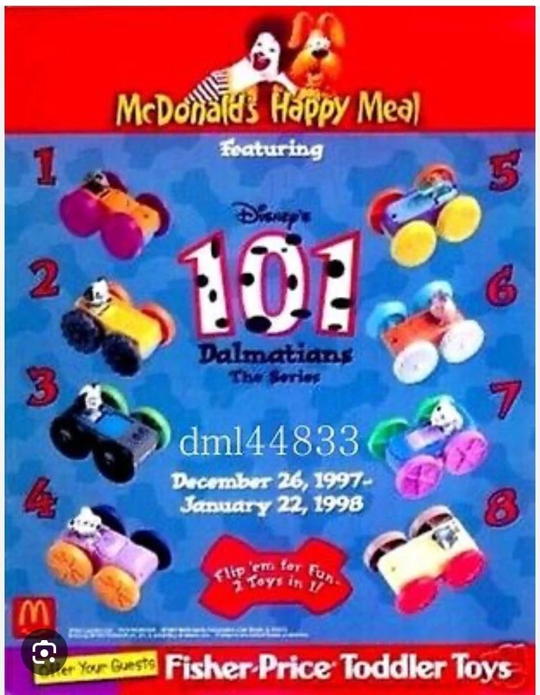 This McDonald's Disney 101 Dalmatians Happy Meal Toys set is a must-have for any collector or fan of the classic movie. The set includes 1-8 sealed toys featuring the beloved characters from the film, and is recommended for ages 3 and over. The multi-color toys are perfect for any occasion and will make a great addition to your collection. The set is from 1998 and has not been modified in any way. Don't miss out on this opportunity to own a piece of Disney history!