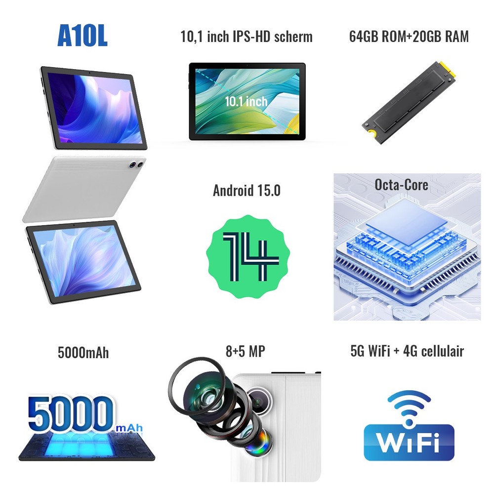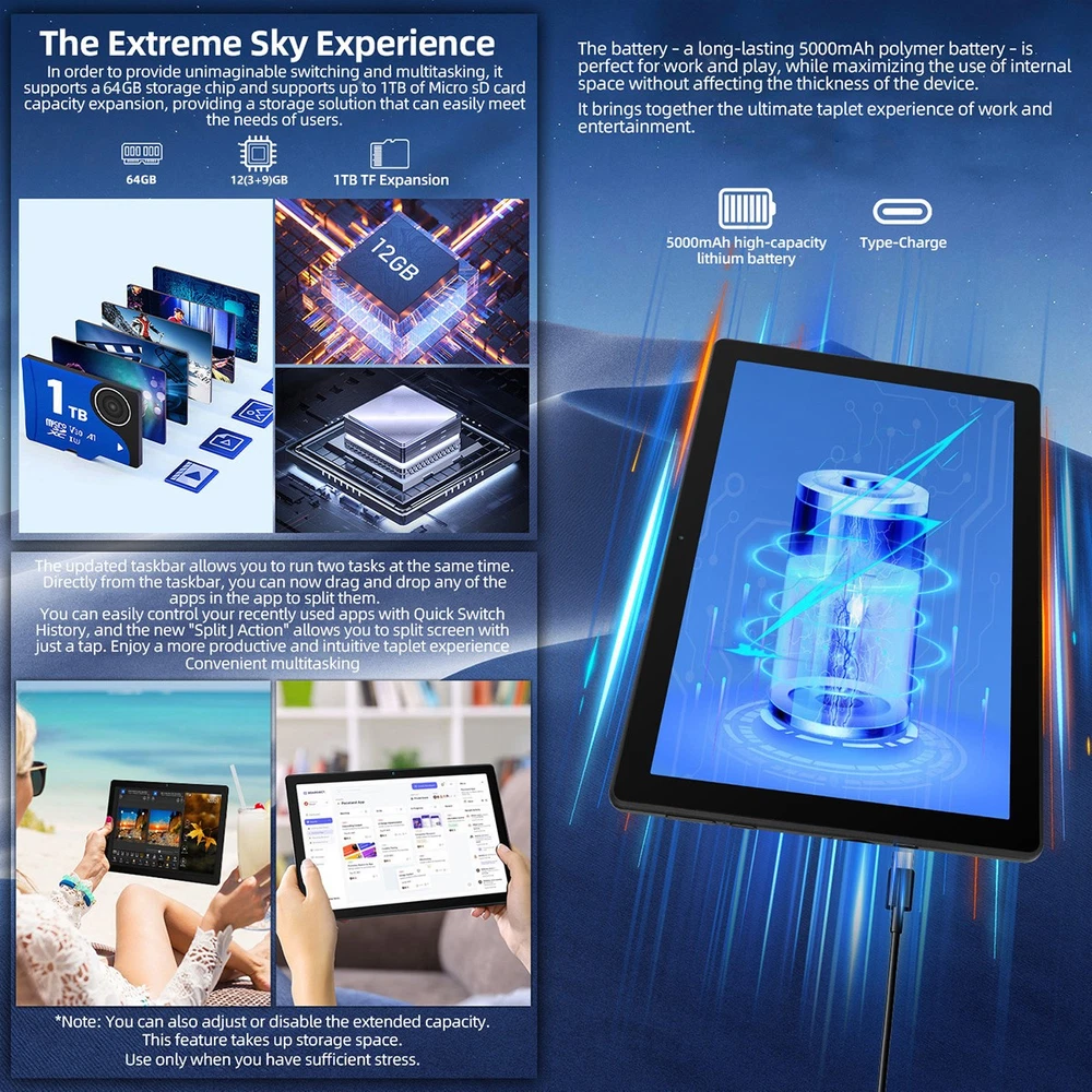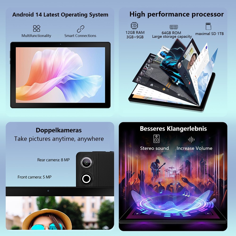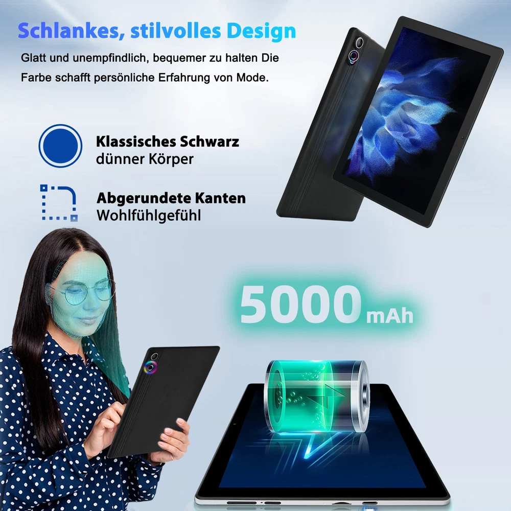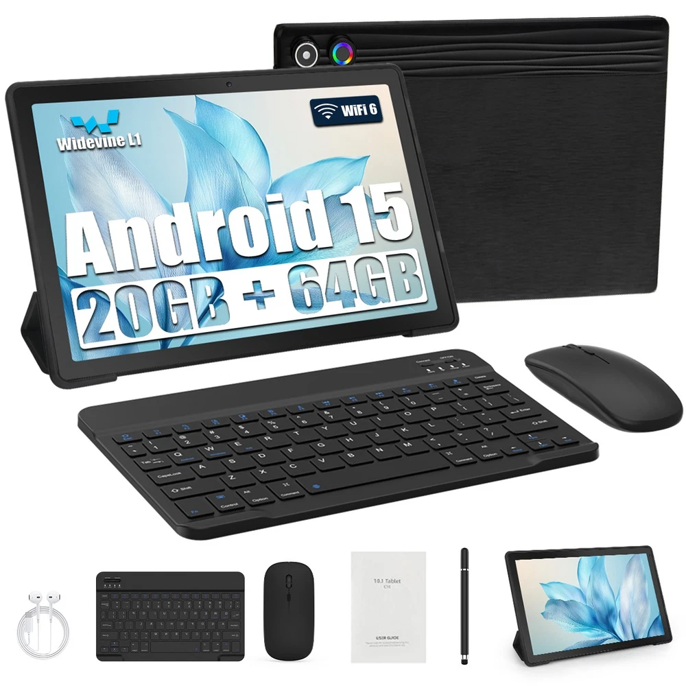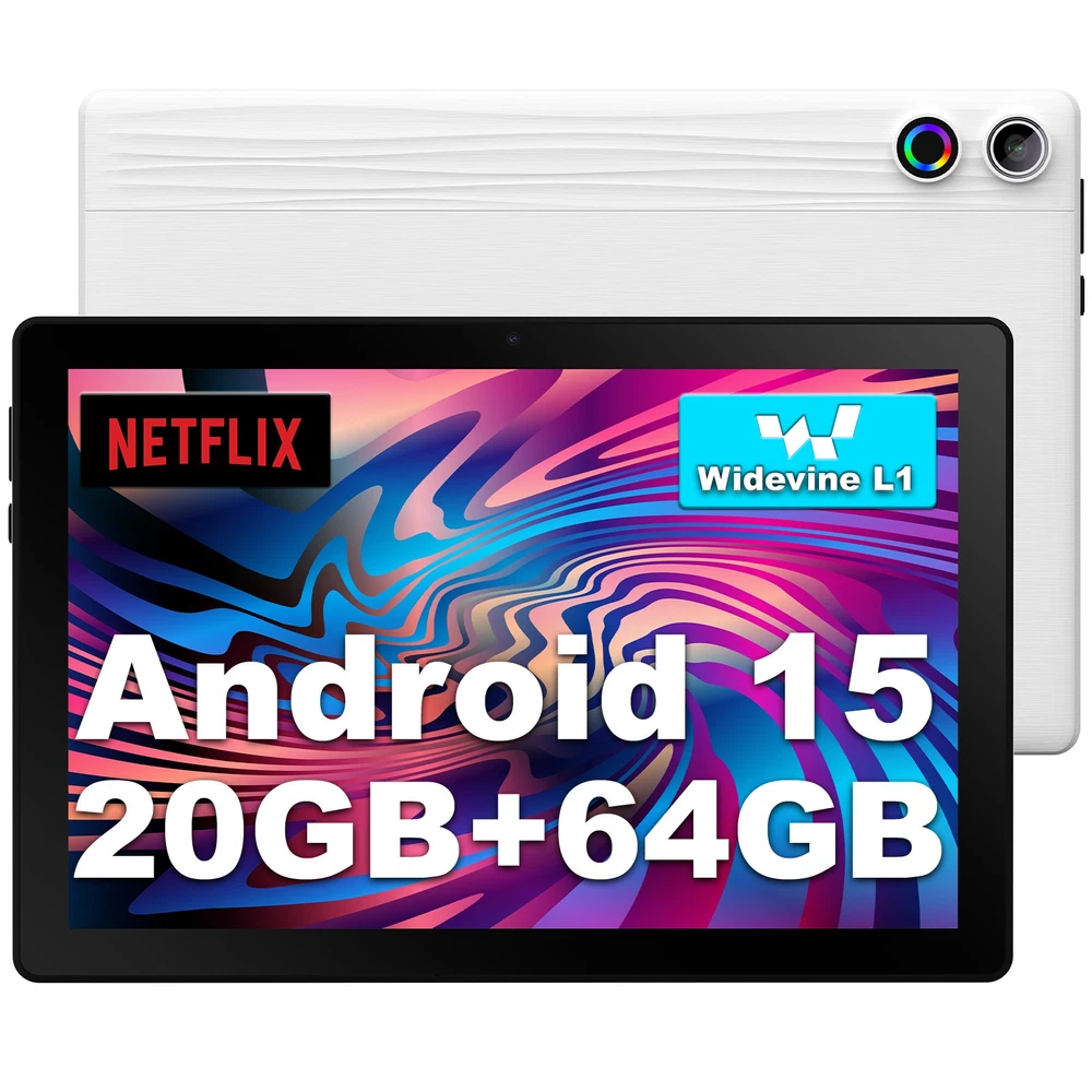 🏆【Latest Android 15 Tablet】This tablet is powered with the latest Android 15 OS2.5, which improves the tablet's performance and efficiency giving users more control over their data and personal information, and allows you to further customize your device and enhance user protection and accessibility features. Updated includes new themes, AI-generated wallpapers, safety, data privacy and improved functionality for a range of accessibility features. This makes the tablet easier and more efficient to use and a great companion to your life! 💾【20GB+64GB+1TB Expansion+ 8-Core CPU】This Android tablet has max 20GB RAM(3GB RAM + 17GB virtual RAM) and 64GB ROM storage, it can be expanded with a micro SD cardthat allows for an expansion of 1TB of memory (SD card is not included). Tablet runs with new generation ultra-high performance and low power consumption Octa-Core 2.0GHz CPU, achieve faster and more stable running and storage speeds. With the Mail G57 graphics processor, you can play popula games/watch video with great smoothness and enjoy that without the stress of running out of storage space. 📞【WiFi 6+Bluetooth 5.3+Face Unlock】This 10 inch Android 15 tablet uses 6th generation WIFI technology, supports 5G&2.4G dual-band WiFi, which allows you to search the network quickly and freely, and provides a better network connection with lower latency, stronger signals, and faster speeds. Furthermore, the tablets support face recognition for unlocking, allowing your privacy is more privacy. Furthermore, the tablet is compatible with Widevine L1, which allows you to stream high-definition video on Netflix, Amazon Prime Video, and other platforms, with smoother and faster operation. 🎬【Widevine L1+Functional Tablet】This android tablet is compatible with Widevine L1, which allows you to stream high-definition video on Netflix, Amazon Prime Video, and other platforms, with smoother and faster operation. Besides, it is equipped with rich functions like face recognition, child protection, screen Split, make your tablet experience more convenient. A good companion for your or your kids. 🔋【Long Lasting Battery & 5MP+8MP Dual Camera】The 10 inch tablet is powered by a long-lasting, reusable 5000mAh Li-ion battery that easily gives you up to 8 hours of reading, browsing, watching movies, and playing games, giving you more time for entertainment and surfing the web. The Android 15 tablet is equipped with 8MP+5MP, which allows you to freely shoot such as people, sports, snow etc., allowing you to enjoy shooting with out this tablets. 🎁【Ideal Choice for Gifts】The tablets 10 inch with lightweight and slim design, only 9mm thin body, it is a good choice for birthday or a gift for family and friends. We provide a one-year warranty for this octa-core Android 15 tablet. If you receive any problematic products, please feel free to let us know. We will provide you with a satisfactory and professional solution within 48 hours. Go and get this 10.1 inch tablet.