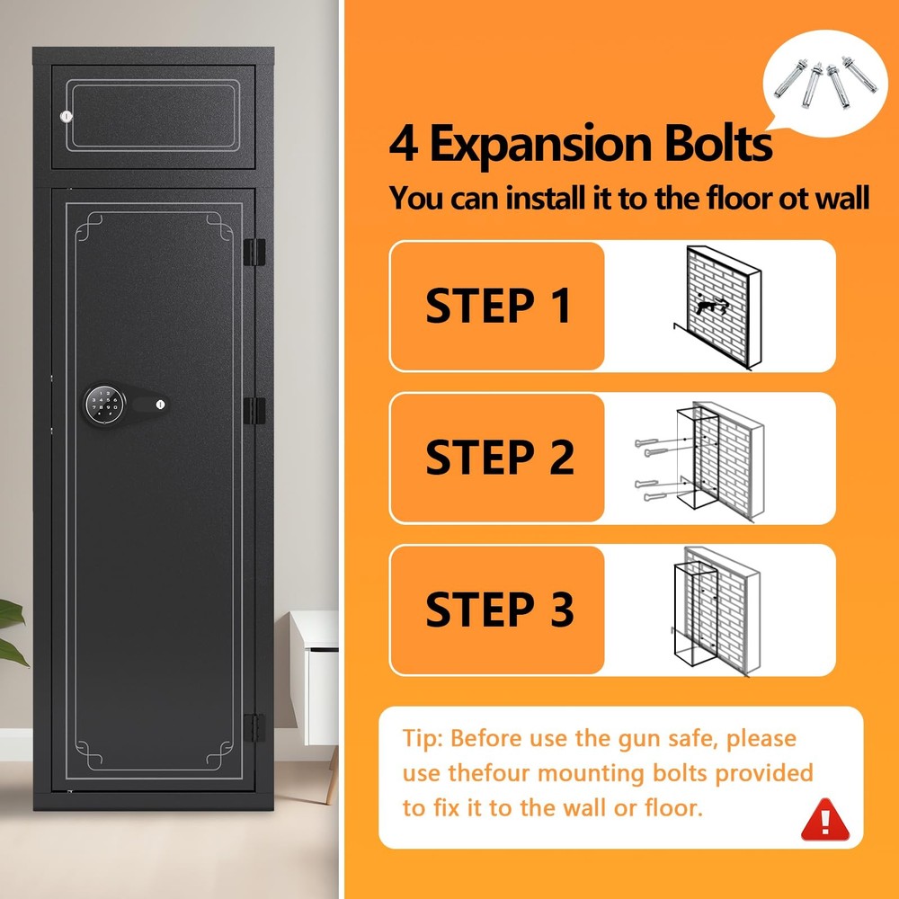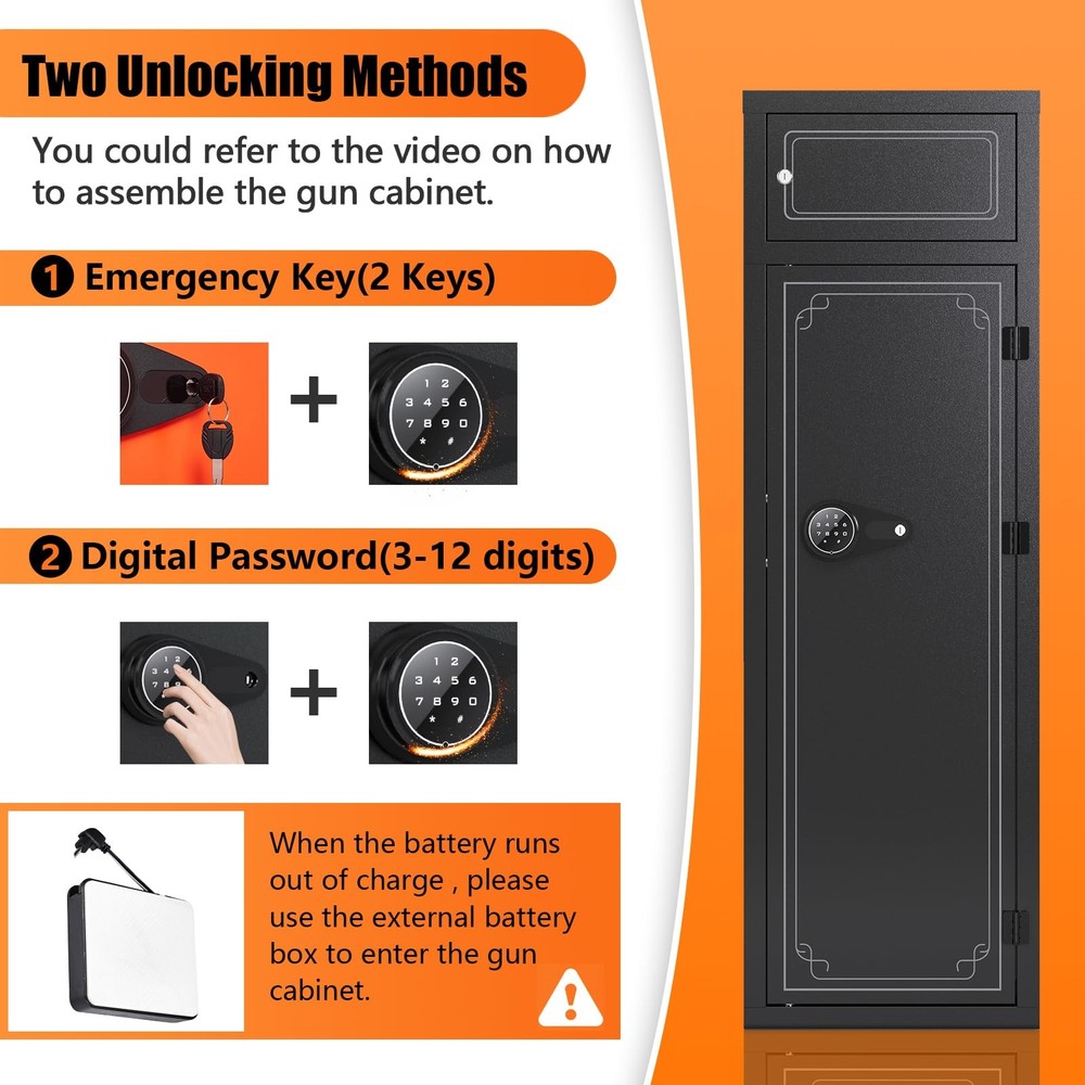 [10-12 Gun Capacity with Separate Lockbox]:External dimensions after assembly:H57 "X W18.1 "X D15".This gun safe can store 10-12 guns up to 45.5 inches long. Suitable for guns with or without scope. Separate lock box can be used to store handguns, bullets and other items. [Electronic Gun Cabinet]:There are two ways to unlock the gun cabinet.Digital code prevents unauthorized access to gun cabinets.Ensure quick access to guns in case of emergency.When the battery runs out, Please use the External Battery Box to access the rifle safe. Requires 4x5AA batteries.(Battery are not include).Emergency key.Note: Please do not lock the key inside the gun cabinet. [All steel structure]:The gun safes are made of cold rolled steel. Four 20mm lock bolts increase safety, anti-pry, and anti-theft. For added safety, please use the 4 expansion bolts provided to fix the gun cabinet to the wall or floor. [What's include?]:1 x Rifle Gun Safe(Need to assemble) ,2xEmergency keys,2xSeparate Lockbox keys,3xGun Rack,1xExternal Battery Box,4xExpansion bolts,1xinstructions,1xGloves, 1xScrewdriver. [The Details of Gun Safe] : 3 Removable gun racks. Can be freely adjusted according to the length of the gun. LED light. when you use the password to enter the gun cabinet, the LED light will light up. Use the key to enter the gun cabinet and the LED light will not light up. Silent function. Long press "*" to switch between silent and non-silent modes. Suggestion: Before you assemble the gun cabinet. please read the instructions carefully and check if the installation accessories are complete?During the assembly process, if you have any questions, please contact us by email, we will help you solve the problem as soon as possible.