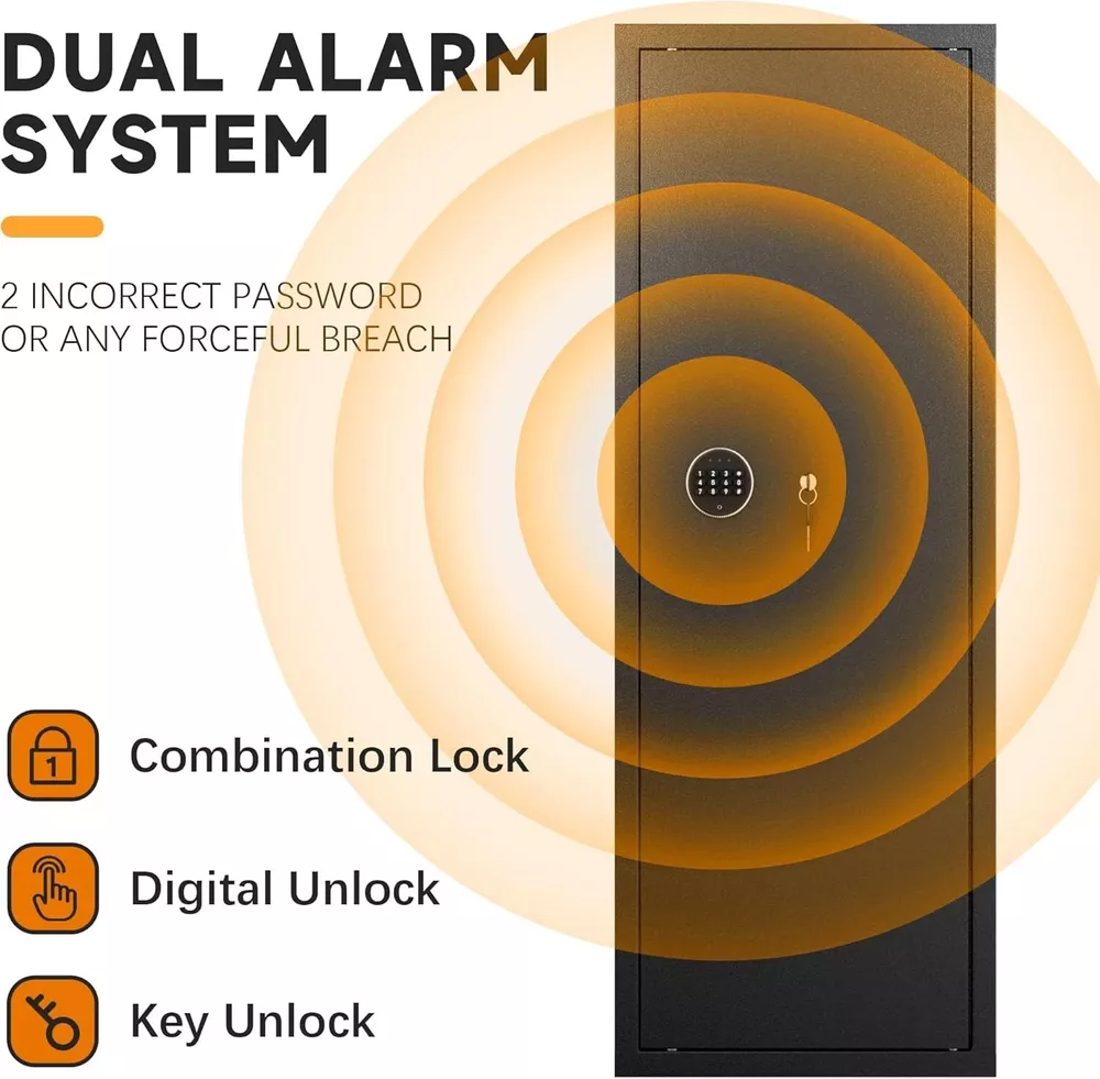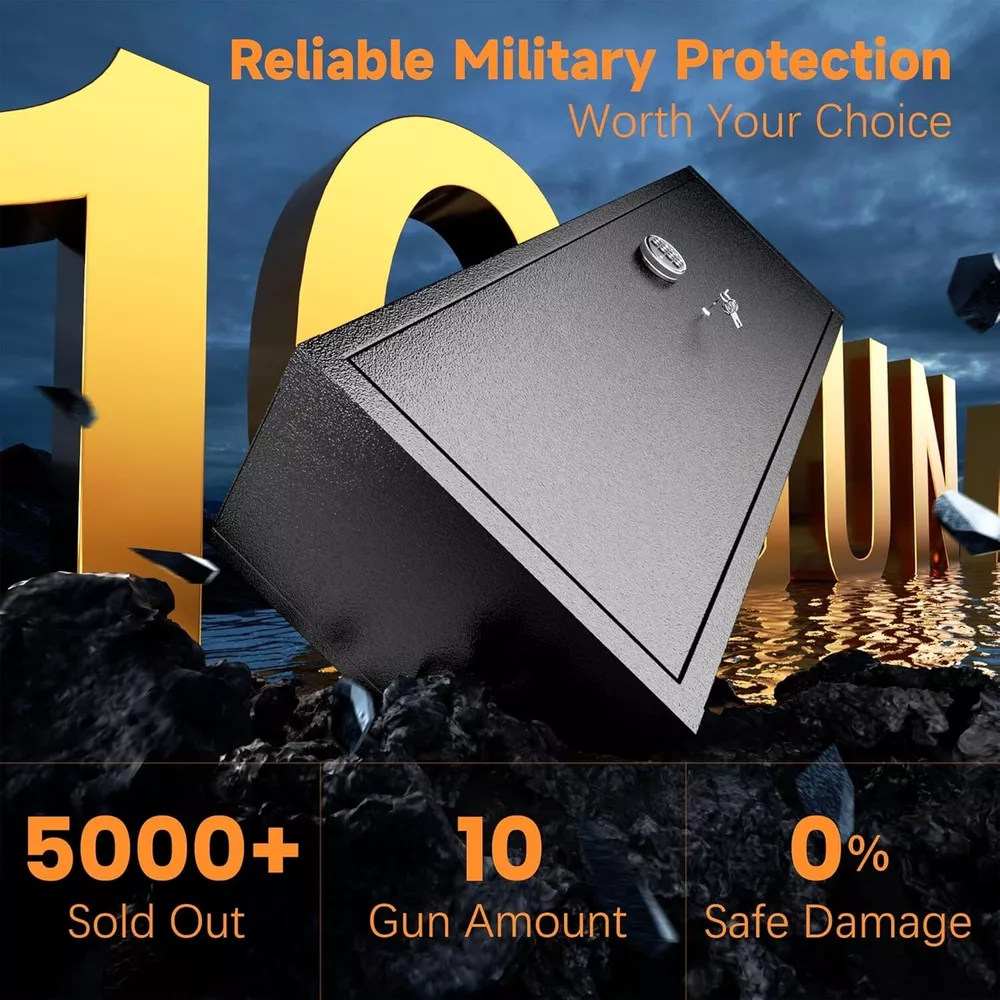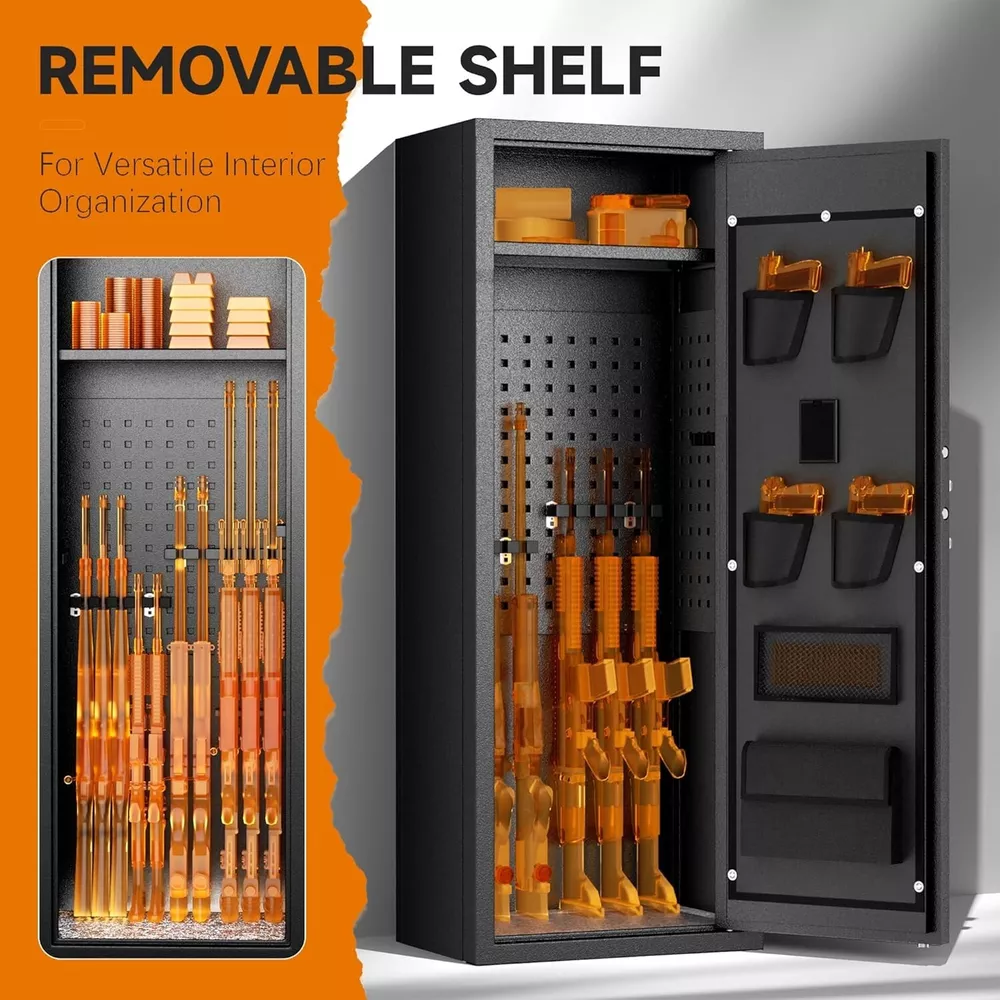 10-14 Gun Safe for Rifles and Pistols,Quick Release Fireproof Gun Safe - NEW About this item [Solid & Durable Material]:Greenvelly 10 gun safe for rifles and pistols made of high density cold rolled steel plate is treated by advanced baking process.This process makes gun cabinet have a good corrosion resistance to high and low temperature and easy to clean. The locking door of the gun safe adopts a high-strength bending process, which brings a good thick feeling and improves the overall stability. Choice [Anti-Theft Design]:Greenvelly fireproof gun safe is characterized by the 4*20mm diameter locking bolts,tamper-resistant steel doors and heavy-duty tamper-resistant hinges.You need the right code and key to open it, and it's hard to pry it open. And we designed reserved holes in the bottom and back for fixing on the wall or Floor.The sturdy construction ensures that guns are kept away from children and prevents theft.The gun safe suit for garage,home,office,etc.. [Size&Large Storage]:Greenvelly gun safe (15.2"D x 21"W x 55.21"H) can store 10 rifles,each one has a adjustable shelf, could hold up to 180lbs;gun racks could be adjusted on the pegboards according to the height of the long guns,meanwhile,the bottom is fitted with a protective pad to prevent damage;The back of the door is equipped with 4 pistol bags, a bullet bag and a handgun bag.You could store goods according to your needs. [Digital Password Lock]:Greenvelly locking large gun cabinet adopt digital unlock module.You could choose 3-8 digits as the unlock password.Besides, the gun safe equipped dual alarm system. There are indicator lights on the digital lock to indicate the opening&closing state or whether the battery is in a low state.The digital password lock can be charged in a low battery sate.And we provide 2 emergency keys,Using a key to open is the second way to open it. [Easy to Install]:Greenvelly is a company of specialized in the gun safe for rifles and pistols.Each gun safe cabinet provides paper and video about Installation instructions. Even if you don’t have any DIY experience, you could easily assemble it.At the same time, we will also answer your questions about the products. Product information Brand Greenvelly Color Black Recommended Uses For Product Guns Product Dimensions 15.21"D x 21"W x 55.2"H Special Feature Alarm System, Combination Lock, Anti-Theft, Removable Shelf, Fireproof Mounting Type Floor Mount Door Style Sliding Doors Included Components Bags, Keys, Shelf, Anchor Bolts Number of Shelves 1 Installation Type Freestanding Top Material Type Steel Back Material Type Carbon Steel Assembly Required Yes Frame Material Metal Number of Compartments 3 Number of Levels 1 Number of Racks 1 Lock Type Electronic Combination Lock Global Trade Identification Number 00784227720896 UPC 784227720896 Manufacturer Greenvelly ASIN B0DG86ZY1G