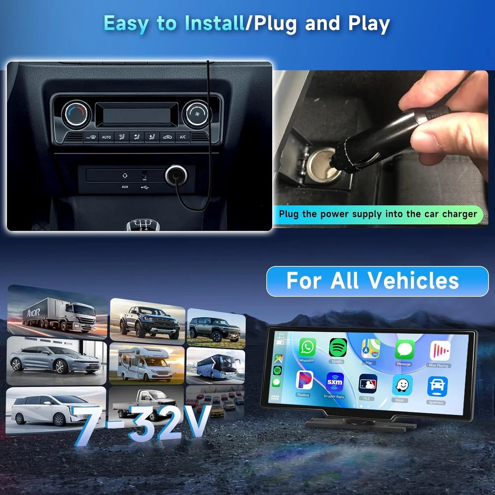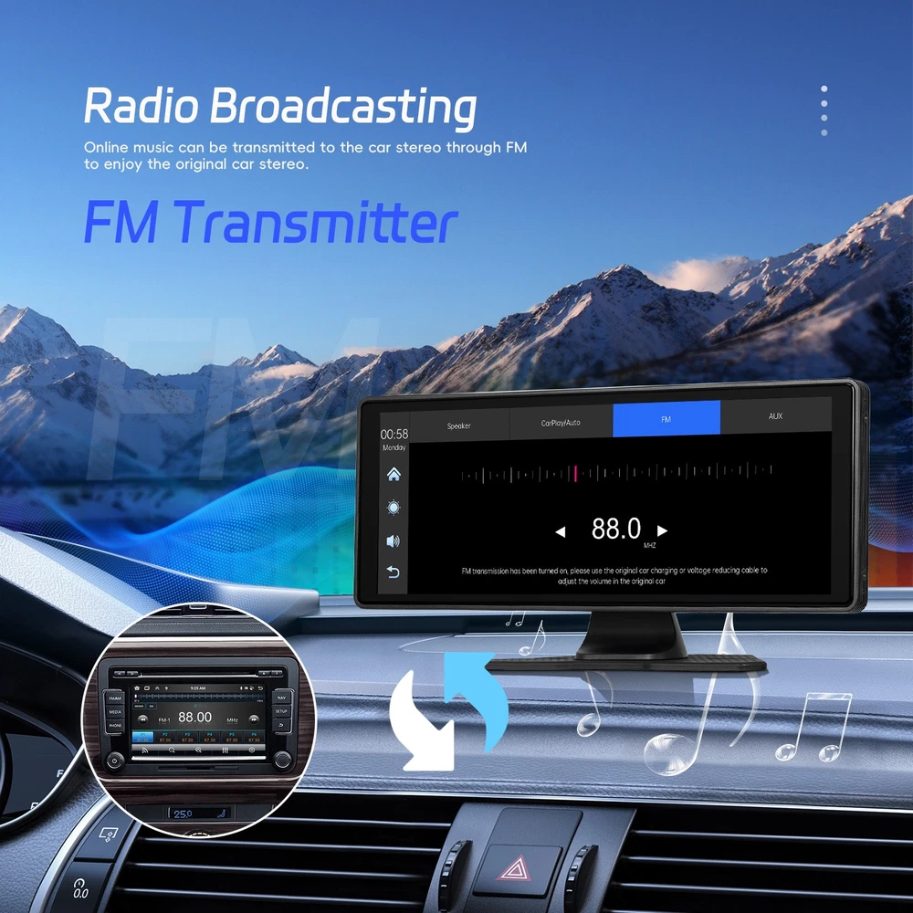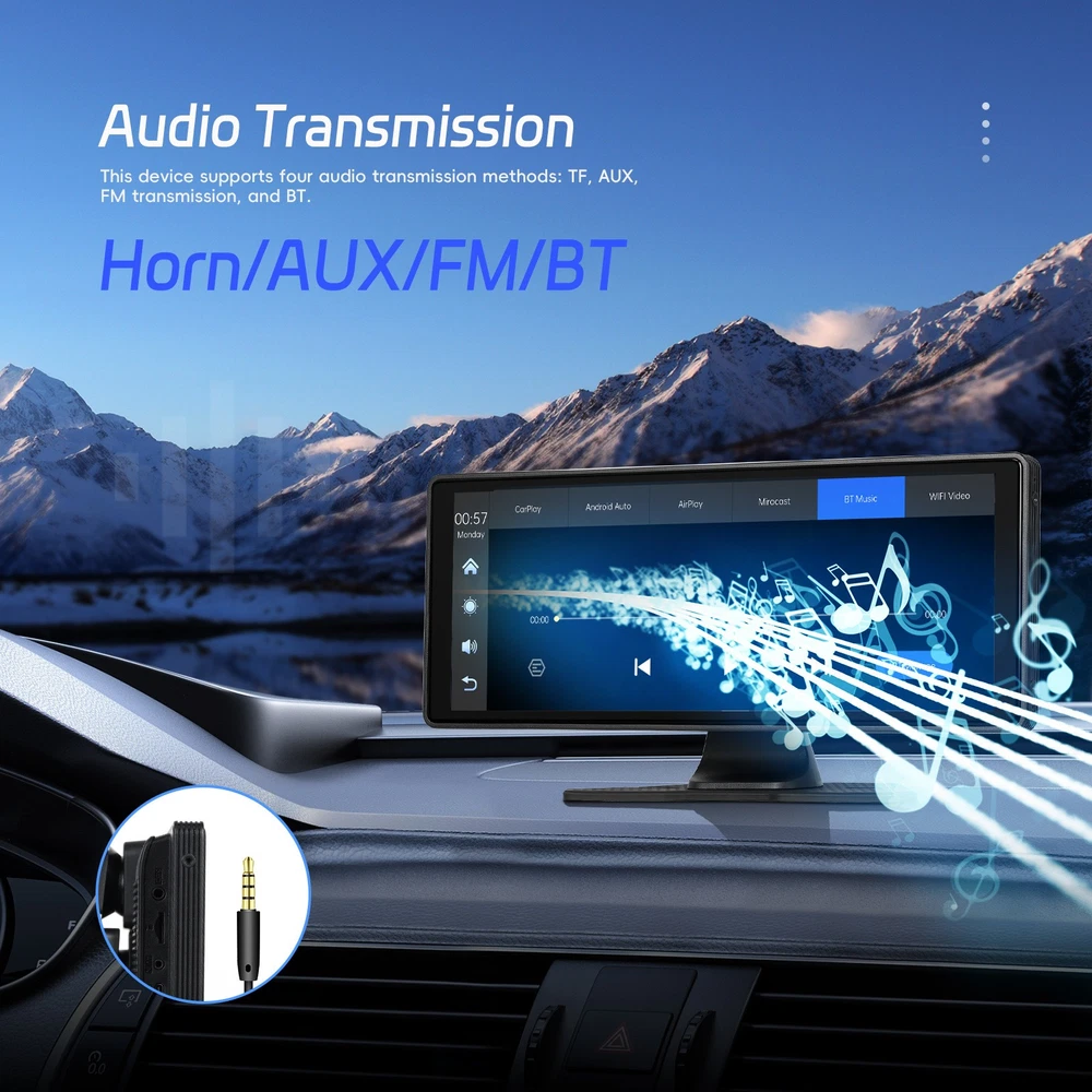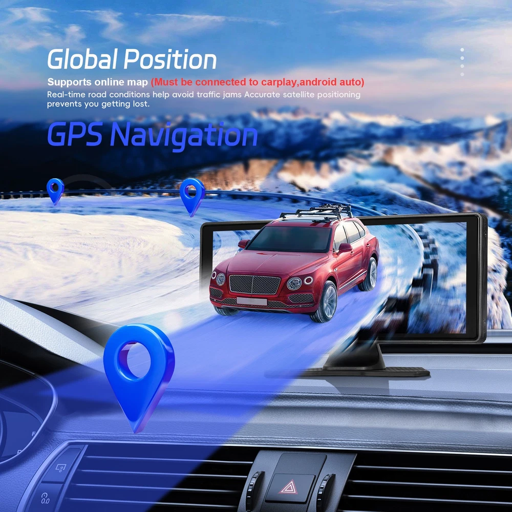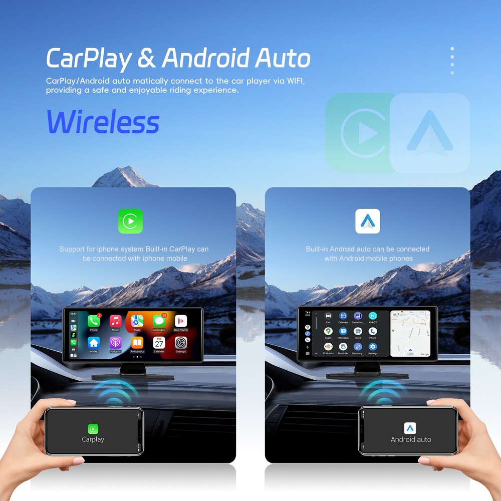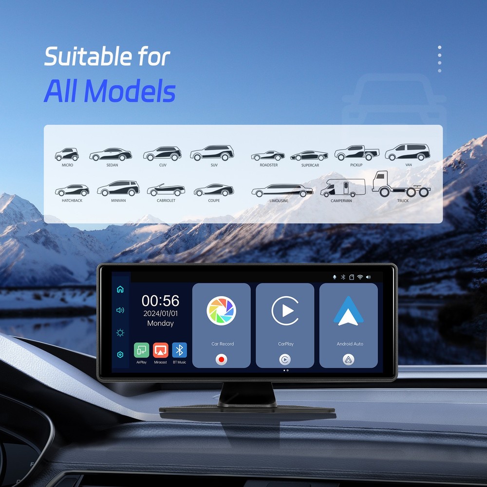 Car Multimedia Monitor Product Description: Feature: 【Front 4K Dash Cam】This monitor support 4K front dash cam. Support loop recording, G-sensor, built in 64G built-in storage for record video. 【Wireless Apple CarPlay & Android Auto】This car multimedia monitor is compatible with wireless Apple Carplay, wireless Android Auto function. 【Apple Carplay & Android Auto Voice Control】Uses your smartphones such as Hi, Siri / Hello Google assistant wirelessly to make calls and play your music without taking your eyes off the road. 【Apple Carplay & Android Auto Navigation】You can use Apple Carplay & Android Auto on line GPS navigation. Such as Apple map, google map, Here we go etc. 【Reversing Image】This monitor can support rear view backup RCA camera image input. It can help you have a safe reversing and parking. (One camera come with the monitor for reversing rear view) 【FM Voice Transmit】Our multimedia monitor have a small speaker. If you want to enjoy your original car audio, you can use FM Transmit function to launch voice signal to your original car radio. 【 TF Card, Bluetooth】This car multimedia monitor can support USB disk, TF card music, video playback. It also can supprot Bluetooth music & handsfree call. 【IPS Touch Screen】10.26 inch screen car stereo with 1600x600P IPS screen, support 2K video playback. Enjoy the features such as maps, movies and more. 【Simple Installation】This car multimedia monitor with the suction mount secures intellidash to your dashboard or windshield and can be easily removed and stored. 【Compatible with 99% vehicle】Our multimedia monitor work voltage is 12-30V. Truck, bus, van, car, both vehicle can be used. It can let everyone enjoy CarPlay & Android Auto. Item Specification: OS: Linux Dash Cam: Supported Screen size: 10.26 inches Dash Cam Resolution: 4K Screen resolution: 1600x600 Radio Transmit frequency: FM 87.5.0~108.0MHz Output power: built-in 1W speaker Working voltage: 12~24V Working temperature: -10~+60℃ Bluetooth version: 5.0 (default name: SWL-BT) Panel size: 245x95 mm/9.65x3.74 inch Steering wheel control: not supported Video output: not supported Offline maps: not supported Built-in speaker: yes TF card: support Reversing video input: support Audio format: MP3/AAC/APE/OGG/M4A/RA/WAV Video format: H263/H264/H265/HD/AVI/FLV/MKV/MPEG/MP4/WMV9/VC/ASF/TS/QT Image format: JPEG/PNG/BMP/GIF/TIFF PACKAGE INCLUDES 1 x Car Multimedia Monitor 1 x Cigarette Lighter Power Cable 1 x Monitor Bracket 1 x Rear View Camera 1 x Rear Camera Input Cable 1 x User Manual 1 x Suction cup holder This car multimedia monitor with the suction mount secures intellidash to your dashboard or windshield and can be easily removed and stored. Our multimedia monitor work voltage is 12-24V. Truck, bus, van, car, both vehicle can be used. It can let everyone enjoy CarPlay & Android Auto. 10.26 inch screen car stereo with 1600x600P IPS screen, support 2K video playback. Enjoy the features such as maps, movies and more. This monitor support 2K front dash cam. Support loop recording, G-sensor, built in 64G built-in storage for record video. This monitor support 4K front dash cam. Support loop recording, G-sensor, built in 64G built-in storage for record video. This car multimedia monitor is compatible with wireless Apple Carplay, wireless Android Auto function.