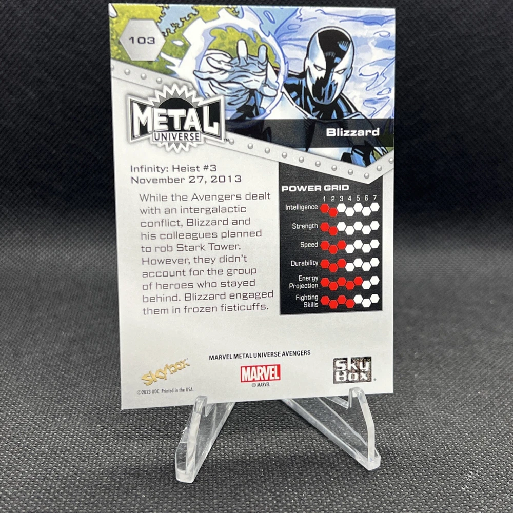 The product is a 2024 Marvel Metal Avengers Universe trading card featuring character #103, Blizzard, from the High Series set. Manufactured by SkyBox, this non-sport trading card is part of the Marvel franchise, specifically the Avengers and Marvel Cinematic Universe (MCU). The card is a base set card and does not come with an autograph. Perfect for collectors of Marvel trading cards, this item captures a piece of the Avengers universe in a visually appealing format.