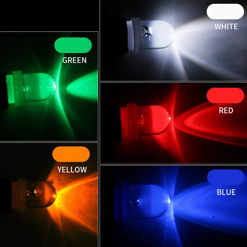 Feature: 100% brand new and high quality Easy i nstall design: plug and play ( If the LED does not light up, simply flip it 180 degrees ) Super bright, Low power consumption , low temperature. DIY in various colors, highlighting personalized lighting. Specification: Voltage: 12 Volts Color: White/Blue/Green/Red/Yellow Bulb type: Raised Lens 1led chip Light Direction: 180 degree Diameter: 12mm Total Height(Length): approx. 28mm The model is the same as the original car, without changing the wiring, directly replacing the original car glass bulb (universal type) (1) No filament structure, extremely low heat generation, and the vehicle control circuit is not easily oxidized; (2) High luminous purity, strong penetration, no need for lampshade filtering; (3) DIY with various colors to highlight personalized lighting; (4) Cold light source, good comfort, energy-saving, belongs to green light source Product features: Can be used as license plate lights, door lights, interior reading lights, glove box lights, trunk lights, etc Package Included: According to your choice