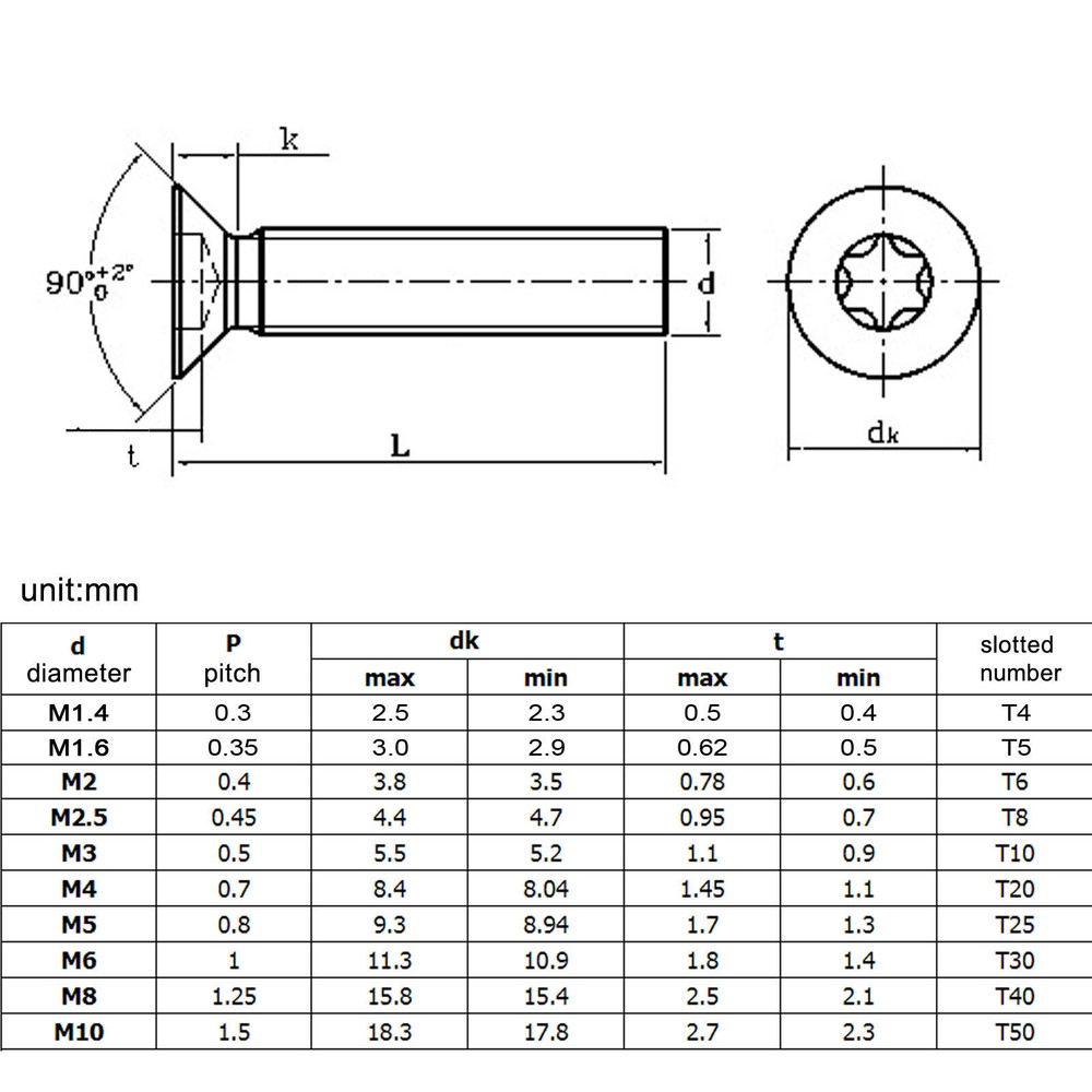 There are 10/50pcs high quality torx countersunk head bolt Screw Description: Material:304 (A2-70) stainless steel Size: d(thread diameter) x L(total length) Metric thread diameter: M1.4 (1.4mm) / M1.6(1.6mm) / M2 (2mm) / M2.5(2.5mm) / M3 (3mm) M3.5 (3.5mm) / M4 (4mm) / M5 (5mm) / M6 (6mm) / M8 (8mm) Metric thread pitch: 0.3mm (M1.4) / 0.35mm(M1.6) / 0.4mm(M2) / 0.45mm(M2.5) / 0.5mm(M3) 0.6mm (M3.5) / 0.7mm(M4) / 0.8mm(M5) / 1mm(M6) / 1.25mm(M8) Thread length:3mm-60mm On Dec 14, 2024 at 20:16:30 PST, seller added the following information: