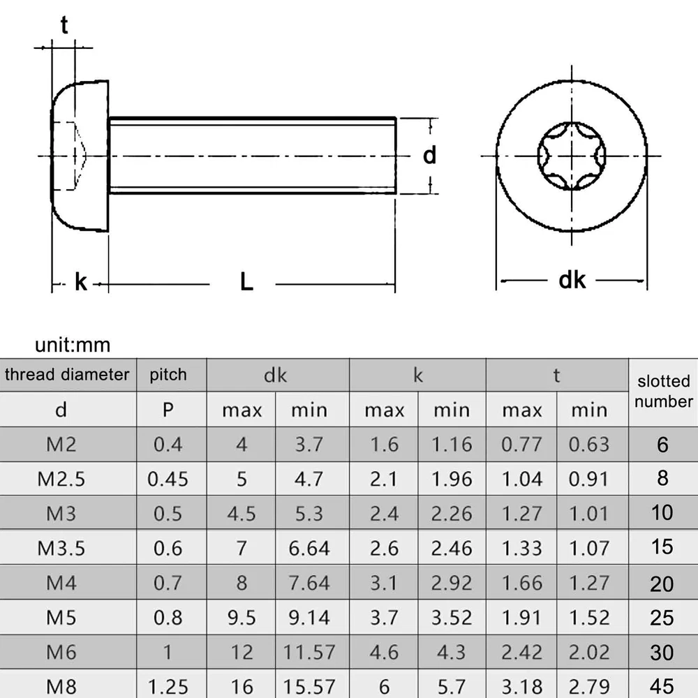 There are 10/50pcs high quality torx pan head bolt Material:304 (A2-70) stainless steel Size: d(thread diameter) x L(thread length) Metric thread diameter: M2 (2mm) / M2.5(2.5mm) / M3 (3mm) / M4 (4mm) / M5 (5mm) / M6 (6mm) / M8(8mm) Metric thread pitch: 0.4mm(M2) / 0.45mm(M2.5) / 0.5mm(M3) / 0.7mm(M4) / 0.8mm(M5) / 1mm(M6) / 1.25mm(M8) Thread length:3mm-80mm On Dec 14, 2024 at 23:16:44 PST, seller added the following information: