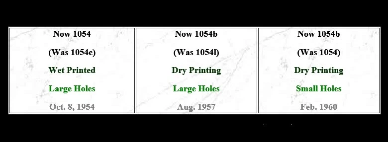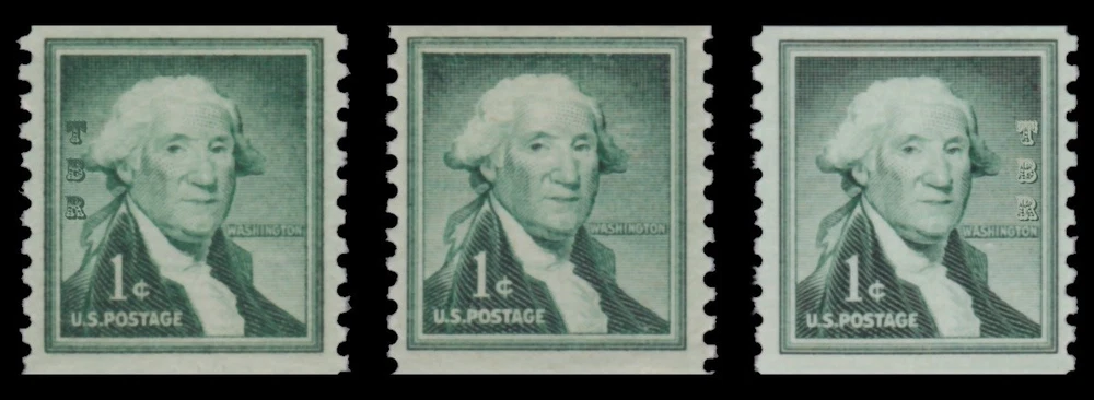 Special Sets Are Stacked in Catalogue Order and Shipped Inside a Protective Case MINT NEVER HINGED GEORGE WASHINGTON 1¢ U.S. COILS Use this chart to identify the stamps Now 1054 (Was 1054c*) Wet Printed Large Holes Oct. 8, 1954 Now 1054b (Was 1054l*) Dry Printing Large Holes Aug. 1957 Now 1054b (Was 1054*) Dry Printing Small Holes Feb. 1960 2017 BROOKMAN CATALOGUE VALUE IS $2.55 - $3.35 The Auction: This is a SPECIALIZED set of three 1 cent definitive stamps FVF and MNH . It contains printing varieties of Scott number 1054* George Washington . The dark green side coils are perf. 10 vert. The stamps are from the Liberty Series coil set which ran from 1954 to 1980 . The definitive regular issues were printed first wet and reprinted later using a dry process. Generally the wet prints have a darker appearance and thinner paper. *In 2015 Scott changed many Liberty catalogue numbers after a half century. The rationale is that the first variety printed should retain the major number 1054. In this case wet stamps were printed before dry so the catalogue numbers needed to be flipped. The minor number 1054b now refers to the dry print variety. It will take years for the number changes to catch on within the philatelic community. Many dealers will continue to use the old numbers while some will switch to the new numbers causing confusion. Rest assured that our identification is current and accurate. We've assembled the set for you and there is no guesswork. All stamps are extremely fresh and guaranteed to be accurately identified. Some of the beautiful coils may have very fine centering. There is a 30% premium for VF but we offer better quality at our regular low price! If you purchase 2 sets we will send pairs . See below for magnified comparison of hole sizes. LARGE HOLES SMALL HOLES 1054v 1054l 1054s 1054bl 1054bs one-cent 1-cent $0.01 .01 1¢ 1c Please read this before bidding on this auction Stock photo. The actual stamps may be different from this display, however we guarantee that they will be comparable or better condition or fully refunded. The logos in the images are added digitally and are not printed on the actual stamps. The black background display mount is not included. For pane singles the straight edge position may vary. For blocks/strips the position order will always be exactly as pictured. Purchasing is self service. If you do not understand our terms please feel free to contact us for an invoice. We typically will not send a manual invoice because we have no way of knowing when you are done shopping until you ask. You will need to please pay combined. You will receive individual notifications from eBay with payment information after each item. You are free to combine and pay at any time that you are ready. Payments should be made within " reasonable time " following purchase. If this is not possible then please contact us ahead of time to make payment arrangements. Please do not pay for items separately (one at a time). This increases the fees that both eBay and PayPal charge us. Higher business costs means that we have to raise our stamp prices. Example - When purchasing more than 1 item, please Do Not immediately click confirm and pay now after each item that has been clicked buy now. Simply wait until you have all the items you want and then pay all together in one payment. Payment should automatically combine. If it does not please contact us. If you need to use checkout, please do it once to request a combined invoice. Please message us at any time. We welcome all questions or comments! Important information about Shipping & Feedback Regarding Shipping: Items will be shipped together ( even if you ignore these polite reminders and pay separately). Shipping is always free to USA. We actually lose money on shipping and have not raised our rates in over 15 years! The security of your order is guaranteed by our special packaging. Tracking is provided when available. We ship Internationally but not to every country in the world. Please verify postage rates before purchasing. Large International orders will be shipped via US Registered Mail at current rates. Please understand that Registered International mail might take as long as a month to deliver after we have posted it and patience is appreciated. We always ship at earliest convenience. This means that a mail-run may occur multiple times a day. We have no control over the speed of mail, but have found the USPS to be very reliable. We strive to be competitive in all aspects of the eBay market. If for any reason you are unhappy we hope that you will contact us for quick resolution. Regarding Feedback: Feedback is left following the conclusion of each transaction. Feedback is not left immediately because the transaction is not over until you have your stamps and we know that all is well. The fastest way to receive feedback is to leave it for us and we should soon respond in turn. We always leave feedback for each positive transaction. There is never a need to ask us. We never send messages to customers asking for feedback but hope that they will choose to leave a positive. We would rather work things out but reserve the right to refuse service to anybody at any time. Stamp collectors as a whole are very honest people. A few bad apples attempt to manipulate the system for personal gain or other reasons. These parties are blocked. We politely ask blocked bidders not to contact us. Thank you for visiting TBR of Arizona Helpful Links Other Liberty Issue stamps can be found at by clicking below. To learn more about " Tagging " please check our e b a y guide. Guide to Tagging on Stamps Vote " Yes " if this is helpful APS #194435 USSS #14735 PNC #2283 Satisfaction Guaranteed! "All stamps will be genuine, Mint Never Hinged, Full Original Gum, and free from defect or your money fully refunded." Thank you! TBR STAMPS of Arizona © COPYRIGHT 2018 TBR STAMP SHOP r5.5