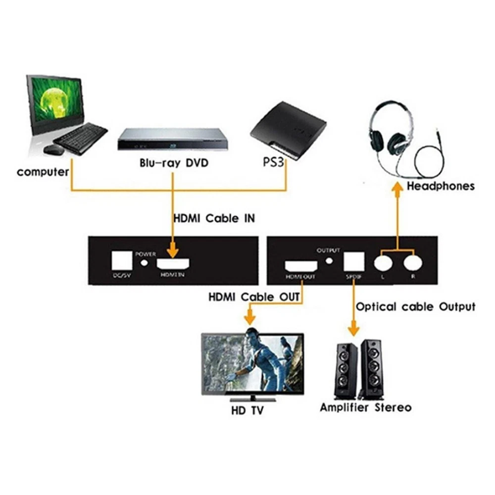 NEW-00023 1080P HDMI To HDMI+SPDIF+ R/L Analog Audio Output Converter Connecter Splitter c PRODUCT DESCRIPTION Description: One HDMI input convert to one HDMI + Audio (SPDIF + R/L) output One audio support: SPDIF + R/L analog Audio Output Input Resolution: Up to 2160P. HDMI to achieve the synchronization of audio signal separation. There are PASS / 2.0CH / 5.1CH three kinds of audio mode options. LED indication: When source of sink is working, corresponding LED is light. Supports for Apple TV and various Blu-ray player. Input Resolution: Up to 2160P. Need DC5V / 1A power input (We only offer a Power USB cable) Specification: HDMI resolution: 24/50 / 60fs / 1080p / 1080i / 720p / 576p / 576i / 480p / 480i Support video color format: 24bit deep color 30bit,36bit Audio output: L/R+SPDIF Max bandwidth: 225MHz Max baud rate: 6.75Gbps Input/Output TMDS signal: 0.5~1.5Volts p-p(TTL) Input/Output TMDS signal: 0.5~1.5Volts p-p(TTL) Input cable distance: ≤15m AWG26 HDMI standard cable Output cable distance: ≤20m AWG26 HDMI standard cable Power Supply: DC 5V (Need DC5V/ 1A power input, We only offer a Power USB cable) Max working current: 500mA Power adapter format: Input: AC(50/60Hz)100V-240V; Output: DC5V/1A Operating Temperature range: (-15 to +55°C) Operating Humidity range: 5 to 90%RH(No Condensation) Dimension(LXWXH): about 84.5 x 61.8 x 21(mm) Weight: about 135g Package included: 1 x HDMI Converter 1 x USB Power Cable 1 x User Manual Shipping Contact Us Our products have been sent to the US warehouse. All items will be shipped via WINIT CORPORATION. In 2-5 working days, you will receive your items. Thank you and have a nice day. If you have any question about us or items, please contact us, we will reply it as soon as possible. Shipping Our products have been sent to the US warehouse. All items will be shipped via WINIT CORPORATION. In 2-5 working days, you will receive your items. Thank you and have a nice day. Contact Us If you have any question about us or items, please contact us, we will reply it as soon as possible. PaymentShippingReturn policyAbout usContact us Copyright © - Tongtool All rights reserved | Design:Tongtool