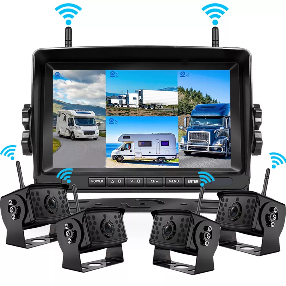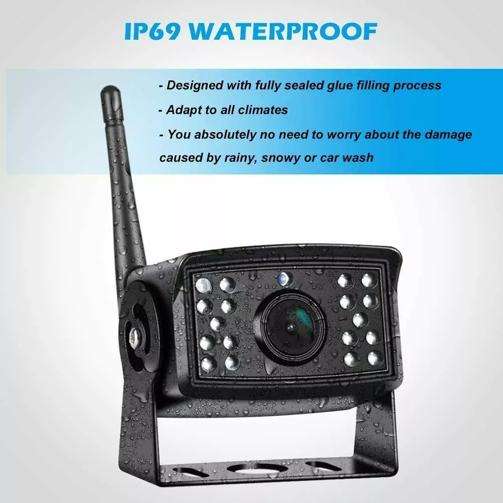 FHD 1080P Digital Wireless Camera 7" Monitor High-Speed Observation System 1 Year Warranty & Free ReturnDigital Wireless 7" Quad Monitor Loop Recording DVR System-IPS Screen+HD 1080P 18 IR LEDs Reversing Camera Night Vision Waterproof-IP69 100m Working Range 12-24v For Caravan Truck Trailer Motorhome Van Features: 1, This system can be used on RVs.Trailers, Box Truck/ Motorhome,5th wheels etc 2, The monitor screen can set default start up/off auto when power come on/off, We provided a car charger adapter with on/off switch to control the monitor. 3, The Camera is IP69K enables to work well at rainy days ,waterproof with 18 LED IR Night Vision 4, The menu could on/off backup guide lines and switched between rear view/side view/rear view 5.360° Rotation Bracket: 360°Rotation Bracket ,Strong suction and washable mount,the mount for monitor is removeable and reuseable.Two ways monitor installation. 6, Dual Long Wireless Antenna design make its wireless signal more stable, less interference than analogue kit 7" Monitor Specification: with Dual Antenna Design to enhance wireless signal, make its working range 50-100m-effective Effective Pixels:1280(H)*1024(V)Pixels/NTSC Screen Size: 7 inch Display Component: Color TFT LCD Screen ratio 16:9 adjustable Housing Material: ABS Video Frequency: PAL/NTSC Power: DC 9V-35V Rear view Camera Specification: The product itself 100% safety and met any FCC/CE/RoHS/UL/IP69K standard Resolution: 1080P Lens Viewing Angle: 150 Degrees Waterproof IP Rate: IP69K Power: DC12V-24V Package Included: 1 x Back up Camera 1 x 7 Inch Quad DVR Monitor 3 x Antennas 1x Inductor 2 x Power Cable 1x Mount Bracket 1 x Charger Adapter with on/off 1 x User Manual