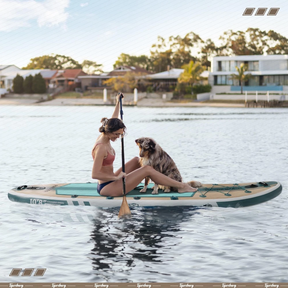 PANDORA Paddle Board Collection: Your Ultimate Water Adventure Companion! Experience the thrill of water adventures with PANDORA Paddle Boards, designed for stability, balance, and style. At 10.8 feet long, 34 inches wide, and 6 inches thick, these boards are perfect for beginners and enthusiasts alike, offering a secure platform for all ages. The stunning design features wood grain patterns and retro colors, ensuring you stand out. Capture every moment with the camera base, suitable for various water cameras. The board includes a double-head multi-purpose wood grain paddle for kayaking and stand-up paddling, an innovative paddle buckle for easy management, and an upgraded seat with extended wings for comfort. Travel easily with the included backpack, featuring a waist buckle bag and cushioned straps. Versatile and suitable for water yoga, leisure paddling, or adventurous excursions, the PANDORA Paddle Board is your go-to for diverse water activities. Elevate your water experiences with style and excitement with the PANDORA Paddle Board Series! 【Extra-Large Dimensions for Stability】Pandora collection Inflatable Paddle board, at 10.8'x34"x6", provide a significantly larger surface area compared to standard Paddleboards. Max Paddleboard rider weight 400lbs and Max loading capacity 600lbs.This extra size ensures greater stability and balance, making it perfect for beginners or anyone practicing water-based activities like yoga. 【Advanced Functionality for Enthusiasts】Stand-up Paddle Boards are equipped with a camera base allowing adventurers to capture their amazing paddleboarding moments. They also feature a unique paddle support system that can store your paddles without taking up space, freeing your hands to enjoy leisure time without worrying about the paddles being lost. 【Multipurpose Double-Blade Paddle and Enhanced US Fin】The double-blade paddle serves dual purposes, usable as a single-blade paddle for stand-up paddling or a double-blade for kayaking. The US touring paddleboard's fin with wider base for better tracking and more stability. 【Ergonomic and Portable Design】Inflatable SUP Attention to comfort is evident in the upgraded Kayak seat with extended wings for better back support, and the ergonomically designed backpack with added padding and a waist buckle for easy transport. These elements make carrying and using the paddle board a comfortable and enjoyable experience. 【Stylish Aesthetics with Color Variety】Paddle boards come in three striking colors - Verdigris Green, Indian Black, and Chili Red, each enhanced with a chic wood grain pattern. The unique color palette and design lend sup boards a sophisticated and retro look, PANDORA series paddle boards are not just visually appealing but also engineered for performance, comfort, and versatility, premium choice for wide range of paddle boarding enthusiasts.