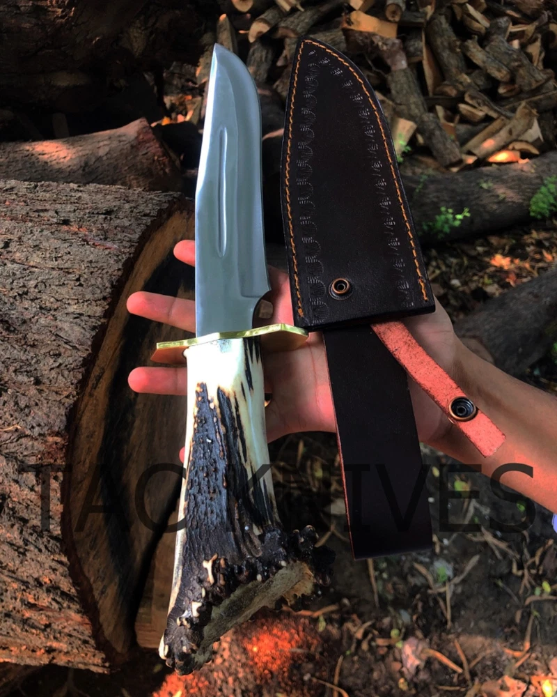 Product Details Overall Length:13" Handle Length: 5" Blade Length: 8" Blade Material: 1095 Steel Handle Material: Brass Guard And Elk Handle Includes a hand stitched custom full-grain leather sheath