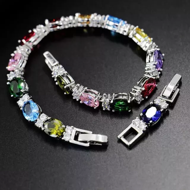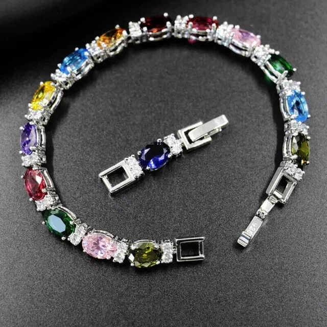 Shape: Round Type: Bracelet Personalize: Yes Secondary Stone: Diamond Seller Warranty: Yes Country/Region of Manufacture: India Signed: No Main Stone Treatment: Not Enhanced Main Stone Width: As per picture Metal: Sterling Silver Era: Undated Number of Gemstones: As Per Picture Main Stone Depth: As per picture Brand: karunas-76 Style: Tennis Theme: Beauty Base Metal: Sterling Silver Main Stone Creation: Simulated Main Stone Color: Multicolor Features: Engraved Setting Style: Prong Main Stone Length: As per picture Main Stone: Sapphire Handmade: Yes Closure: Spring Ring Charm Type: Snap Country of Origin: India Material: Stone, Metal Chain Type: Cable Customized: Yes Sizable: Yes Cut Grade: Excellent Main Stone Shape: Oval Antique: No Item Length: As per picture Metal Purity: 925 Occasion: Anniversary, Birthday, Christening, Christmas, Engagement, Graduation, Mother's Day, Valentine's Day, Wedding Gemstone Clarity Grade: NA Wholesale: Yes Vintage: No Color: White