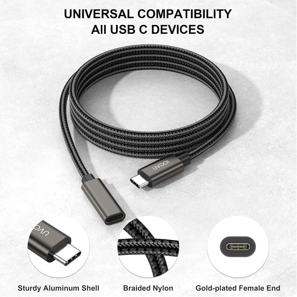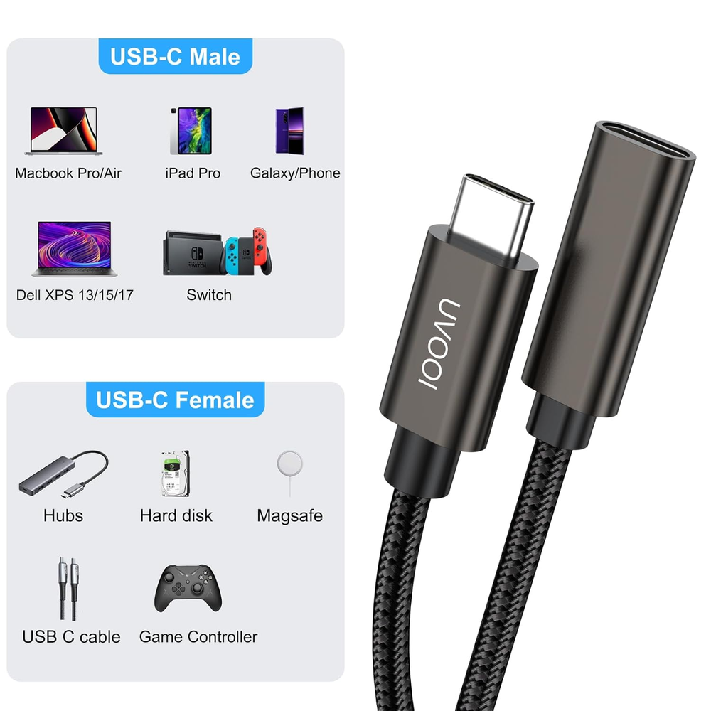 【10FT USB C Extension Cable】USB 3.2 Type C Extension Male to Female data transfer and fast charging cable, which is used to extend the use of long distance USB type-c devices. Compatible with Samsung,Macbook,Tablt,iPad Air Mini Pro and More. It perfectly works for the majority of USB C enabled devices. 【100W Fast Charging & 10Gbps Data Sync】USB C extender cable support PD3.0/QC3.0/QC4.0 fast charging up to 100W, which is ensured by high-speed safe charging. The USB C female to male cable supports up to 10Gbps data transfer, which transferring HD videos or just back up your files in seconds. A hard-wearing nylon braided and a bulletproof fiber core that can withstand up to 20000+ bends. Ensure long-term use. 【UHD 4K Video】USB type C extension support up to 4K(3840x2160) and 1920x1200, 1080P@60Hz Video&Audio signal transferring. you could extend the connection to a larger/portable monitor for e-learning, working, gaming or watching movies. 【Plug and Play】This 10FT/3M USB-C Extension Cable could enlarge the scenes in your daily life. Besides the scenes of other shorter cables applied for, you could also connect your devices to your laptop/phone while siting on a couch or bed at home or in a hotel. 【Broad Compatibility】Compatible with type c phones, like iPhone 16/15 series, Galaxy S24/S23/S22 Ultra/S21/S20/Note 20/Note 10, Chromebook Pixel. And MacBook Pro/ iPad Mini/Pro, M1 Macbook Mac mini, Dell XPS 13/ 15 and more. (NOTE: This usb c extender does not work with any active Thunderbolt 3 docking stations/ hubs/ cables.) Product Description USB C Extension Cable 10FT Male to Female Specifications: Input: USB Type C Male Output: USB Type C Female Length: 10 Feet Fast Charging: 100W Fast Charging, which will incredibly fast fuel your Samsung S21 up to 80% in 35mins, which brings a convenient charging experience. Data Transfer: 10Gbps Data Transfer Sync, which is 10X faster than USB 2.0 cable and just back up your files in a second. Resolutions: 4K Incompatible Device: Does not work with any active Thunderbolt 3 docking stations/ hubs/ cables Note: 10ft extension cable may have some speed drop due to long transmission distance, but it will not affect use Widely Compatibility - The USB c extension cord is compatible with iPhone 16/Pro/Max, iPhone 15/Pro/Max, Galaxy S24/ S23/ S22/ S21/Note 20/Note 10 etc -Compatible withall USB C hub, Mag-safe Wireless Charger, oculus link cable, Switch, iPad Pro, Surface Go, iMac Pro, MacBook Air, MacBook Pro, Google Chromebook Pixel 9/8/7/6, Laptop, Dell XPS 13/ 15 and more. -USB C extender cable perfectly works for the majority of USB C enabled devices. Incompatible devices list - All Dell Thunderbolt Dock / Hub / Base, e.g. Dell Business Thunderbolt Dock TB16 with 240W Adapter - All models of GoPro Camera - Apple Multi-media Adapter (USB 3, HDMI, USB C (charge pass through) Incredible Performance Built-in Advanced IC Chip, designed to improve the transfer speed and stability. Support 4K Video Support up to 3840x2160@60Hz, 1920x1080P@60Hz video signal. Fast Charge Extender the Length of Your USB C Cable for Charging and Data Syncing.