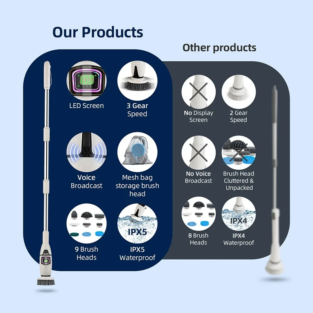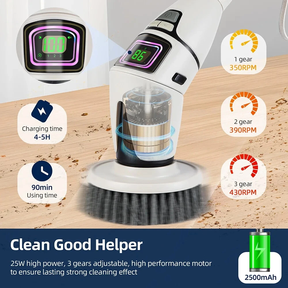 Electric Cleaning Brush Feature 1.Clean good helper. 25W high-power equipped with 2500mAh lithium battery, use time 90 minutes, charging time 4-5 hours, 3 kinds of speed 350/390/430RPM, high-performance motor to ensure durable strong cleaning effect. 2.Effortless cleaning. A variety of brush heads, multi-scenario application, to meet the whole house surface deep cleaning and home or car polishing and waxing. 3.Time & effort saving. Electric operation, free your hands. 9 multi-function replaceable brush heads and 1 brush tray holder, mesh bag and rag are provided. Use brush heads to treat stubborn dirt in bathtubs, dead ends, crevices, or to retouch surfaces such as glass, tile, cars, and furniture. 4.IPX5 waterproof. Type-C charging port is waterproof, with high strength sealing and waterproof capability. Note: The host can be rinsed, but not soaked. 5.Adjustable brush head, ergonomic design, adjustable brush head Angle. 6.Extendable rod. The electric cleaning brush is equipped with a detachable and retractable metal extension rod, allowing easy access to tight corners and high spots, making cleaning under furniture, around faucets, and in ceiling corners a breeze. 7.The voice announcement function can prompt and guide operations, as well as provide real-time feedback on working status and mode. Installation & Removal Brush Head Methods Hand ①Install brush head Press hard, hear a "click”sound. ②Remove brush head Grab the brush head, pull it out firmly. Foot ①Install brush head Press hard, hear a "click”sound. ②Remove brush head Put your foot on the brush head, pull it out firmly. Install connecting rod method ①Connecting rod into the main machine. ②Marble ejection installation is complete. Telescopic rod use method ①Rotate the grip to the left. ②Pull out the length and tighten to the right. Specification Item type: Electric cleaning brush Charging voltage: 5V2A Rated power: 25W Battery content: 2500mAh Charging time: 4-5 hours Using time: 90min Rotation angle: 120-180° Speed: 350/390/430RPM Product Include 1* Main machine 1* Storage bag & cloth 1* Large flat brush 1* Small flat brush 1* Pointed brush 1* Spherical brush 1* Small brush tray 1* Wire brush 1* Small mop pod 1* Imitation wool brush 1* Fiber brush 1* Sponge brush 1* Connection rod 1* Telescopic rod 1* Type-C cable 1* Manual 1* Box