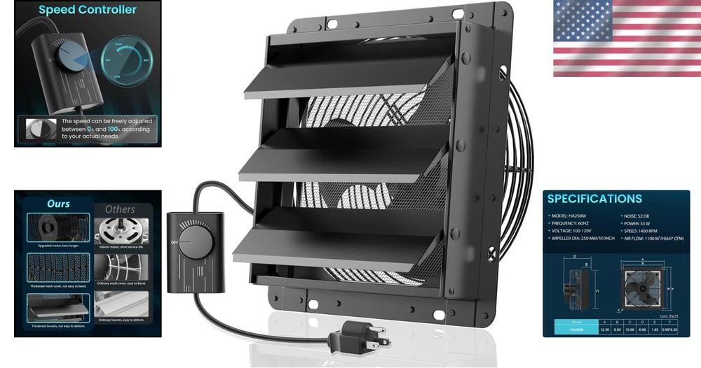 Efficient 10-Inch Shutter Exhaust Fan - Perfect for Ventilation and Cooling ‹ › ‹ › ‹ › ‹ › ‹ › ‹ › ‹ › ‹ › ‹ › ‹ › ‹ › Efficient 10-Inch Shutter Exhaust Fan Perfect for Ventilation and Cooling Upgrade Your Air Quality - Introducing the newest version of our acclaimed 10-Inch Shutter Exhaust Fan! Key Features: Thicker Construction: The new model boasts enhanced materials, ensuring a more robust design to resist deformation during transportation. High Airflow: Enjoy an impressive airflow of 647 CFM (1100 m³/h) that effectively circulates considerable volumes of air. Energy Efficient: Operating at just 42 Watts, this fan combines power with energy conservation. Adjustable Speed Control: Features an infinity speed controller, allowing you to customize airflow from a gentle breeze to a strong gust. Built-in Mesh Screen: Keeps out debris, ensuring safety for children and pets while allowing fresh air in. High Speed, Low Noise: With a maximum speed of 1400 RPM, operate quietly while achieving remarkable performance. Customizable Filter Installation: A metal filter mesh is included but not pre-installed to fit your preferences. Why Choose Our Exhaust Fan? The 10-inch exhaust fan is engineered for exceptional performance and sustainability. Enjoy fresh air circulation in your home, workshop, or greenhouse, while maintaining an energy-efficient and peaceful environment. With our commitment to providing green ventilation solutions, experience a perfect blend of quality and reliability. Order your Efficient 10-Inch Shutter Exhaust Fan today and elevate your air quality! Shipping Free & Fast Shipping - We offer free shipping to most of the USA with a normal delivery time of 3-7 days. However, due to the current situation, additional delivery time (up to 3 weeks) may be required for some items. Alternative Carriers - We may use alternative carriers (e.g. USPS, FedEx, UPS, etc.) to ensure your package arrives safely and on time. Due to the use of multiple carriers, we are unable to provide a tracking number automatically. Handling Time - Orders are processed and shipped within 1-2 business days of receiving cleared payment. Shipping Restrictions - Shipping to Alaska, Hawaii, Puerto Rico, Guam, and other US territories may incur shipping charges or delivery restrictions. Please contact us before ordering, or your order can be refunded/cancelled. State Restrictions - There may be restrictions based on your state of purchase. For example, certain items may not be shipped to California due to state regulations. Contact for Tracking Updates - If you require tracking updates or have any concerns about the delivery of your order, please feel free to contact us, and we will be happy to assist you. Return 30-Day Hassle-Free Returns - We want you to be completely satisfied with your purchase. If you are not, you can return the item within 30 days of receiving it for a full refund or exchange. Easy Return Process - To start a return, simply contact us and we will provide you with a prepaid return shipping label and detailed instructions. Restocking Fee - There are no restocking fees for returns. However, the buyer is responsible for return shipping costs if the return is not due to a seller's error. Refund Processing Time - Refunds will be processed within 5 business days of receiving the returned item in its condition. Payment We accept all major credit cards, PayPal, and Apple Pay for your convenience. Your payment information is secure and encrypted to ensure a safe and seamless transaction. Please complete your payment within 3 days of purchase to avoid any delays in shipping. Feedback Your feedback is extremely important to us. We strive to provide the best products and customer service possible. If you are satisfied with your purchase, please take a moment to leave us a positive review. If you have any concerns or issues with your order, please contact us before leaving negative feedback. We are committed to resolving any problems and ensuring your satisfaction. Contact Us If you have any questions or concerns, please feel free to out to our customer support team. You can contact us through the eBay messaging system. We are available Monday to Friday, 9:00 am to 5:00 pm EST, and we will do our best to respond to your inquiry within 24 hours. Buy it now and enjoy a pleasant shopping experience! Unit Quantity: 1 Material: Aluminum Features: Adjustable Speed Control,Built-in Mesh Screen,Water Resistant Room: Attic,Bathroom,Bedroom,Dining Room,Garage,Kitchen,Living Room,Home Office,Chicken Coop,Shed,Workshop Mounting: Ceiling,Wall,Window Power Source: Electric,AC Control Style: App Control,Button Control Type: Exhaust Fan Ventilation System: Exhaust Fan Color: Black Item Depth: 6.69 in Item Height: 12.36 in Item Diameter: 10 in Number of Blades: 4 Number of Speeds: 3 Voltage: 110 V Finish: Painted Power: 42 W Operating Sound Rating: 52 dB
