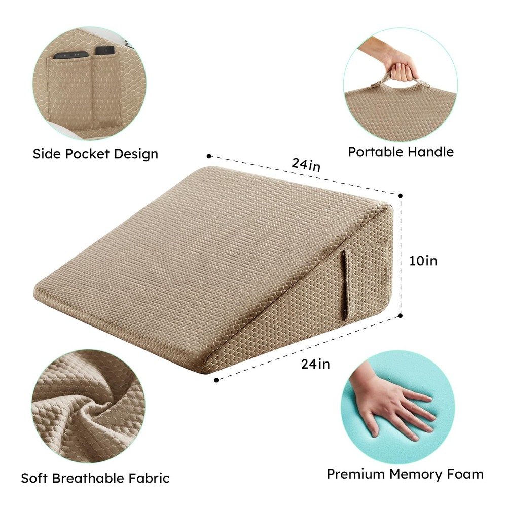 Wedge Pillow for Sleeping, Bed Wedge Pillow, Body Pillow for Back Support, Leg Elevation, Gerd Acid Reflux, Neck Pain, Snoring, Triangle Pillow Wedge - Cooling Memory Foam Top, Removable Washable Cover Versatile wedge pillow design provides superior comfort and support for sleeping, reading, sitting up in bed Features cooling gel-infused memory foam top layer and high-density premium foam base for comfort and support Breathable, removable and machine washable cover allows airflow and easy cleaning Built-in pockets to store items; Portable handle for easy transport. Upgraded foam meets CertiPUR-US and Oeko-Tex standards for durability and safety