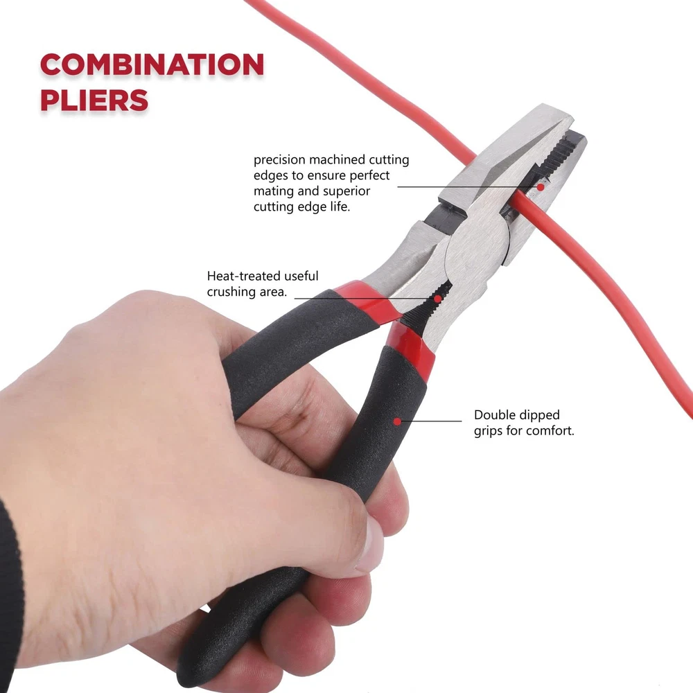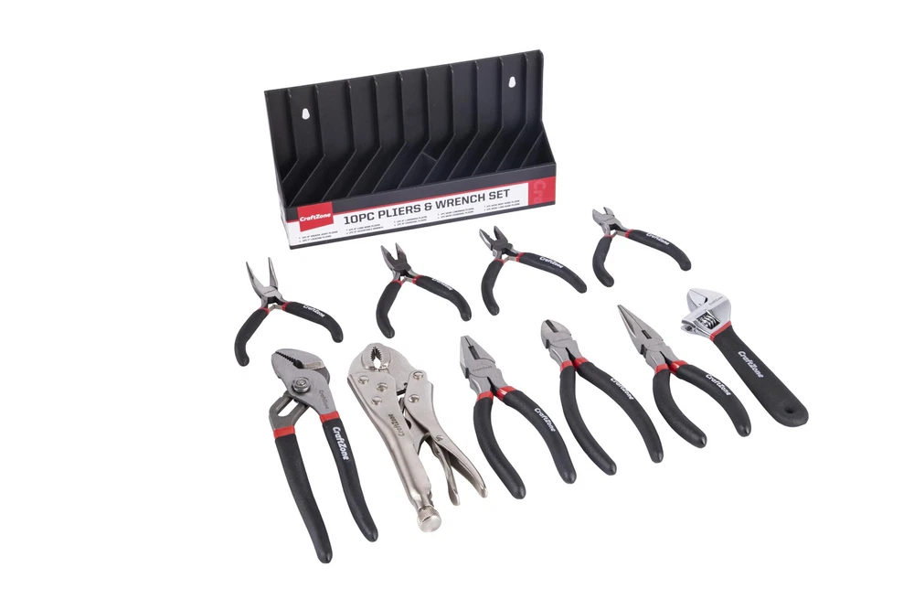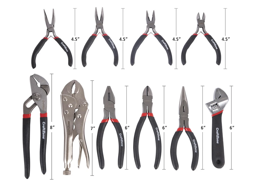 [DROP FORGED POLISHED STEEL] Durable alloy steel construction forged with a heat treatment to ensure reliable, long-lasting strength. [EASY TO ] Handy storage rack is made of durable ABS plastic. [COMFORT GRIP HANDLE] Double-dipped coating to ensure safe and secure non-slip handling. [CONVENIENT USE]Nine basic type pliers and adjustable wrench in multiple sizes for use on almost any object. [INCLUDE] Locking Pliers, Long Nose Pliers, Diagonal Pliers, Groove Joint Pliers, Linesman Pliers , mini pliers and Adjustable Wrench. [SERVICE] If you have any problem with our tool set or are not satisfied with the product, please feel free to us, we will do our best to serve you.