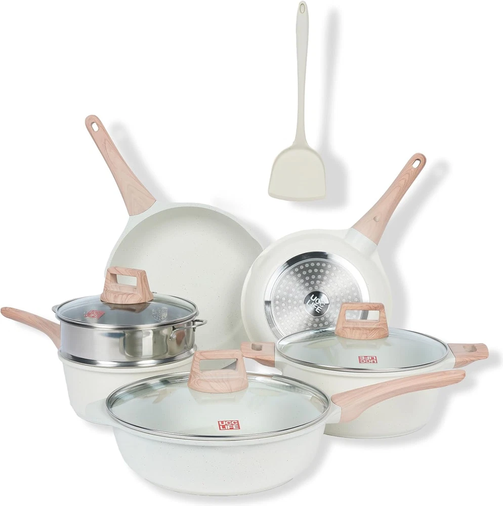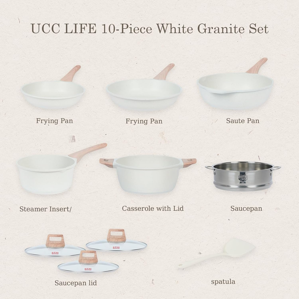 This cookware set is made from Does not contain PFOA and PFOS nonstick granite for easy and effortless cleaning. The unique granite material prevents food from sticking to the surface, reducing the need for oil, cleanup faster and making your meals healthier Versatile Cooking Set:10 Piece Cookware Set Includes 11 inch Frying Pan, 9.5 inch Frying Pan, 4.5 QT Saute Pan with Lid, 4.3 QT Casserole Pot with Lid, 2.4 QT Saucepan with Lid and steamer, White Silicone Spatula. Our favourite non-stick pots pans set meets all your needs for everyday cooking Easy to Clean - Because of the pots and pans set non stick material, just wipe it with a paper towel or rinse it with water, hand washing is recommended as it can be easily cleaned Uniquely Durable Bakelite Handle - With good heat-resistant properties, so you don not have to worry about burning your fingers when picking up pots and pans. Unique glass lid design allows you to check the changing status of food at any time Suitable For All Stoves: Designed with an extended bottom for quick and even heating, this granite induction kitchen cookware set is compatible with all cooktops, including induction,gas,ceramic,electric, providing versatility for various cooking environments UCCLIFE provides 12 months warranty from the date of purchase. Please don't hesitate to reach out if any quality problem. You will be guaranteed to get satisfying solution Product Description Compare with similar items Add to Cart Add to Cart Add to Cart Add to Cart Add to Cart Add to Cart Customer Reviews 4.2 out of 5 stars 57 4.2 out of 5 stars 57 4.2 out of 5 stars 57 4.4 out of 5 stars 81 4.4 out of 5 stars 81 4.4 out of 5 stars 81 Price $43.92 $ 43 . 92 $54.92 $ 54 . 92 $119.92 $ 119 . 92 $69.92 $ 69 . 92 $76.92 $ 76 . 92 $99.92 $ 99 . 92 Pieces 9 Pcs 17 Pcs 30 Pcs 15 Pcs 17 Pcs 22 Pcs Material Hard Anodized Cast Aluminum Hard Anodized Cast Aluminum Hard Anodized Cast Aluminum Hard Anodized Cast Aluminum Hard Anodized Cast Aluminum Hard Anodized Cast Aluminum Handle Detachable Detachable Detachable Integrated Integrated Integrated PFOA, PFAS, PTFE,Pb,Cd Free ✔ ✔ ✔ ✔ ✔ ✔ Dishwasher Safe ✔ ✔ ✔ ✔ ✔ ✔ Oven Safe ✔ ✔ ✔ ✔ ✔ ✔ Induction Compatible ✔ ✔ ✔ ✔ ✔ ✔ Utensil Sets ✔ ✔ ✔ ✔ ✔ ✔