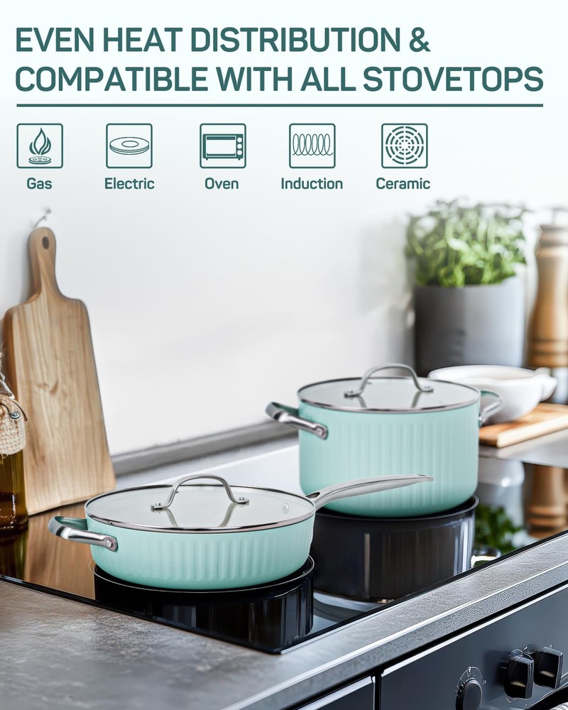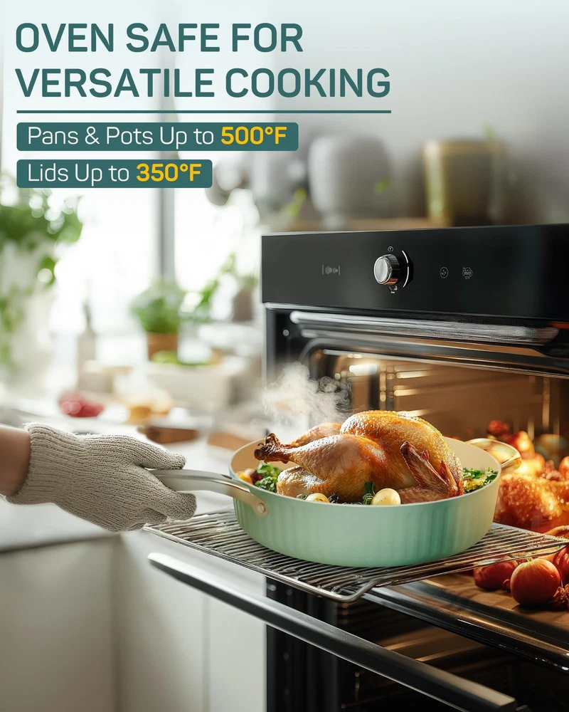 This cookware set is a game-changer! The ceramic coating makes cooking and cleaning effortless, while the stylish green design adds a pop of color to my kitchen. The sturdy handles stay cool, and the glass lids let me monitor my food without lifting. The included wooden utensils complete the elegant look while being practical. Everything heats evenly and cooks beautifullyโno more stuck-on food! Perfect for everyday meals and entertaining. Highly recommend for anyone wanting both performance and style in their kitchen.