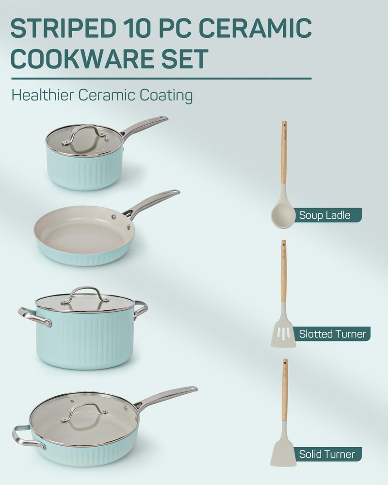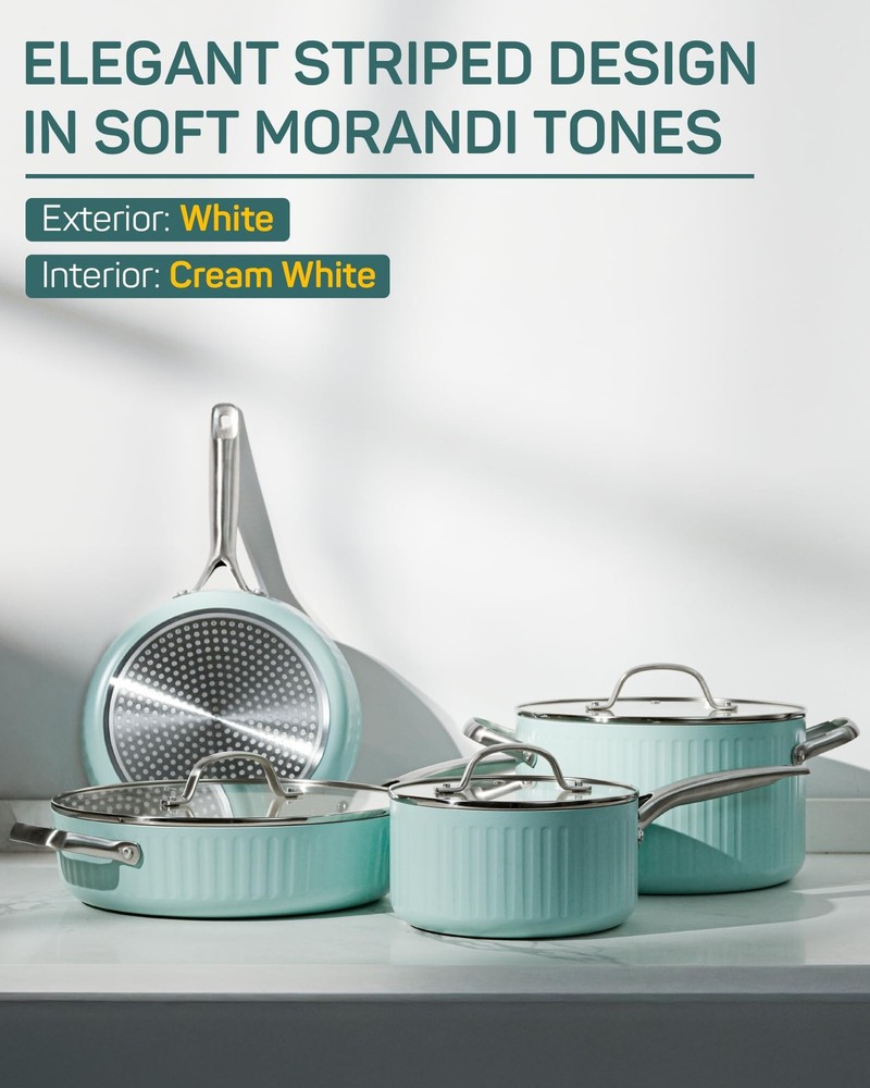 Transform your kitchen with this elegant Green ceramic cookware set that combines style and functionality. The collection features ribbed exterior detailing and includes essential pieces like saucepans, a stockpot, and a versatile sautรฉ pan, all with matching glass lids. The ceramic coating provides excellent non-stick performance while the sturdy stainless steel handles ensure secure handling. The set comes with three matching utensils featuring comfortable wooden handles that complement the cookware's aesthetic. Each piece is designed with a durable construction that distributes heat evenly for consistent cooking results. The sophisticated green finish and modern design make this set a beautiful addition to any kitchen, perfect for both everyday cooking and special occasions. These versatile pots and pans are suitable for various cooking methods and can transition seamlessly from stovetop to table for serving. ใ๐๐น๐ฒ๐ด๐ฎ๐ป๐ ๐จ๐ป๐ถ๐พ๐๐ฒ Striped Design in Soft ๐ ๐ผ๐ฟ๐ฎ๐ป๐ฑ๐ถ ColorsใUpgrade your kitchen with stylish and unique striped ceramic cookware set, available in three serene Morandi tones: cream pink, light green, and light white. Its chic, minimalist design pairs perfectly with our Morandi Dutch ovens, adding a touch of sophistication to your cooking space. It's a ideal gift for your loved ones. ใ๐ก๐ฎ๐๐๐ฟ๐ฎ๐น ๐ก๐ผ๐ป-๐ฆ๐๐ถ๐ฐ๐ธ Ceramic Coating for ๐๐ฒ๐ฎ๐น๐๐ต๐ถ๐ฒ๐ฟ Cookingใcookware set features a natural, non-stick ceramic coating free from harmful chemicals like PFOA and PTFE. Passed Healthy and Safety TรV SรD certification. Enjoy effortless cooking and cleaning while ensuring a healthier, more efficient and eco-friendly kitchen experience for you and your family. ใ๐๐๐ฒ๐ป ๐๐ฒ๐ฎ๐ ๐๐ถ๐๐๐ฟ๐ถ๐ฏ๐๐๐ถ๐ผ๐ป & Compatible with ๐๐น๐น ๐ฆ๐๐ผ๐๐ฒ๐๐ผ๐ฝ๐ใDesigned for even heat distribution, this stainless steel pots and pans set deliver perfect cooking results every time, whether you're using gas, electric, ceramic, or induction stovetops. Itโs designed to work seamlessly with all heat sources, providing consistent performance for all your culinary creations. ใVersatile ๐ญ๐ฌ-๐ฃ๐ถ๐ฒ๐ฐ๐ฒ ๐ฆ๐ฒ๐ with All the EssentialsใThis comprehensive 10-piece set includes everything you need for everyday cooking: 11โ sautรฉ pan with lid, 2qt saucepan with lid, 6qt stock pot with lid, 9.5โ frying pan, Soup ladle, solid turner, slotted turner. Perfect for everyday cooking tasks, from sautรฉing to simmering to frying. ใOven Safe for Versatile CookingใTake your culinary creativity to the next level with oven-safe cookware (up to ๐ฑ๐ฌ๐ฌยฐ๐, lids up to 350ยฐF). Seamlessly transition from stovetop to oven for baking, roasting, or finishing dishesโall with one versatile set.