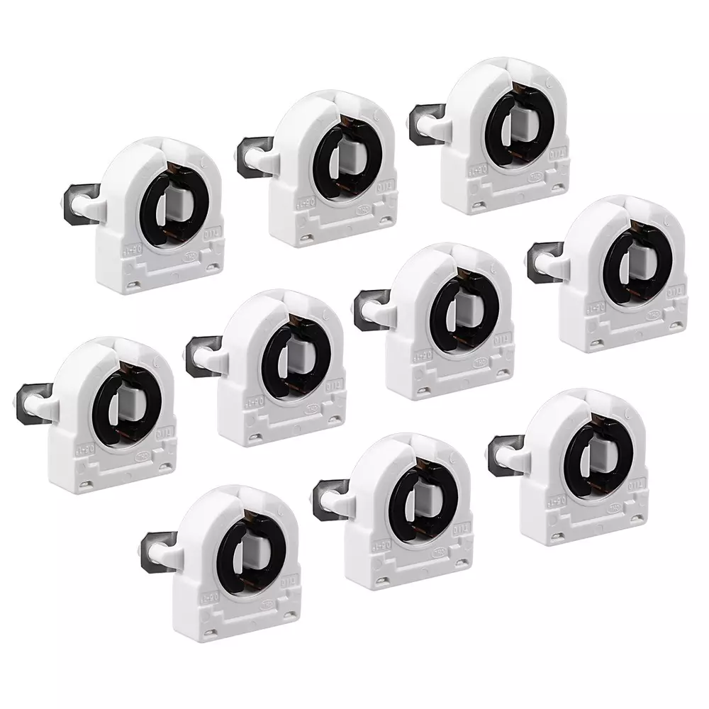 Product Description T8 Lamp Holder √ Durable and long-lasting. √ A perfect choice to replace old and damaged lamp holder. √ Work great for Bi-Pin fluorescent or LED lighting retrofit projects. Specification Index Maximum Voltage: AC 500V Maximum Current: 2A Type: Tombstone, Single Head Fit Fluorescent or LED Tube Size: T8 T10 T12 Mounting Method: Push Through Mount (Snap-In) Package Includes NO Wires Heat Resistant This T8 lamp holder is made from high-quality heat resistant material. Easy to Use Simply push rigid solid and stranded conductors into without using any tools. The spring contracts hold the wires firmly that once it clamps the wires, they can hardly loose. Steps to Replace a Tombstone Light Holder in a Light Fixture Step 1: Turn off the circuit breaker and the wall switch that operates the fluorescent fixture. Step 2: Remove the cover from the fixture and twist the fluorescent/LED tubes to release them from the light holder and carefully set the tubes aside. Step 3: Make sure that there is completely no electrical current in the fixture by holding a noncontact voltage detector. Step 4: Remove the screw or pull the damaged tombstone from the end of the fixture. Step 5: Pull out the wires from the tension spring contracts. You can insert a straightened paper clip or a screwdriver into the wire hole to open the spring contracts. Step 6: Connect the new tombstone light holders to the end of the light fixture. Garage / Underground Parking / Basement Home / Office / Lighting Retrofit Shop Light