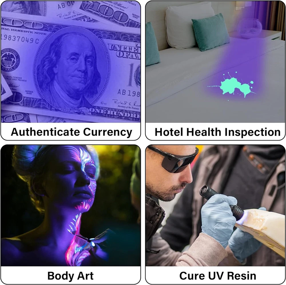 10Pcs UV Ultraviolet Light 51 LED Flashlight Black Light 395nM Inspection Lamp ‼️‼️【Note】 3*AA Batteries not included. Features: 1. Use 3 AA Standard Alkaline Battery (Not Included) , Rechargeable batteries are not recommended (Size and Voltage is not compatible)! 2. Ensuring that you have a sufficient quantity for your needs; Ideal to stock up or ideal as a gift for your loved ones, especially for those who enjoy outdoor pursuits or need a UV light for both personal and professional use. 3. Broad Coverage : emitting a strong light with a wavelength of 395 nm, larger area than 9, 21 LED lights. the UV resin flashlight can cover a large area without reduction in the intensity of light; Whether you are scanning for pet stains or exploring the natural world in darker places, you can rely on this flashlight to do the job right. 4. Material and Construction : made mainly with an aluminum alloy, the UV flashlight for resin is sturdy; The surface bears a wear resistant, non slip texture grip that is waterproof and dust resistant to ensure that it lasts longer; It's crafted in a black color, and its compact size of about 5.66 x 2.22 x 1.37 inches, to adds to its usefulness. 5. Portable and Convenient : the blacklight for cat urine detection is designed to fit easily into a pocket and comes with a wristband for secure and comfortable carrying; Being lightweight, it can also be stored safely in a bag or backpack, offering you convenience on the go. 6. Multipurpose UV Flashlight : this UV flashlight is not only a pet cleaning tool for detecting pet urine stains on rugs, carpets, and clothes, but it also serves as a black light detector for scorpions, minerals, bugs, stains and fake currency; Suitable for outdoor use and serves as a nice tool for identifying currency, ID cards and more. 7. Tips: the 51 UV light LEDs have a lifespan of 15 years,To extend the flashlight’s life, please remove all batteries if you did not intend to use it for a long time. 8. Improper use or installation of poor quality batteries may cause product hazards that can affect our safety. We recommend the use of reliable high quality Alkaline batteries. Use of rechargeable or other non-recommended batteries VOIDS the manufacturer warranties. Specification: Color: Black Material: Aluminum with O rings for water resistance Size: 5.7 cm x 14.5 cm (DxH) 5.66" inches long & 2.22" inches across lamp Bulb Type: 395-400nm Bulb Life: 100,000 Hours Power Output: 5W Battery Required: 3 x AA Alkaline Battery (Not Included). Battery Life: Approximately 20 hours on 3 AA batteries Switch Type: Click on / Click off Package include: 10 X UV Ultraviolet LED Flashlight Blacklight (without battery) On Jan 21, 2025 at 21:39:57 PST, seller added the following information: