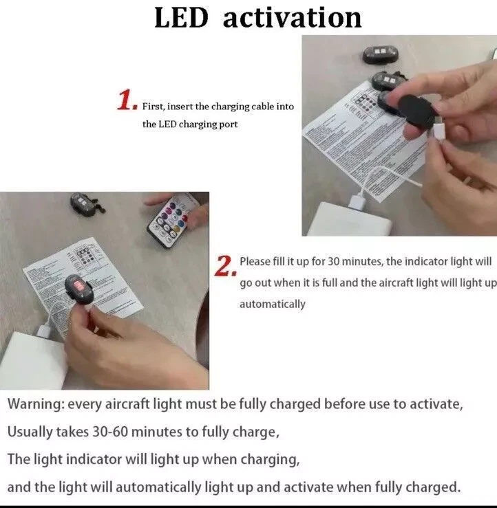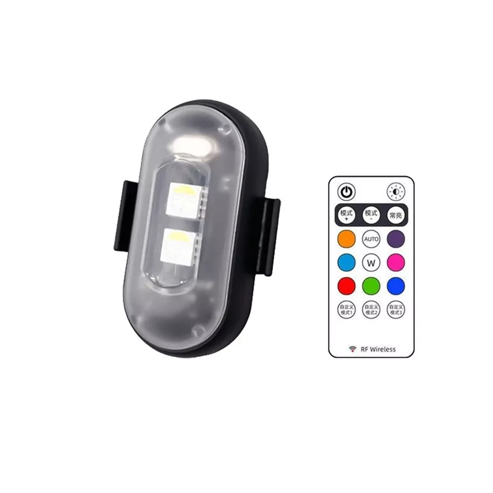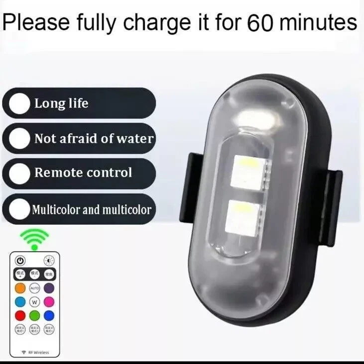RGB Led Aircraft Strobe Lights Motorcycle Lights LED Flash Position Wireless Light Aircraft Airplane Helicopter Warning Lights Features: 7 kinds of lighting colors: white, red, green, blue, yellow, purple, sky blue. Long (2 seconds) to the machine, short to adjust the mode. MultipleModes for your choose: Seven-color fast flashing, seven-color slow flashing, seven-color mode, seven-color always-on, aviation mode, cycle mode, etc. Thirty modes with memory function. Using high-quality high-brightness multi-color wicks, high-brightness lamp beads enhance driving warnings, and are not afraid rear-end collisions High light lamp beads,better for warning function,super bright even at daytime. Widly applications,suitable for drones, traversing aircraft, fixed-wing, helicopters, motorcycles, etc. Product Description: RGB Led Aircraft Strobe lights Motorcycle Lights LED Flash Position Wireless Light Aircraft Airplane Helicopter Warning Lights Material: Plastic Color: as the picture shows, (Due to the difference between different monitors, the picture may have slight color difference. please make sure you do not mind before ordering, Thank you!) Package incldues: 10 LED Strobe Light 1 x Remote Control