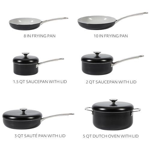 Return Policy Fast Delivery Trusted seller Kitchen Essentials Potluck Porch 10 Piece PFA Free Ceramic Non stick Interior Forged Aluminum Cookware Pots and Pans Set W/Aluminum Lids - Black - Induction Compatible Product Description WHAT'S IN THE BOX: two frying pans (8 inches and 10 inches), two saucepans with lids (1.5 quarts and 2 quarts), one 3-quart sauté pan with lid and one 5-quart Dutch oven with lid HAPPINESS IS HOMEMADE: Kitchen Essentials is all about making and sharing good food at home together. from preparing the freshest ingredients to the beautiful mess of cooking a family recipe, we encourage you to roll up your sleeves, mix up a happy kitchen, and set the table for free-flowing conversations over an easy, generous, and crowd-pleg meal. CERAMIC NONSTICK COOKWARE: easy-release interior makes more room for healthier cooking options and less time for cleanup. HEAVY-GAUGE ALUMINUM COOKWARE: durable aluminum pots and pans cook evenly to serve happy and homemade meals every day. they feature a rounder and wider shape, similar to a traditional caldero, to faciliate smooth and easy stirring. INDUCTION-FRIENDLY: works on induction, gas, electric, halogen, ceramic and glass stoves Shipping Returns Payment Shipping Shipping is FREE to all addresses other than APO/PO boxes in the lower 48 states. All our stock ships from US-based warehouses. Shipped via USPS or UPS (depending on location and package weight) Unless stated otherwise, all orders will ship within 24-72 hours of your payment being processed. Check our feedback to see the great reviews of FAST shipping we offer. Returns Seller does not accept returns Payment We currently accept payment via eBay managed payments only. Once payment is cleared, we will dispatch your shipment within 1-3 business days. Please refer to the "Shipping" tab for more information regarding shipping speed to your destination.