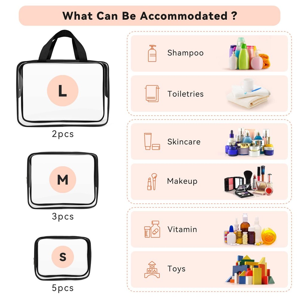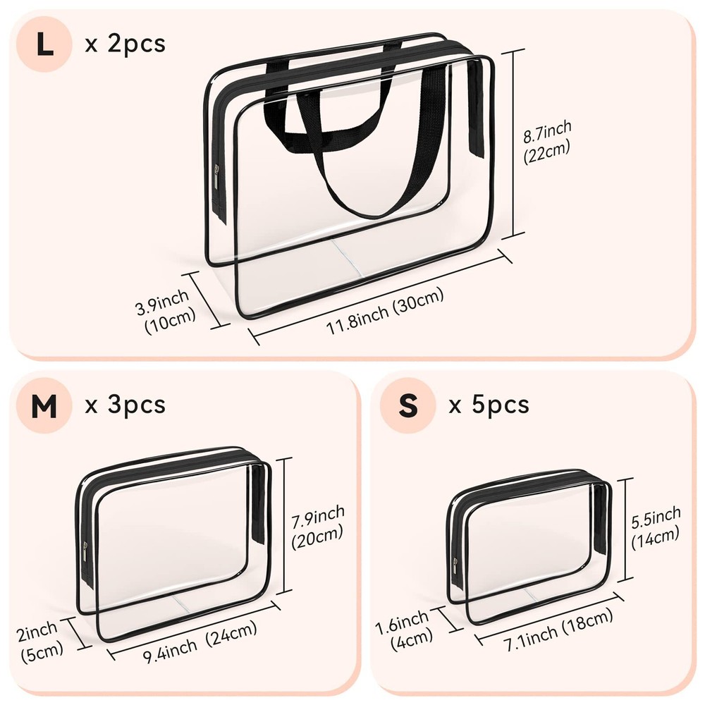 TISRATOK 10 PCS Clear Travel Makeup Toiletry Bag, Plastic PVC Cosmetic TSA Approved Organizer Kit with Zipper Handbag(Black) 【10 Pieces 3 Diffrent Sizes】2 x Large clear handbag,11.8" x 3.9" x 8.6";3 x Medium clear toiletry bag,9.4" x 1.9" x 7.8";5 x Small clear cosmetic bag,7" x 1.5" x 5.5". The clear travel bags perfect for cosmetics, toiletries, baby items, shaving kit, electronic devices, perfume, sunglasses, lipstick, facial cleanser, passport and so on. 【TSA Approved】 The TSA approved clear bag strictly follow 3-1-1 liquid regulations, you won't have to worry pass through airport security. Waterproof PVC material makes it easier to clean, durable and scratch-resistant, and any stains on it can be easily wiped off with a towel. 【Stay Organized & Portable】Reduce mess with these small to large-sized transparent zipper bags, perfect for travel sunscreen beach accessories for toiletries, clear bag for medicine, clear hanging shower bag for sundries etc. The transparent PVC material and the big top opening allows you to make it easy to find what you are looking for without wasting time. 【Waterproof& Reinforced Zipper】The surface is waterproof and reinforced seams prevent the bag splitting easily which is glided smoothly. Double stitching throughout allow you to really load these up with carrying handles. The handle straps offer more convenience while using. (zipper is not waterproof). 【Perfect Gift Choice】You will get multiple sizes and styles toiletry bags totally in one package, enough quantity for your use, and share them with your families, friends. This travel clear purse tote storage bag is a perfect choice for your family, friends, or colleague who is always on a business trip or travel. SHIPPING Domestic Buyers - We have confidence in our products, but if you are not fully satisfied please contact us within 30 days of purchase and you will get full refund. - We ship within 3 business days of payment, usually sooner - We offer FREE shipping on all orders! - We only ship to the lower 48 states, no APO/FPO addresses or PO Boxes allowed International buyers – please note: Import duties, taxes, and charges aren't included in the item price or postage cost. These charges are the buyer's responsibility. - Please check with your country's customs office to determine what these additional costs will be prior to bidding or buying. * Order Cancellation Policy ** You can return a product for up to 30 days from the date you purchased it. 1. The seller reserves the right to cancel the special case only due to eBay cancellation fee. 2. The decision of seller is the final. 3. The seller will respond to the cancellation request within 2 business days. Please wait for the result of cancellation. 4. In case the cancellation is not completed by some reasons, the buyer can follow the options below to get the refund. 4.1 The buyer can reject the item when it arrives. 4.2 The buyer can send the item back to the seller within 30 days If the buyer receives item (USA Shipment ONLY). The seller will provide the FREE return label to the buyer when the buyer opens " Return Item" case on eBay by using the reason as "Change my mind" ONLY. 5. When buyer has placed the order. The order will be processed and completed by automatic warehouse system within 5 minutes. In case that buyer sends the cancellation request after 5 minutes of placing the order, the request will be rejected. **Sending direct message to cancel the order is not allowed for every case.* Return Policy For the return case - If buyer would like to return the items for refund or replacement, please CONTACT SELLER to receive the free return label from seller. The refund or replacement will be processed with the tracking number of return label which is provided by seller only. The other ways of return which are not approved by seller will not be processed for the refund or replacement.