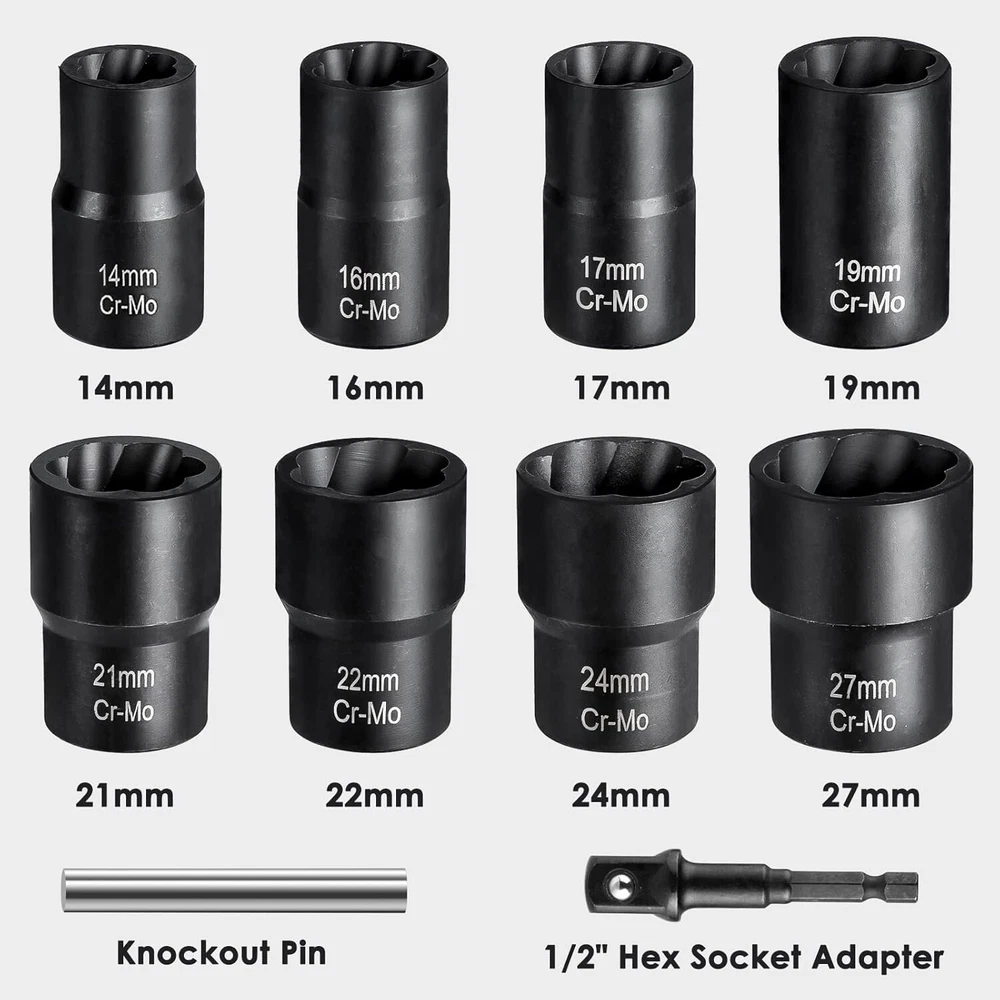 Each bolt extractor is made of high hardness chrome-molybdenum steel with black phosphate process for superior durability and longer life. It will easily extract damaged bolts, nuts, and screws, even if they are stripped, rusted, or frozen. The internal thread with reverse spiral flutes is designed to bite down to provide maximum gripping power, the more you turn, the tighter the socket grips. Standard 1/2-inch drive to and hex adapter for hand tools, air, or power tools. The knockout pin for easier removal. 10 pieces 1/2 inch drive impact bolt & nut remover comes with 27mm, 24mm, 22mm, 21mm, 19mm, 17mm, 16mm, 14mm, hex adapter, and a knockout pin. Heavy-duty blow-molded case lets all the bolt removers stay organized and take your set on the go.